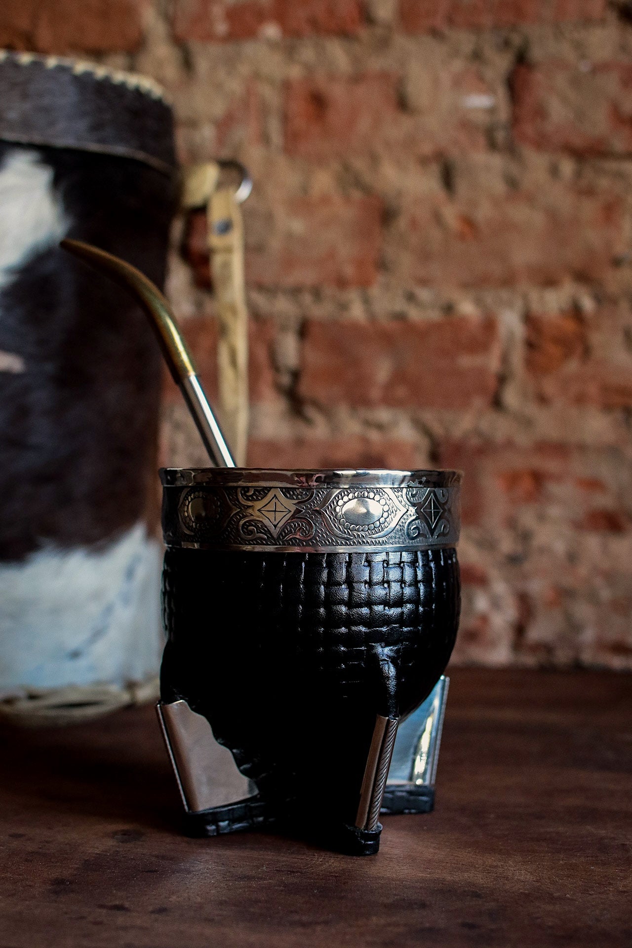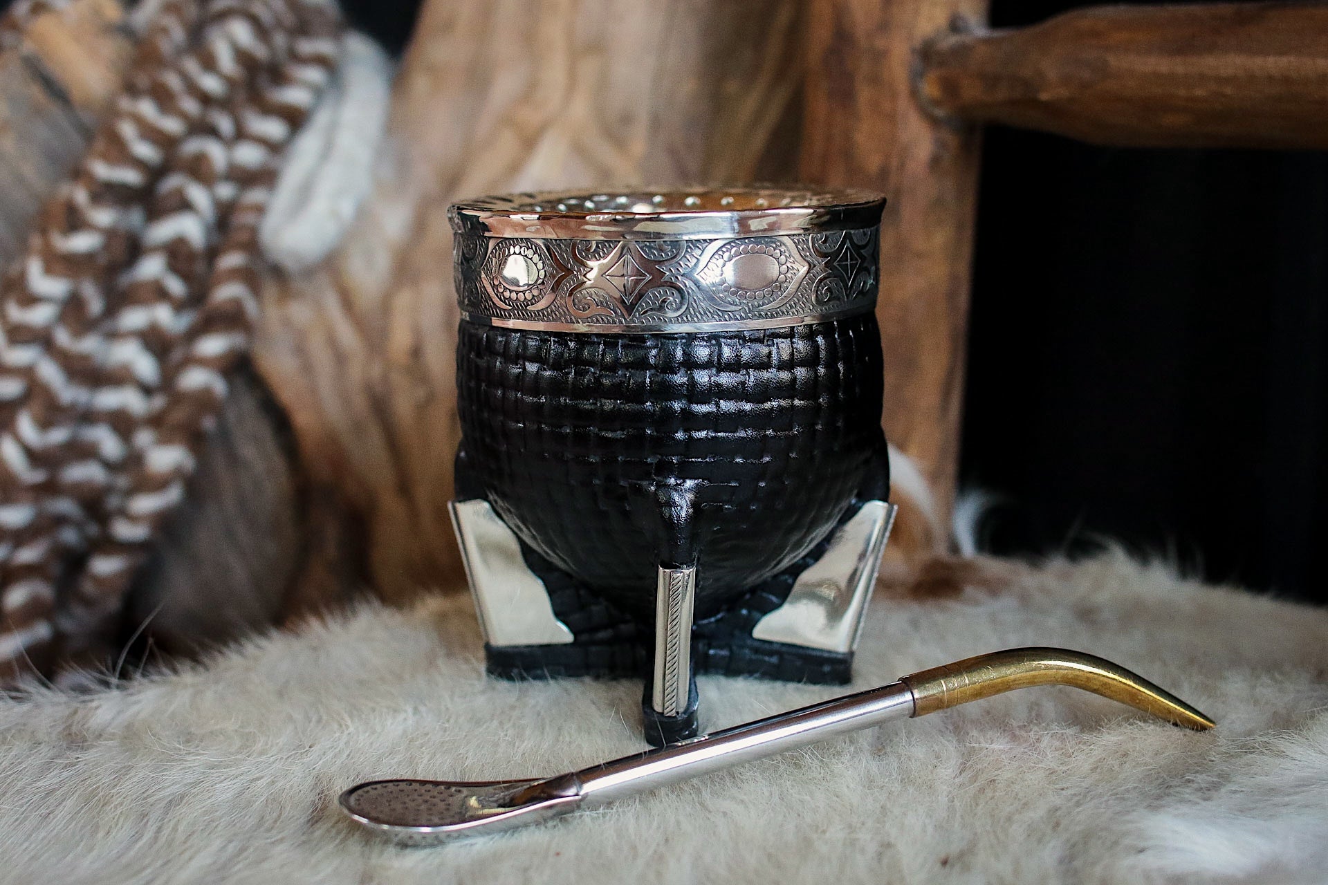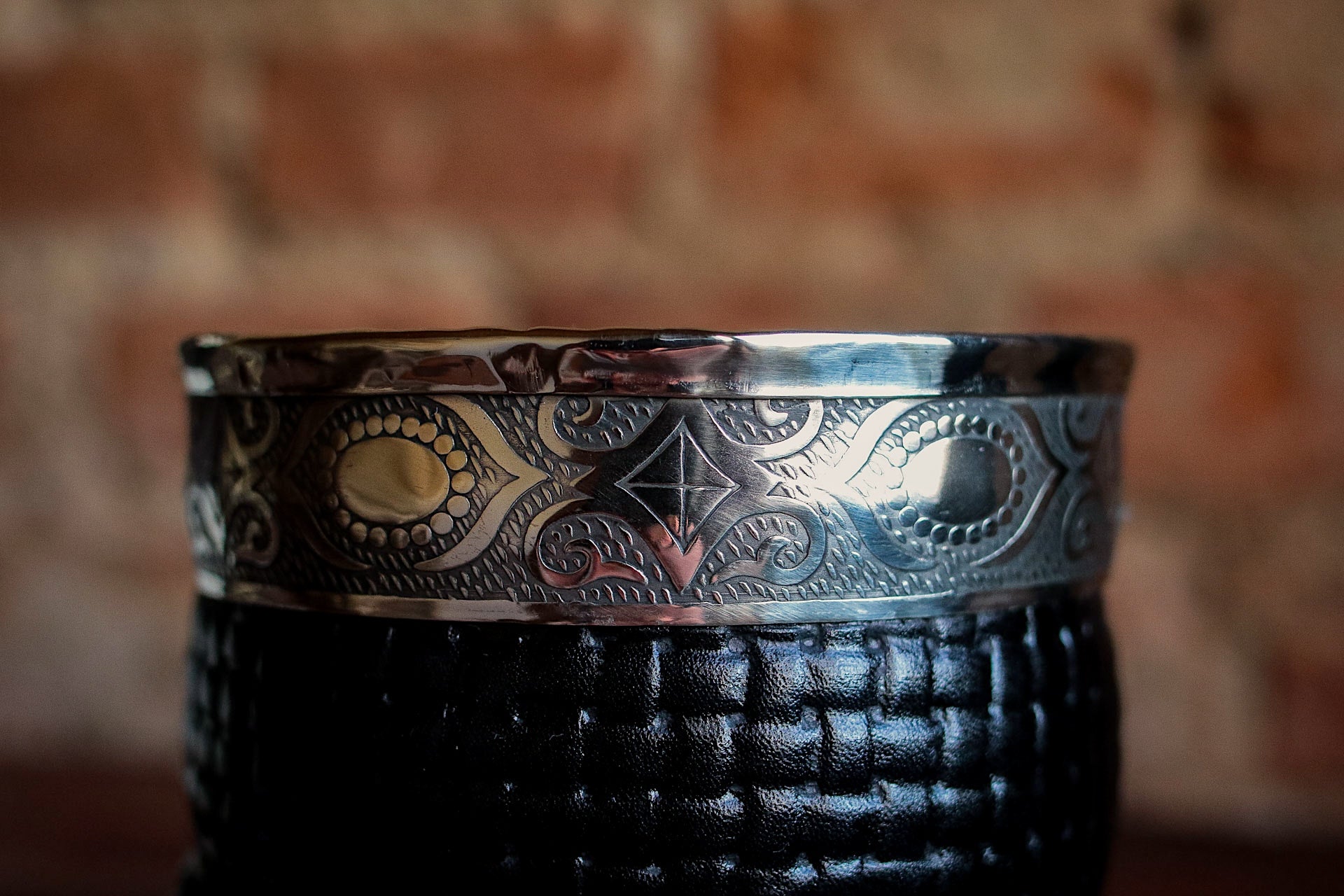 Mate imperial de porongo forrado artesanalmente en cuero natural repujado a mano.