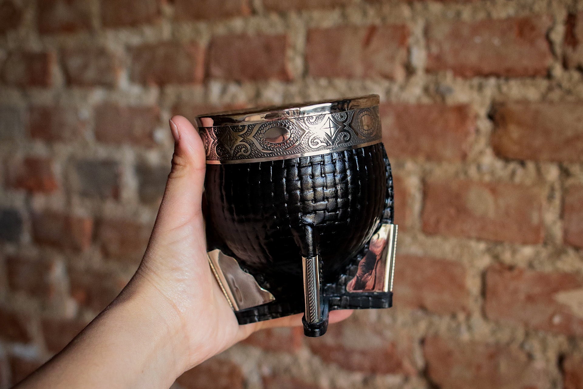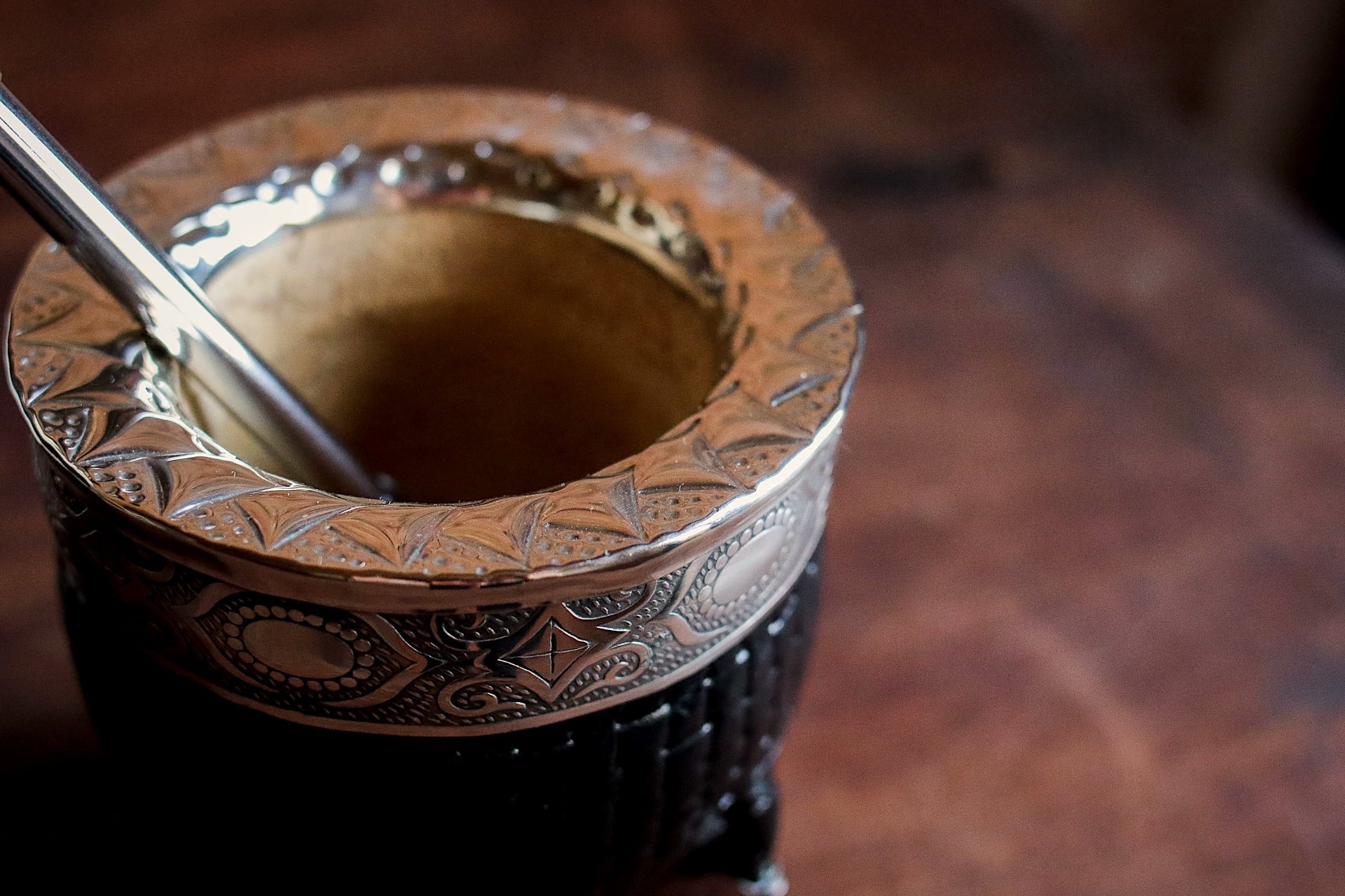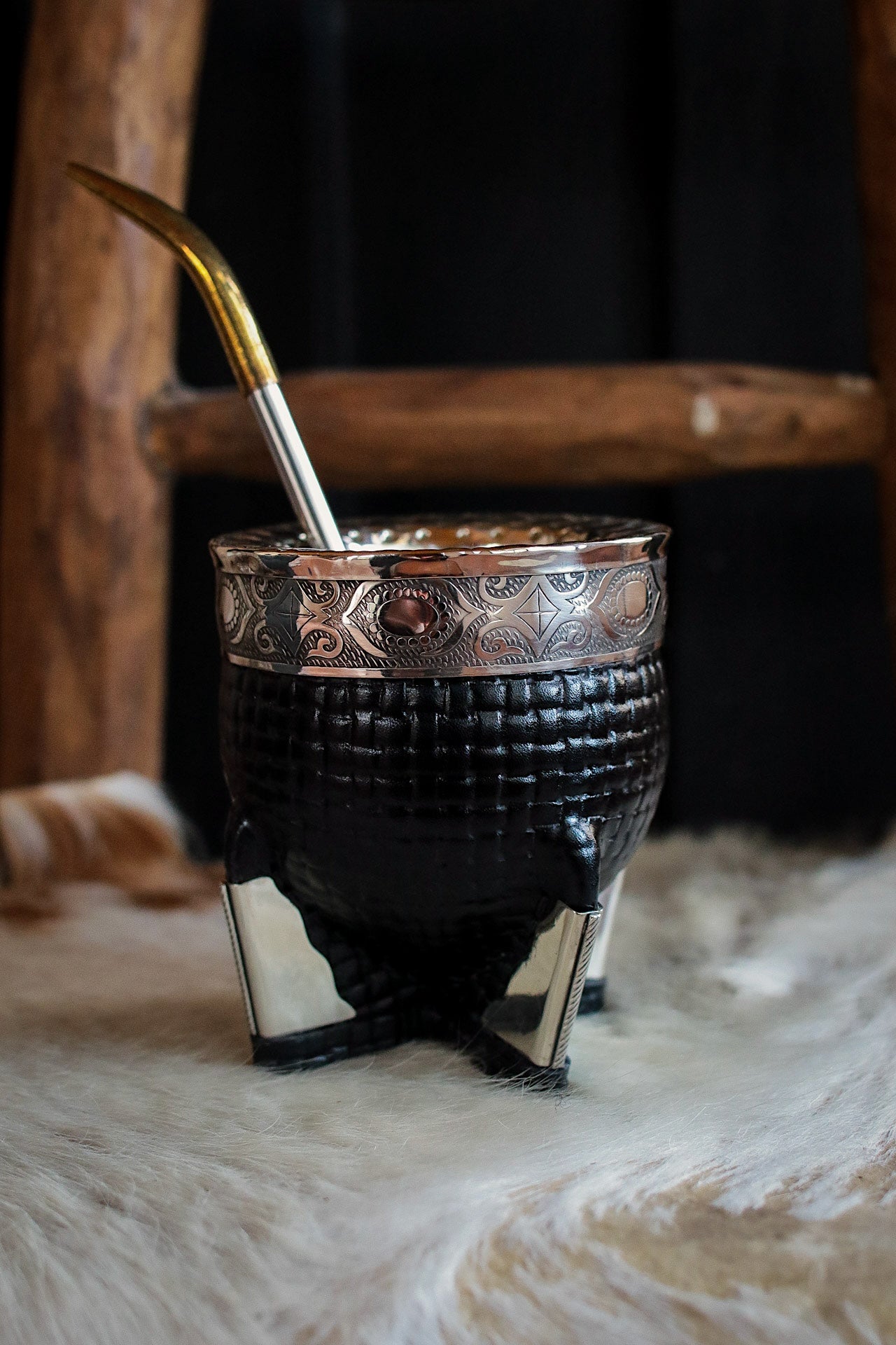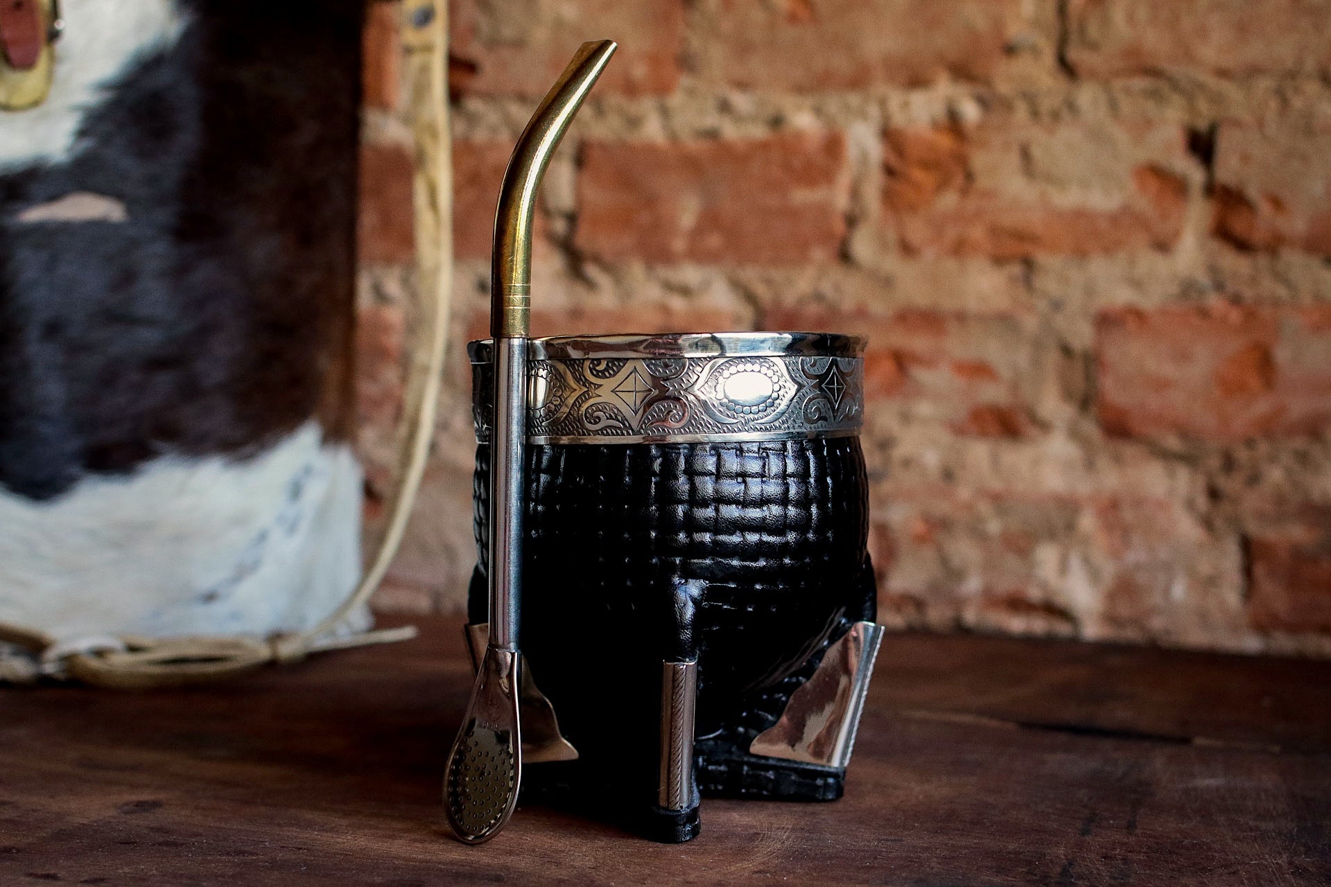 Mate imperial de porongo forrado artesanalmente en cuero natural repujado a mano.