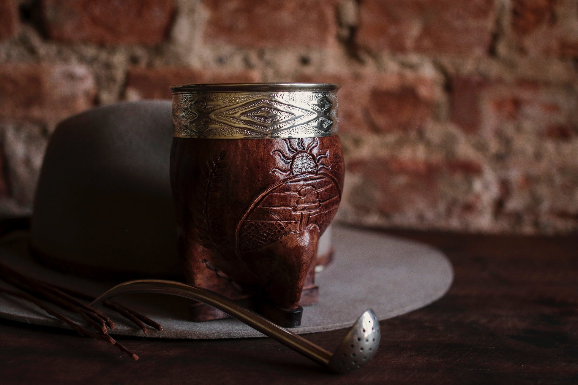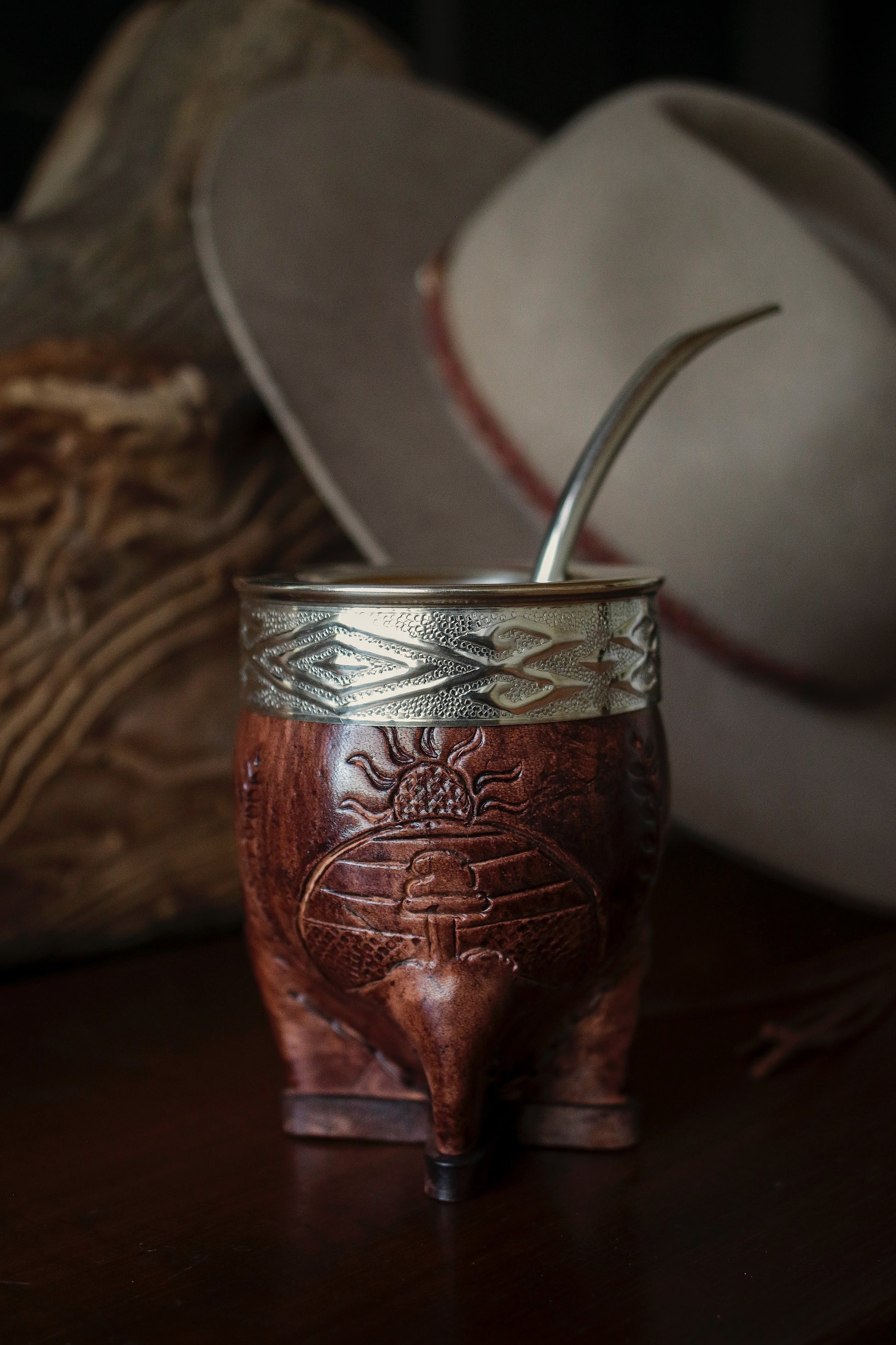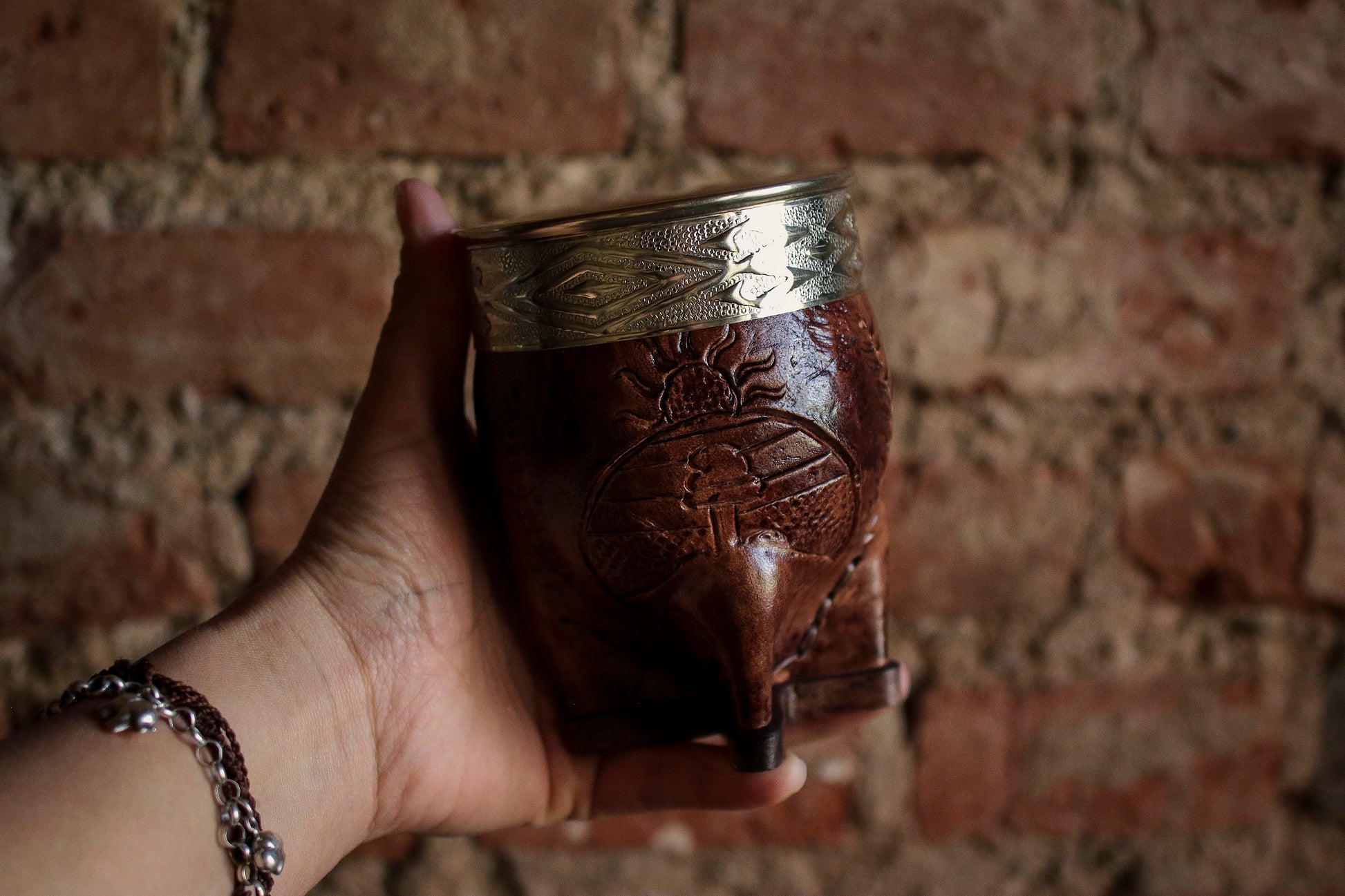 El cincelado en virola es a mano con Alpaca. El cuero está repujado artesanalmente con el escudo nacional argentino