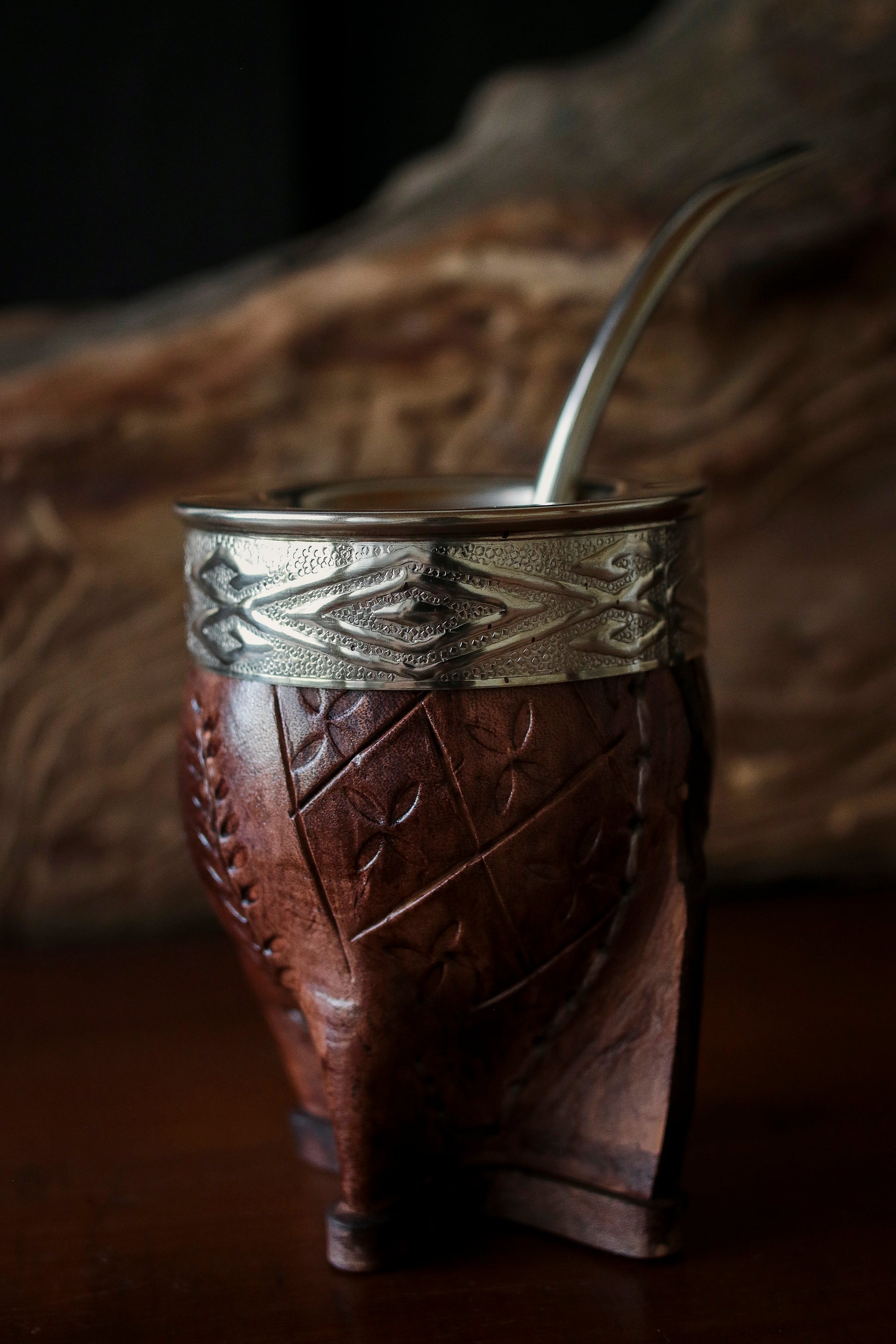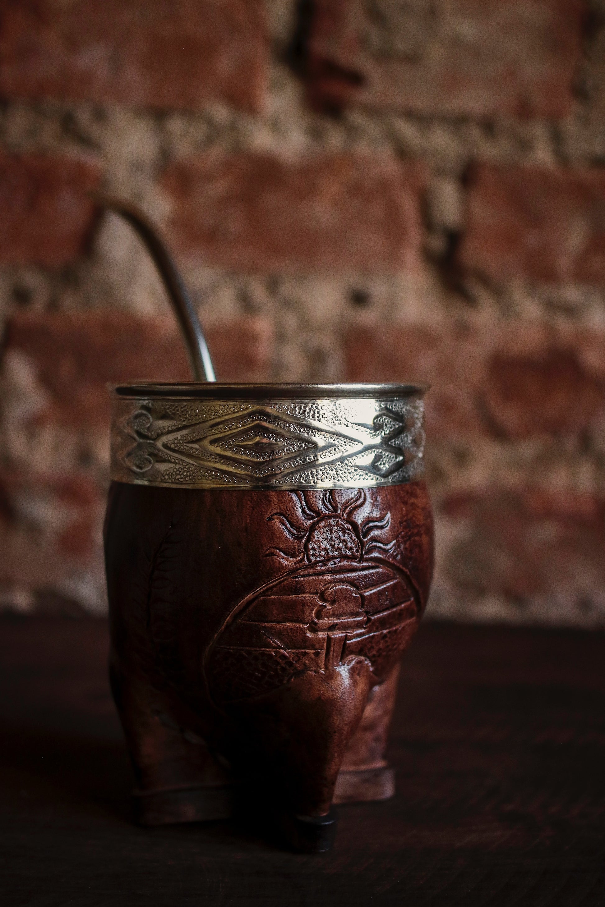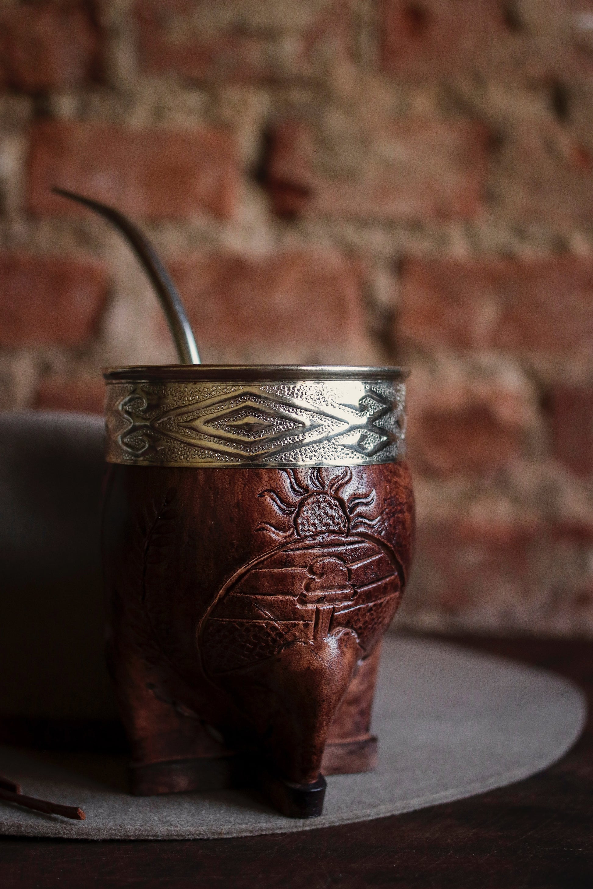 El cincelado en virola es a mano con Alpaca. El cuero está repujado artesanalmente con el escudo nacional argentino