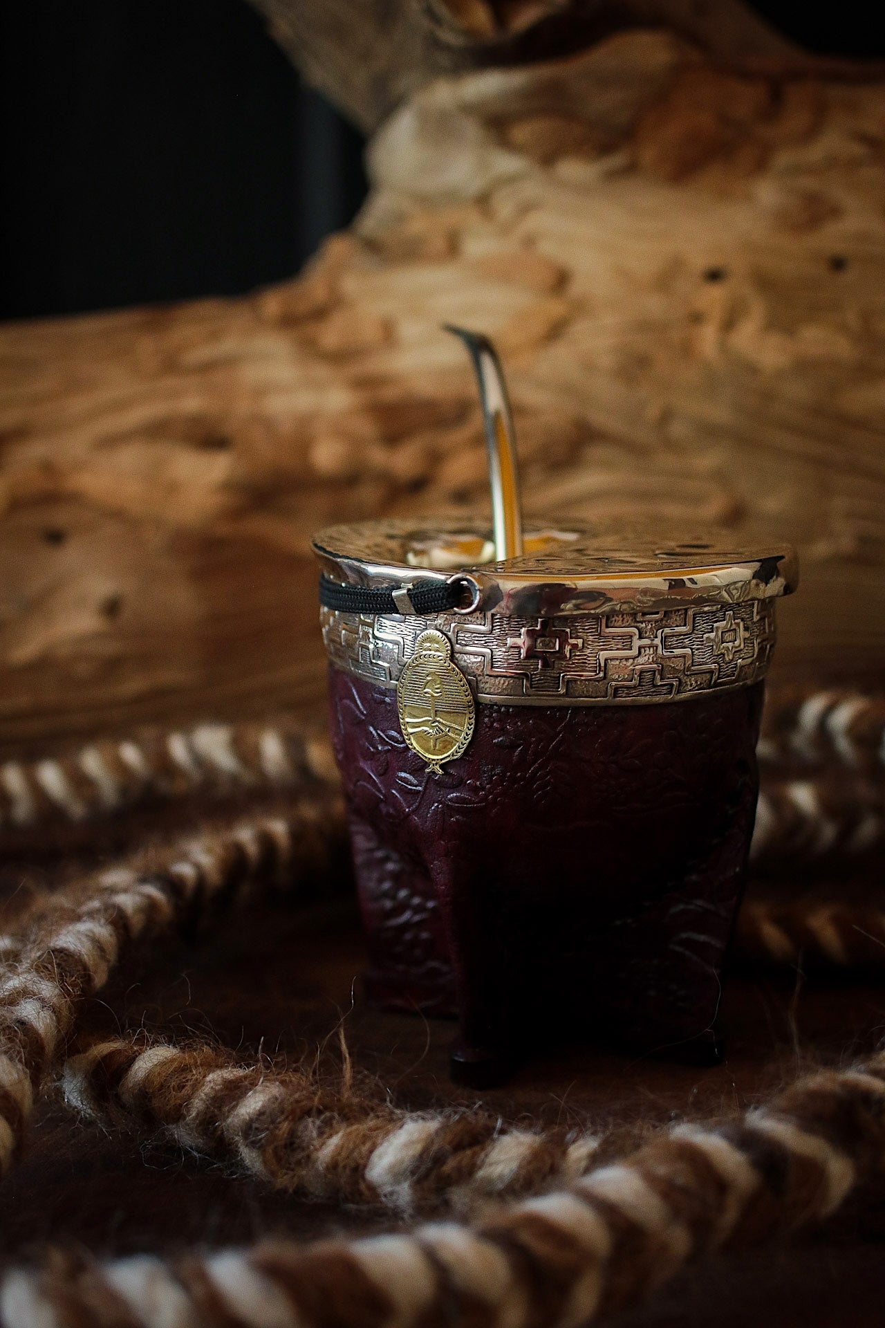 Mate imperial de porongo forrado artesanalmente en cuero natural con matepa de alpaca