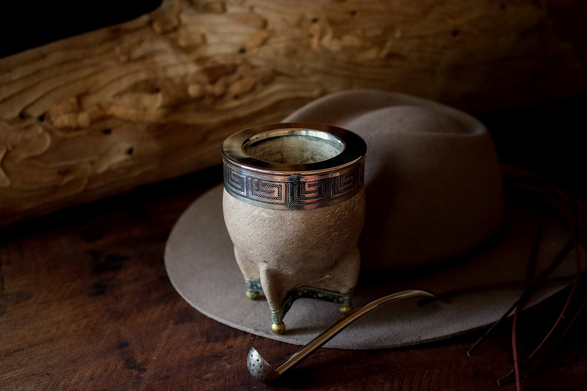 Mate de porongo forrado artesanalmente en cuero crudo natural.