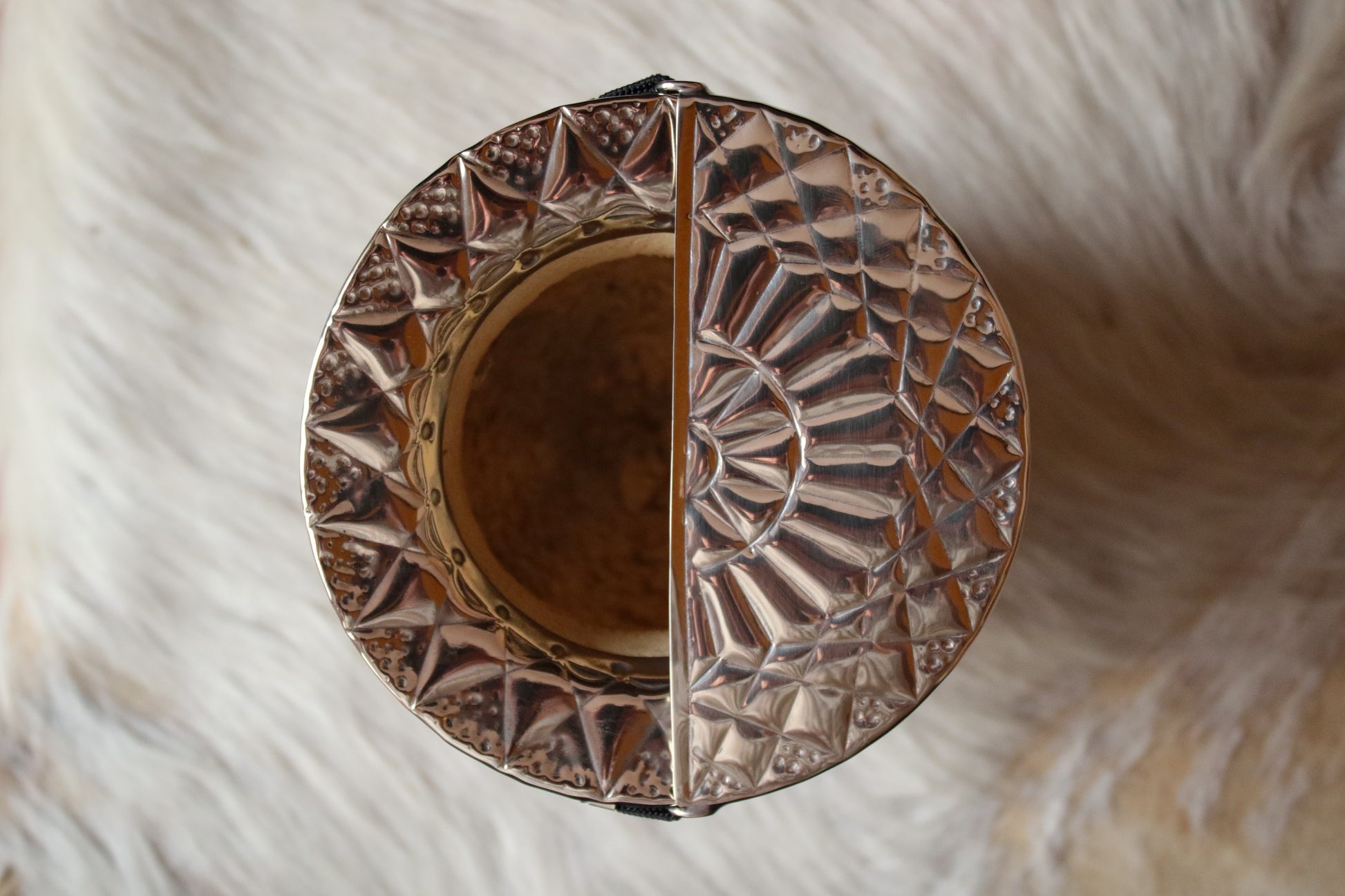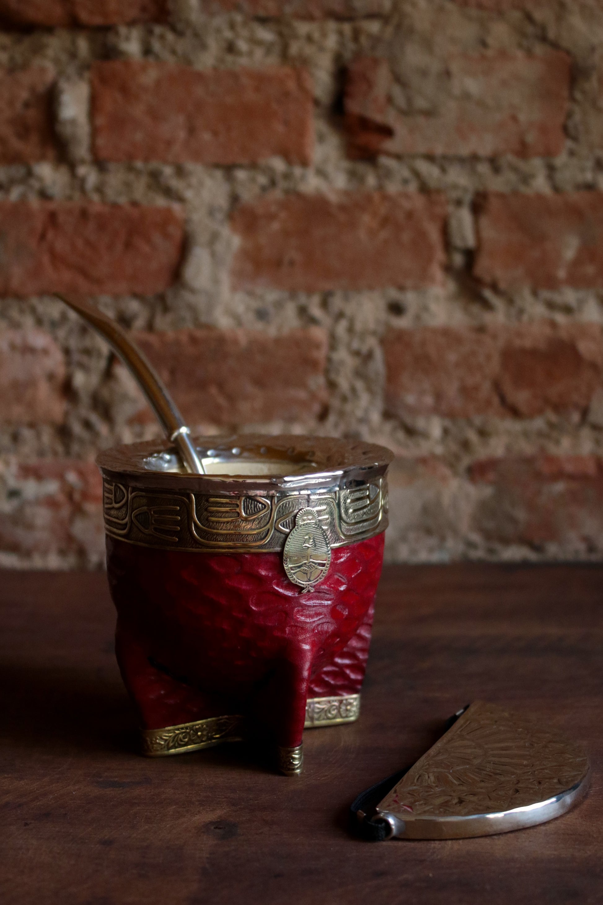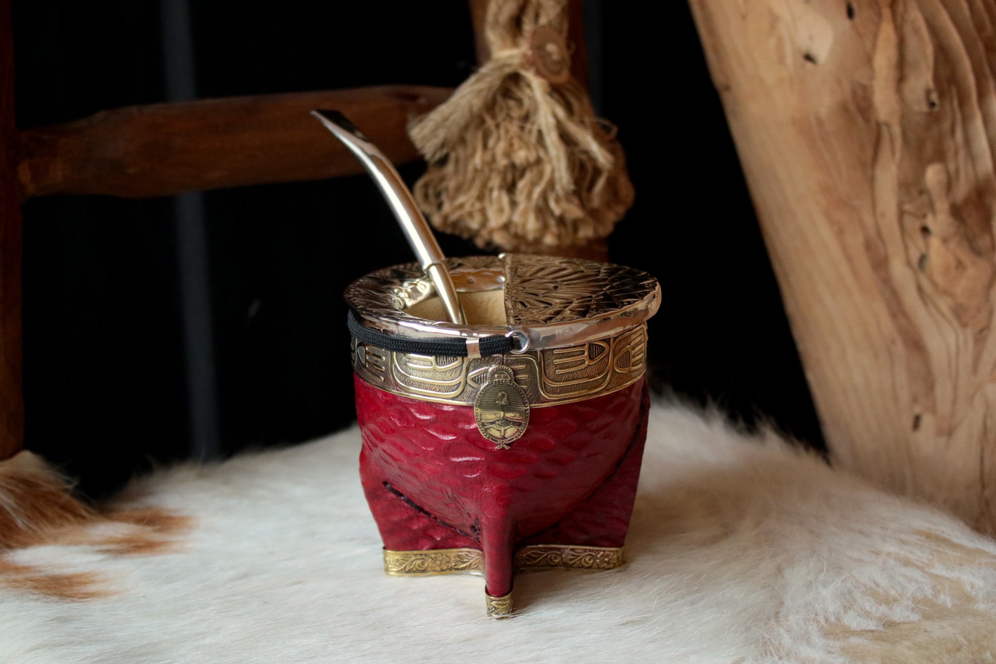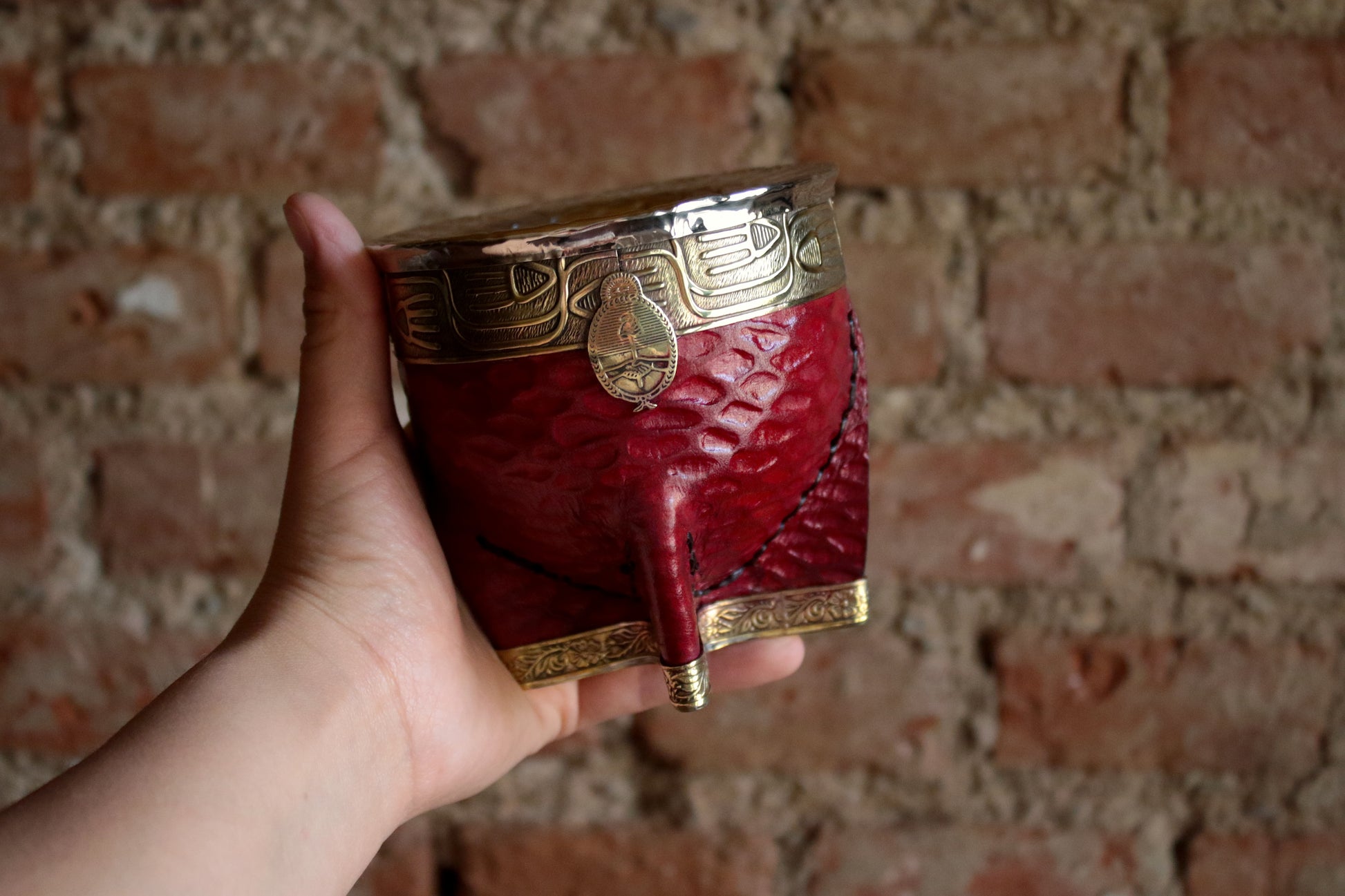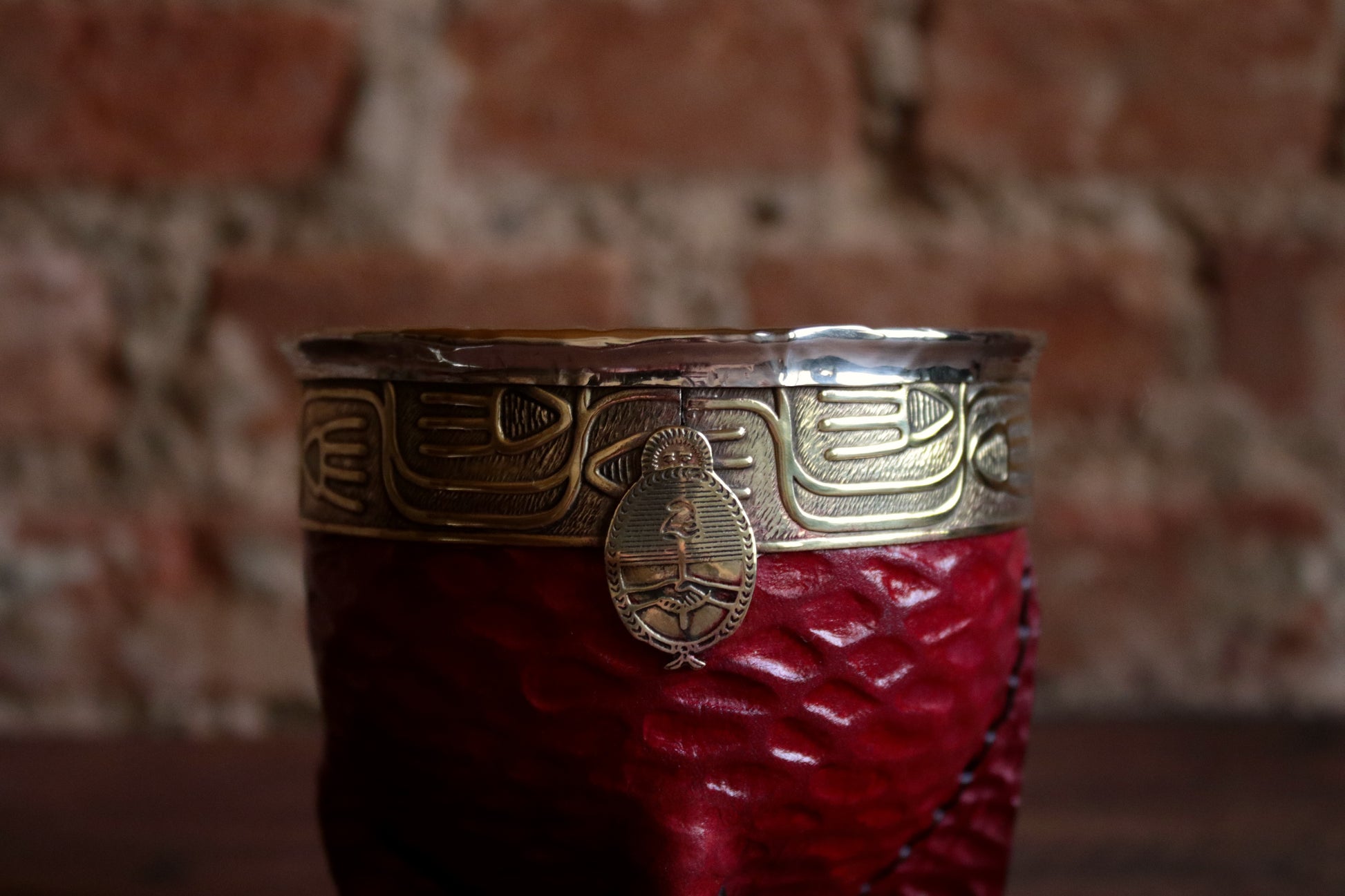 Mate imperial de porongo forrado artesanalmente en cuero natural con matepa de alpaca