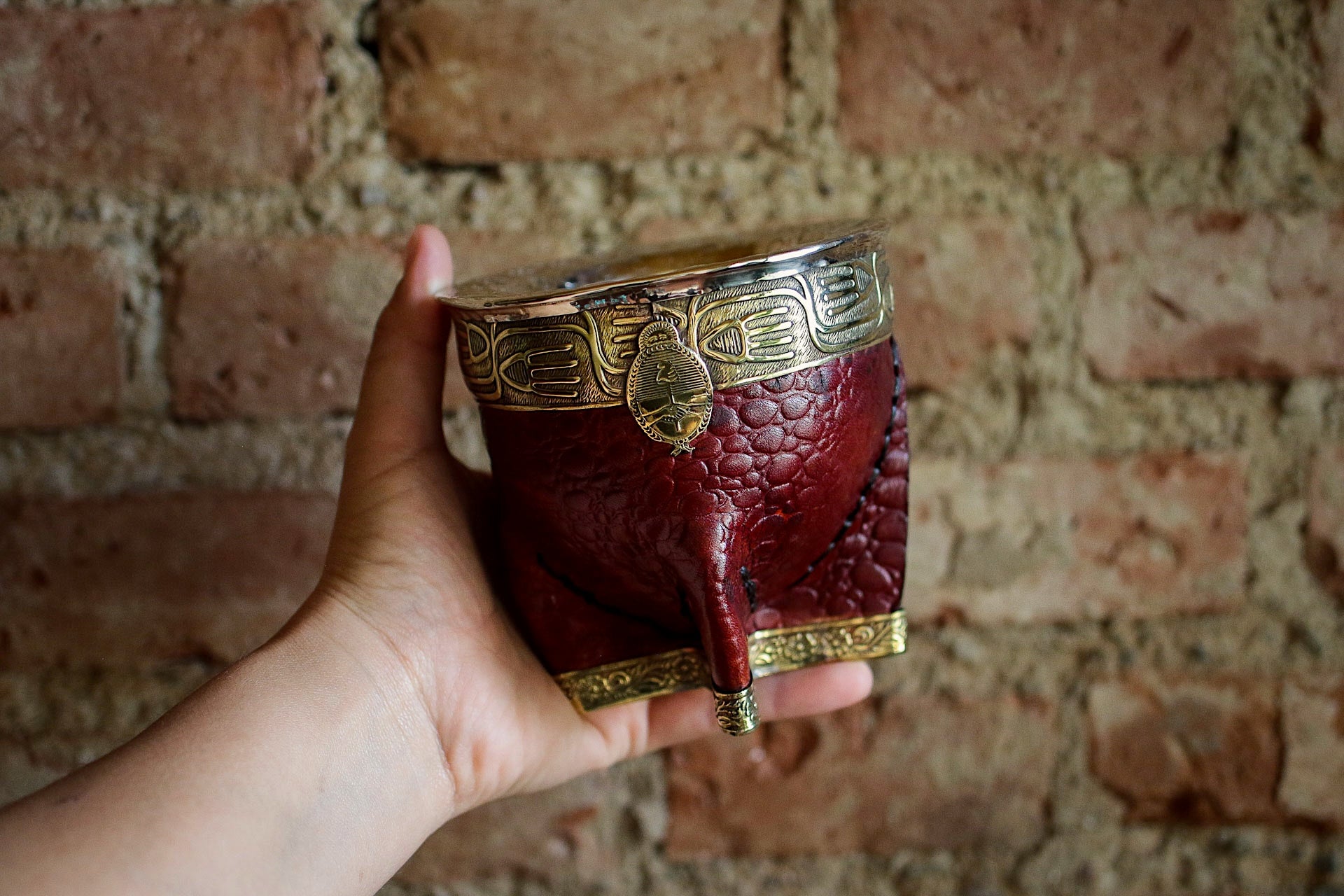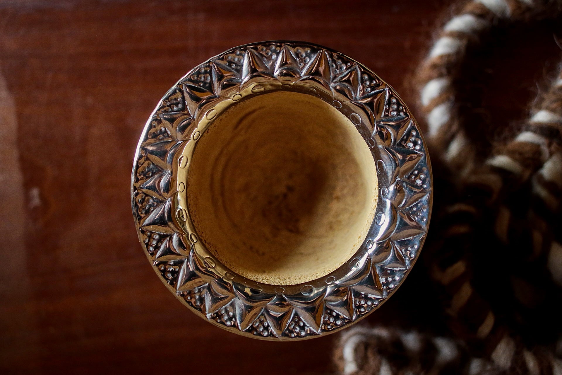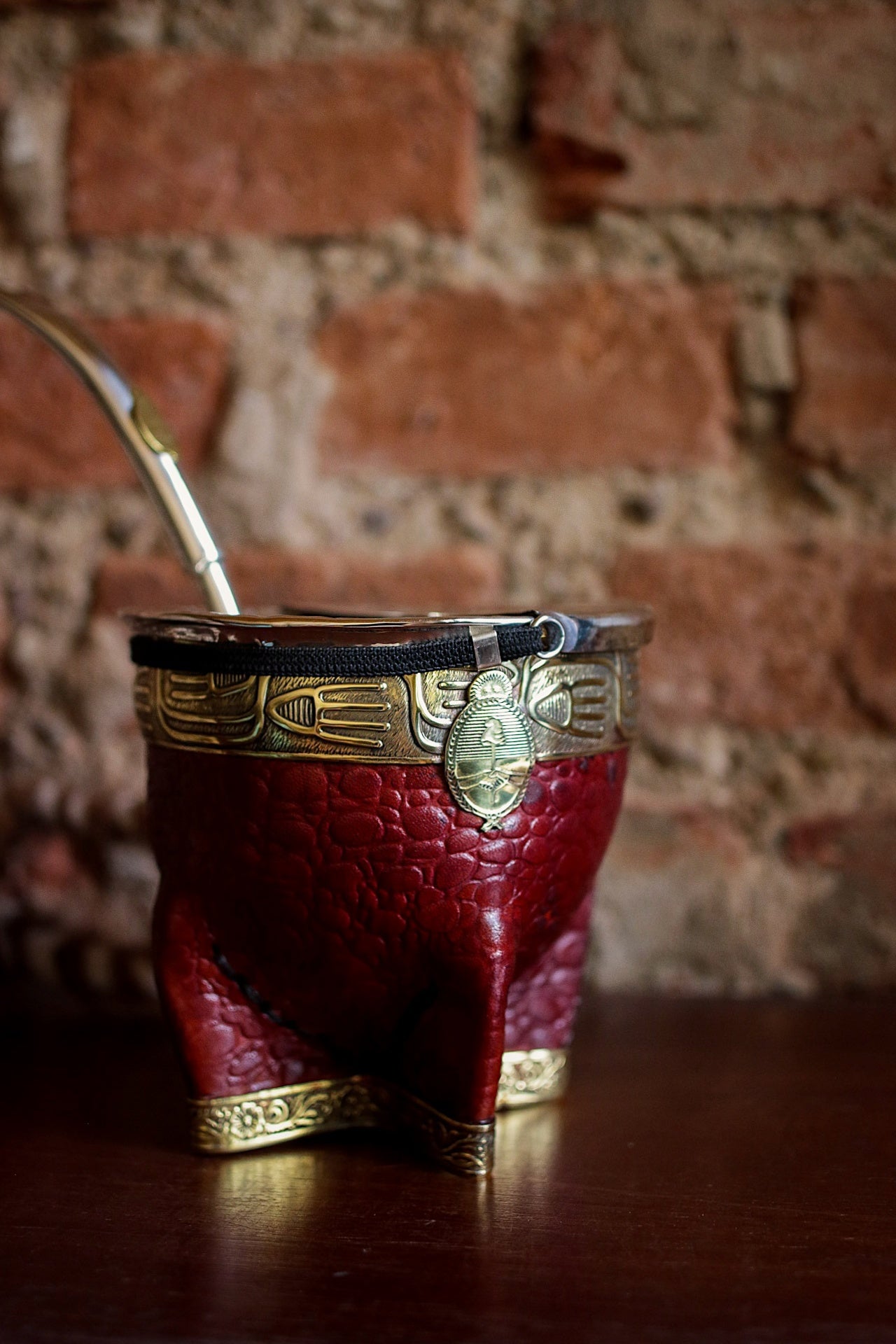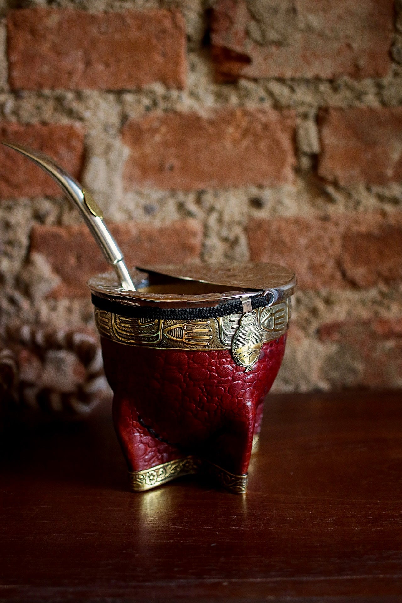Mate imperial de porongo forrado artesanalmente en cuero natural con matepa de alpaca