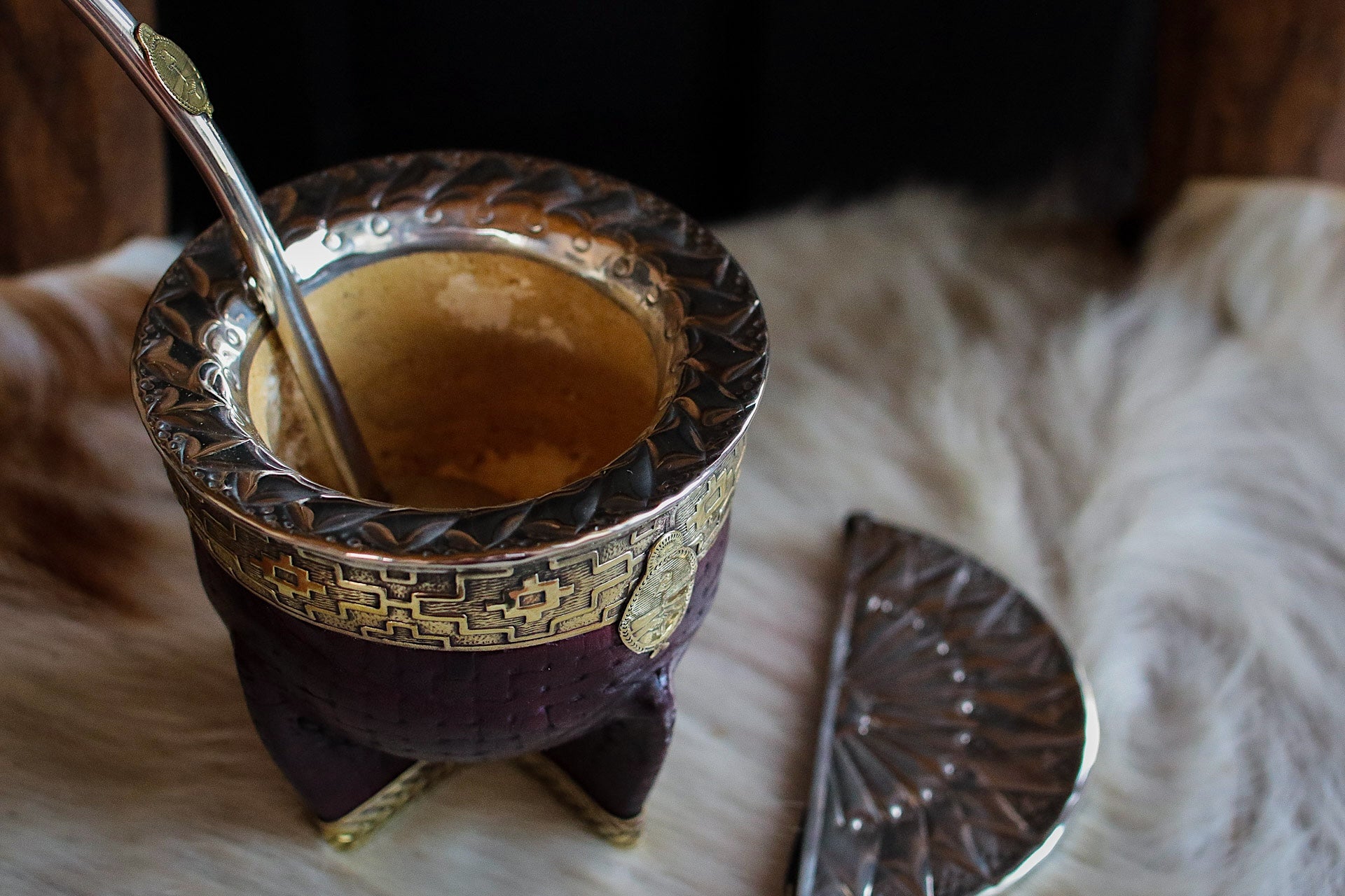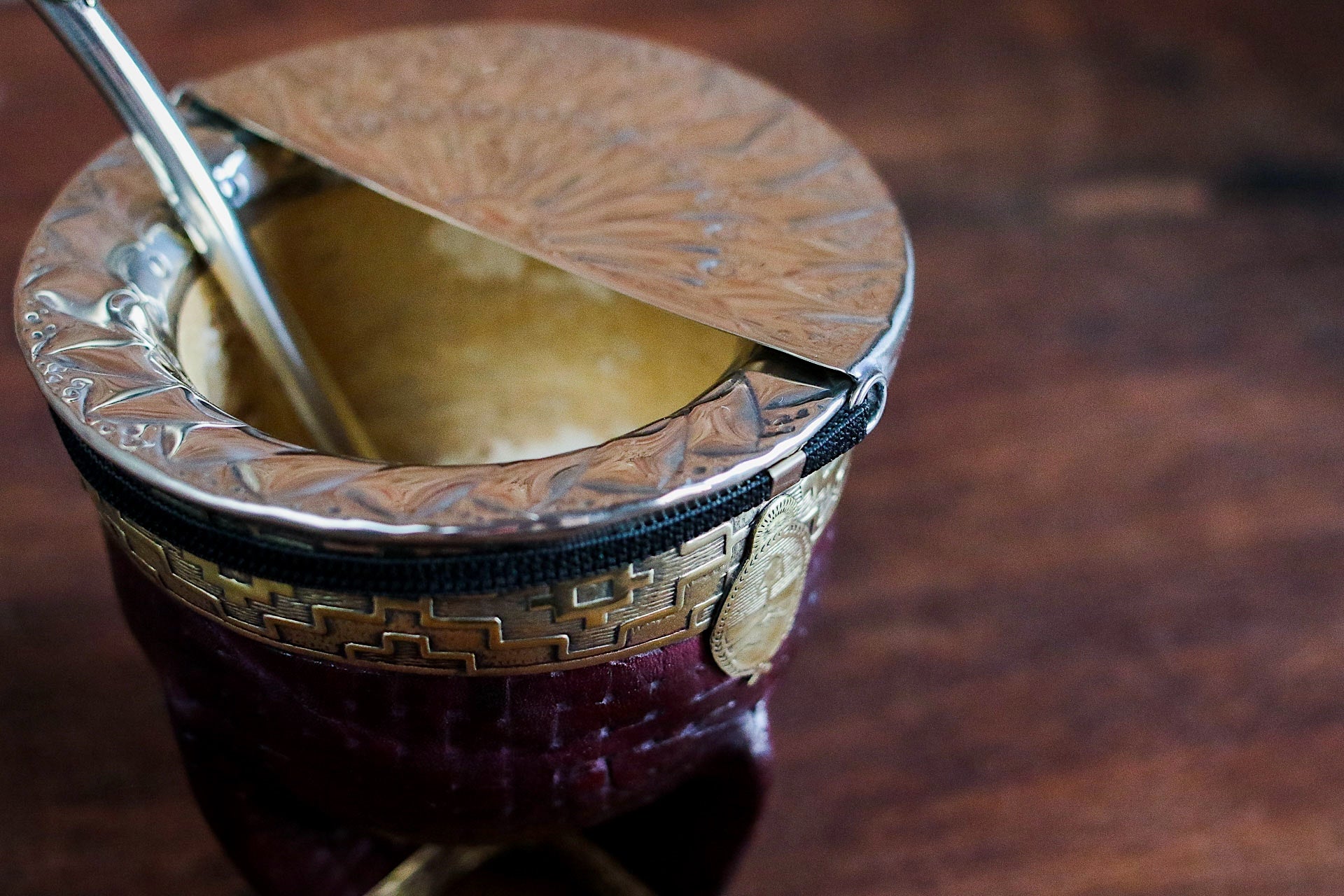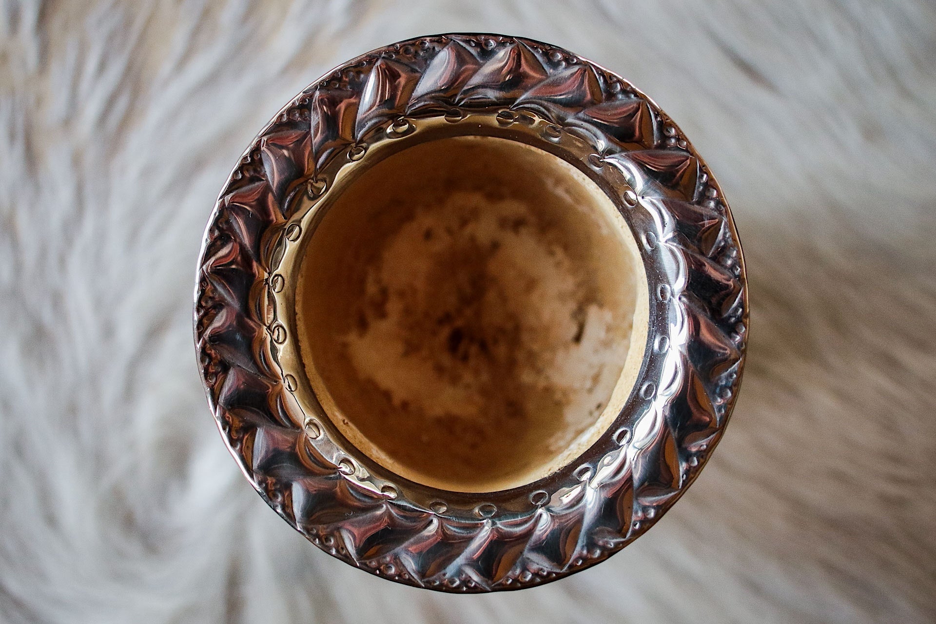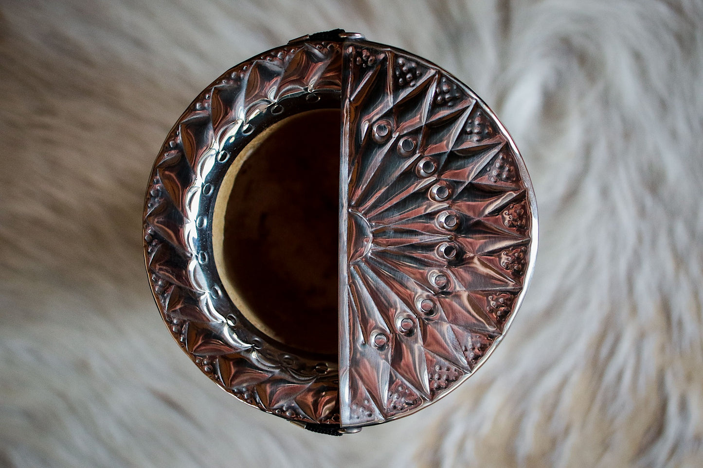 Mate imperial de porongo forrado artesanalmente en cuero natural con matepa de alpaca y base cincelada