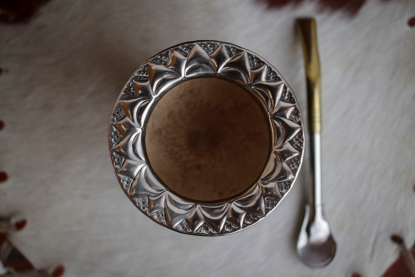 Mate imperial de porongo forrado artesanalmente en cuero natural con matepa de alpaca y base cincelada