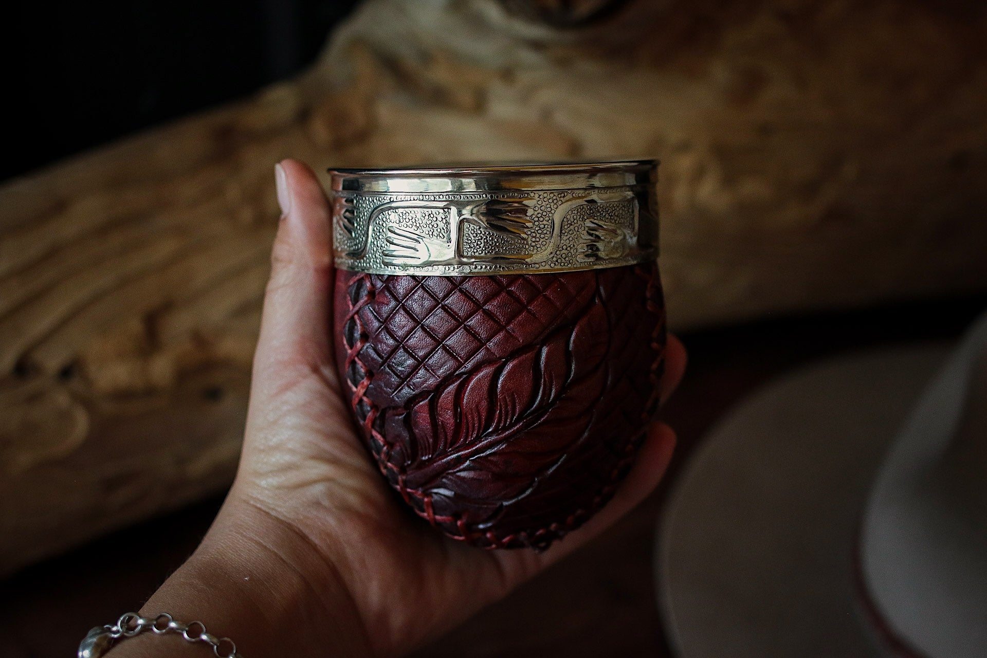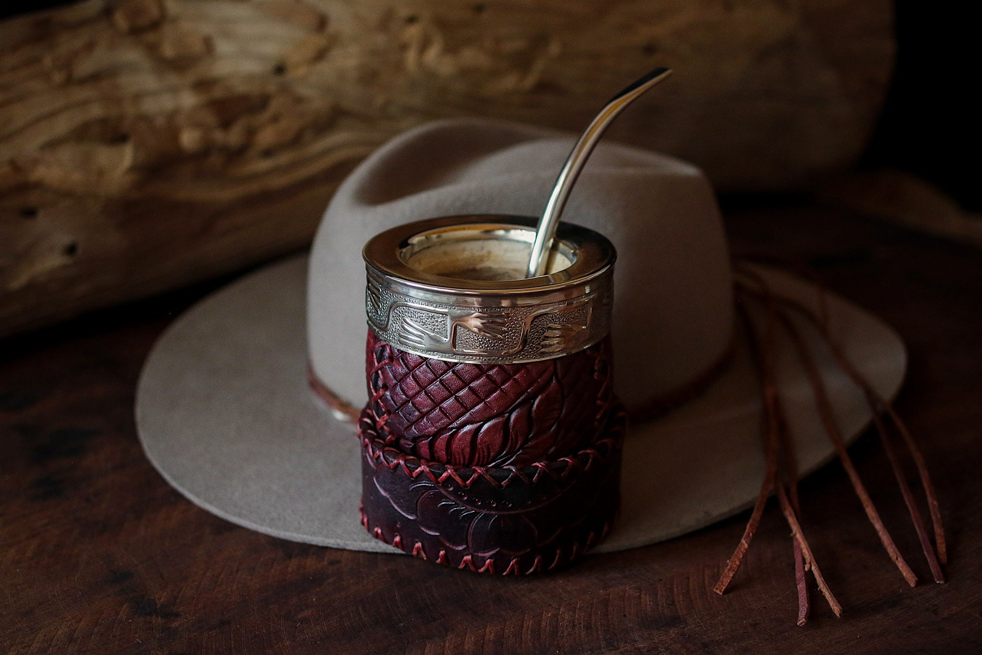 Mate criollo de porongo forrado artesanalmente en cuero crudo natural.