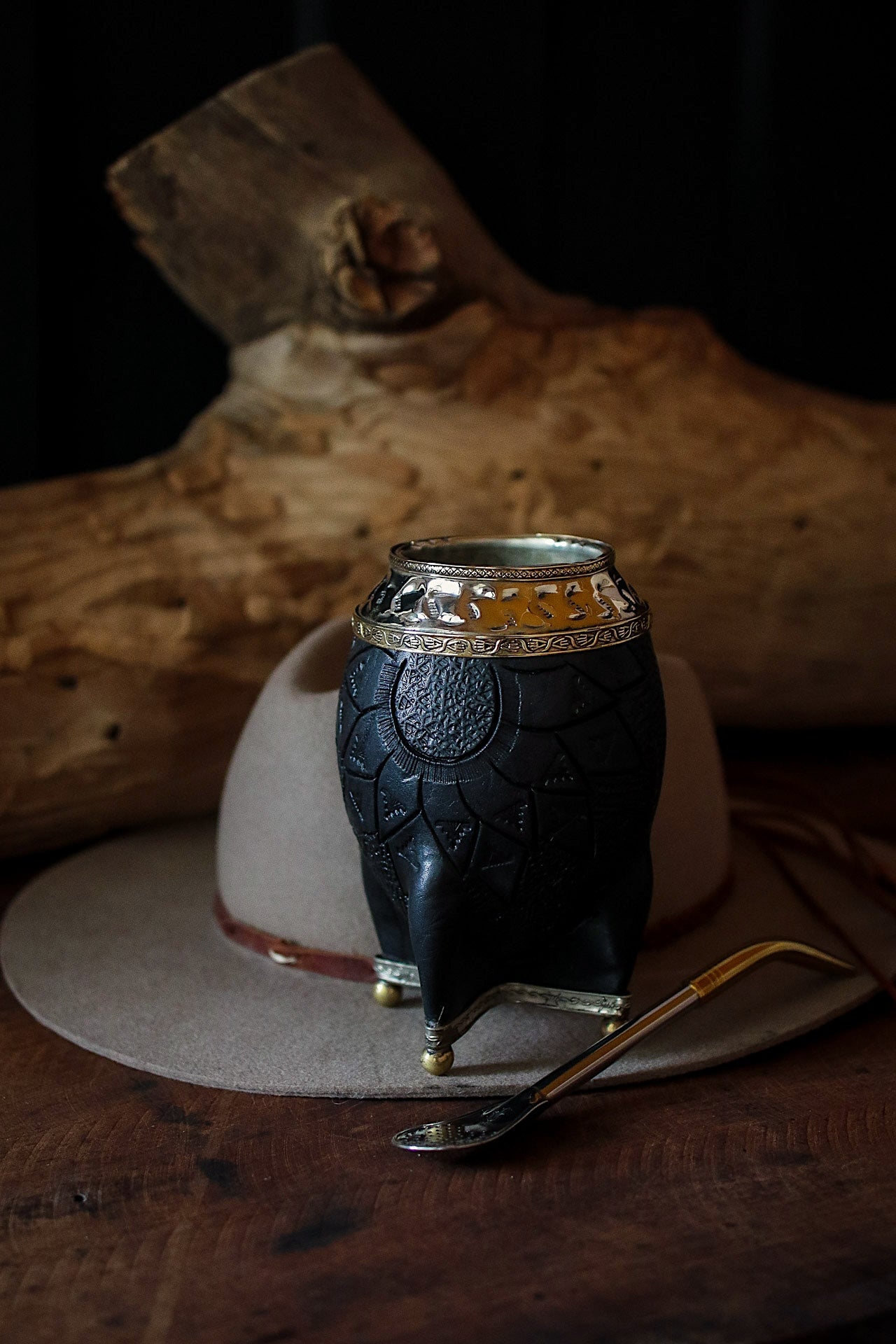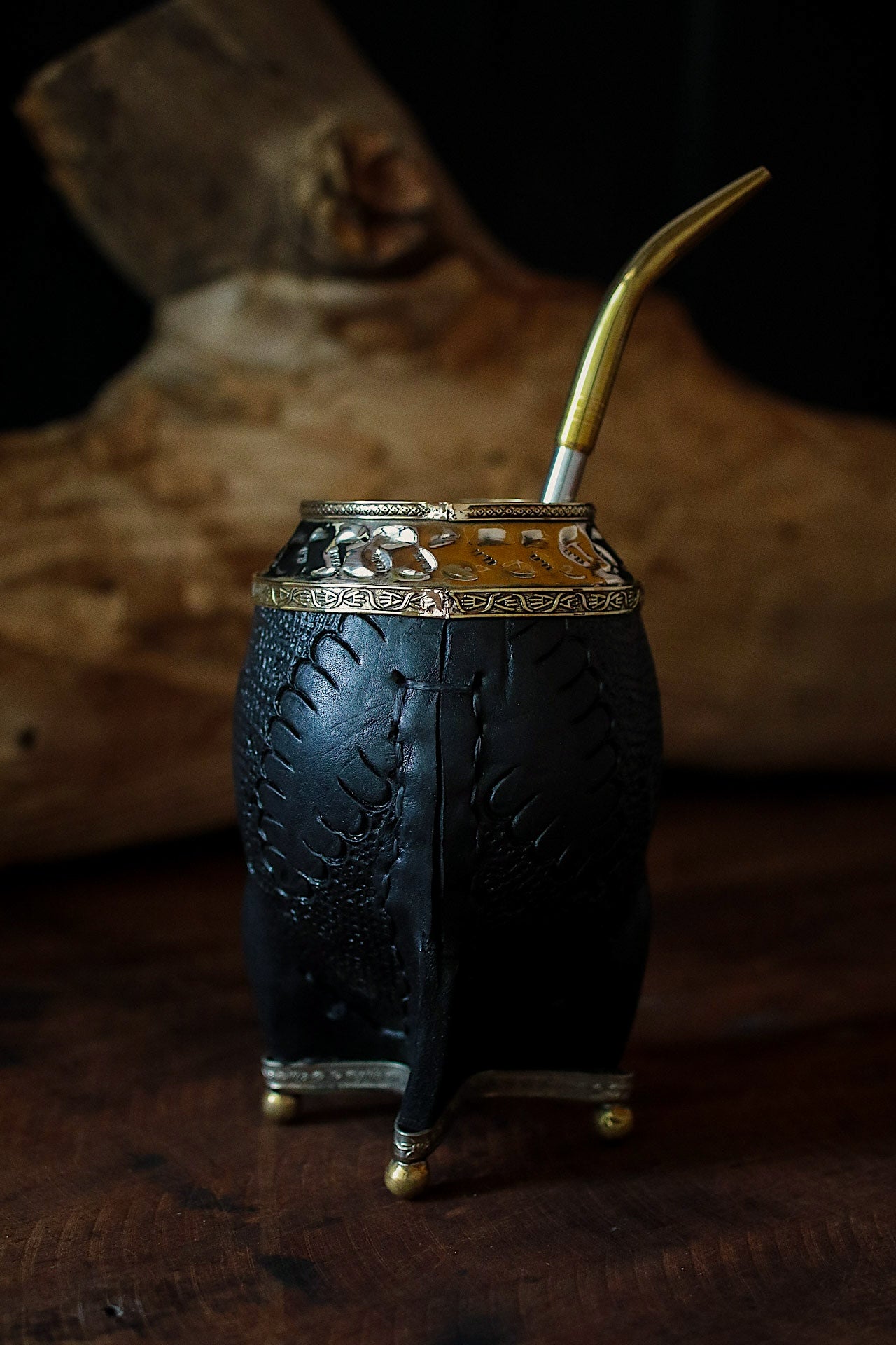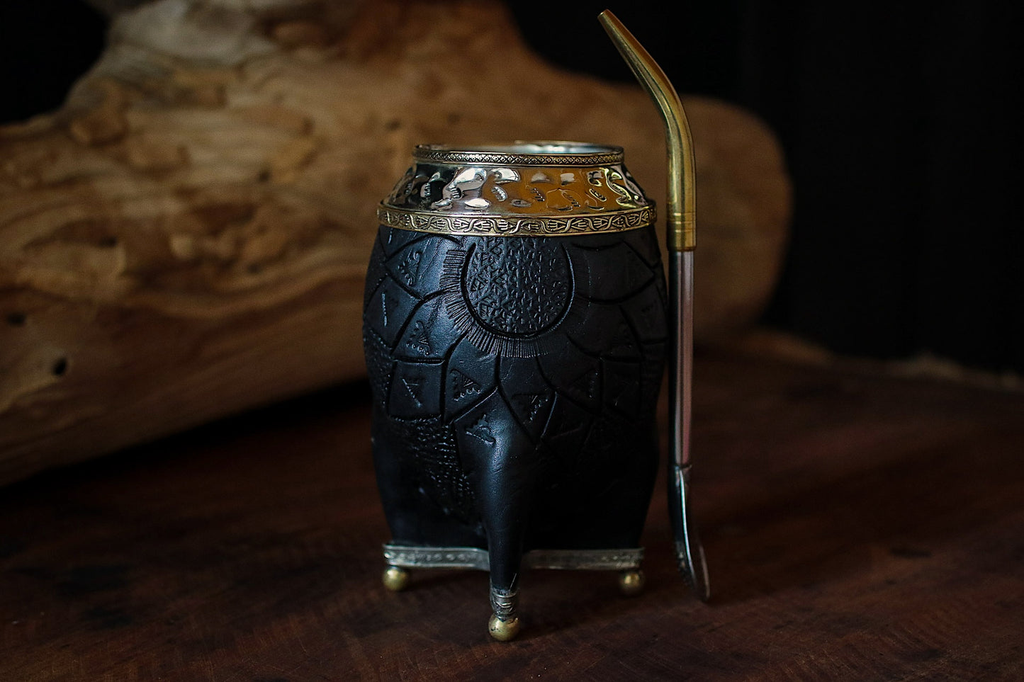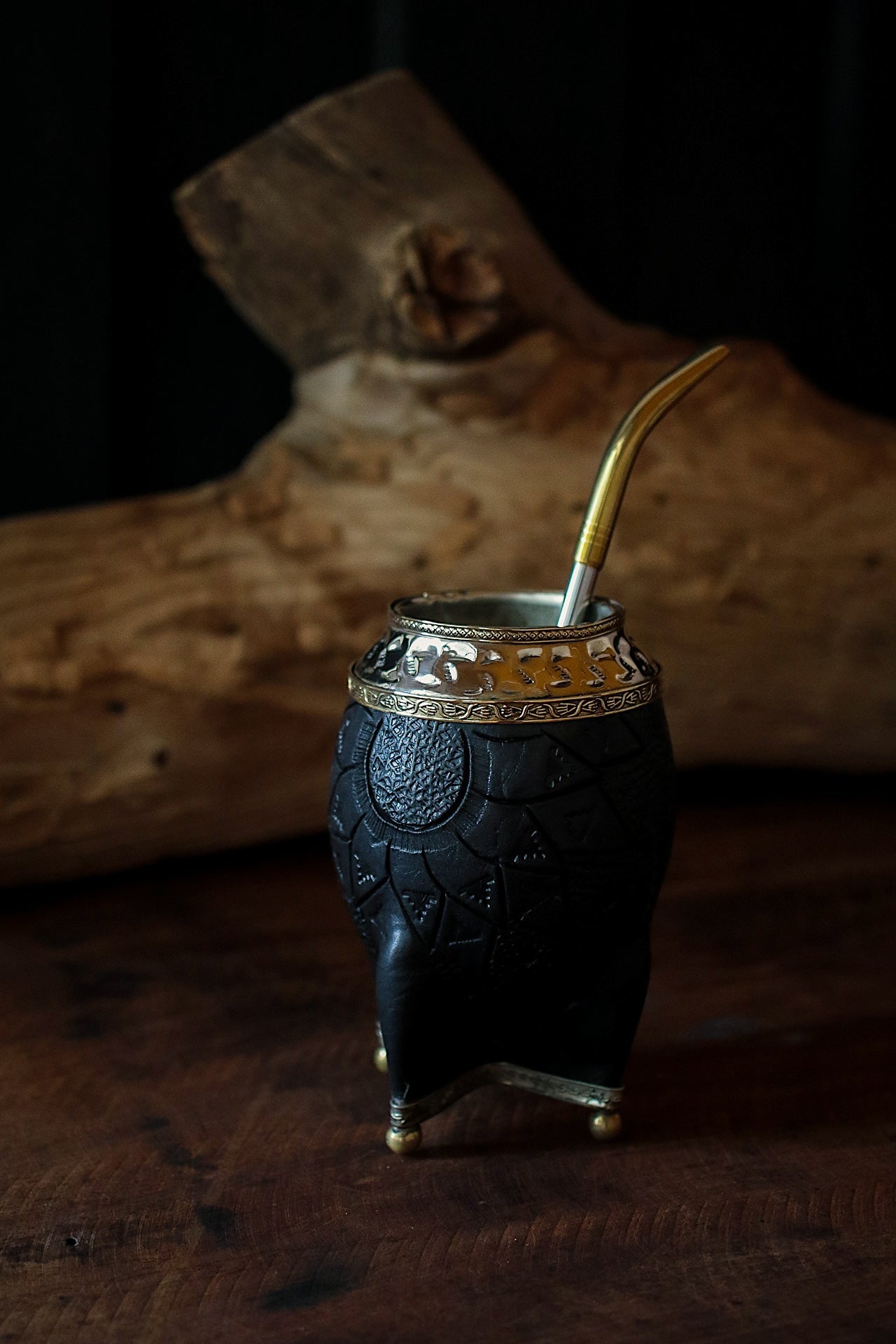 Mate de porongo forrado artesanalmente en cuero natural trabajado a mano.