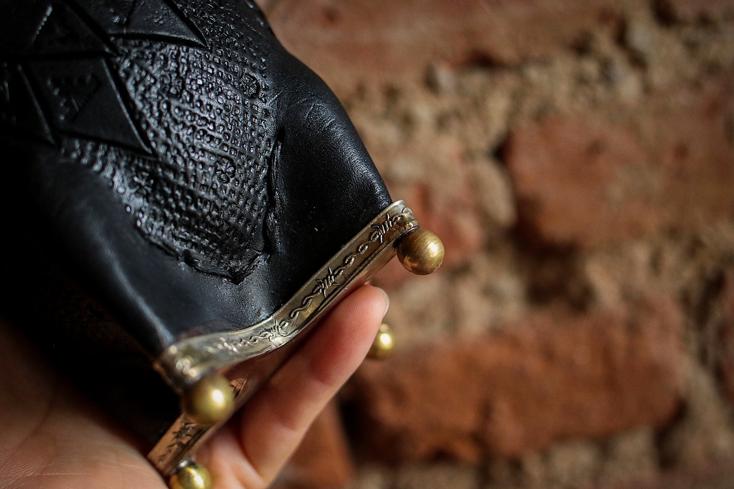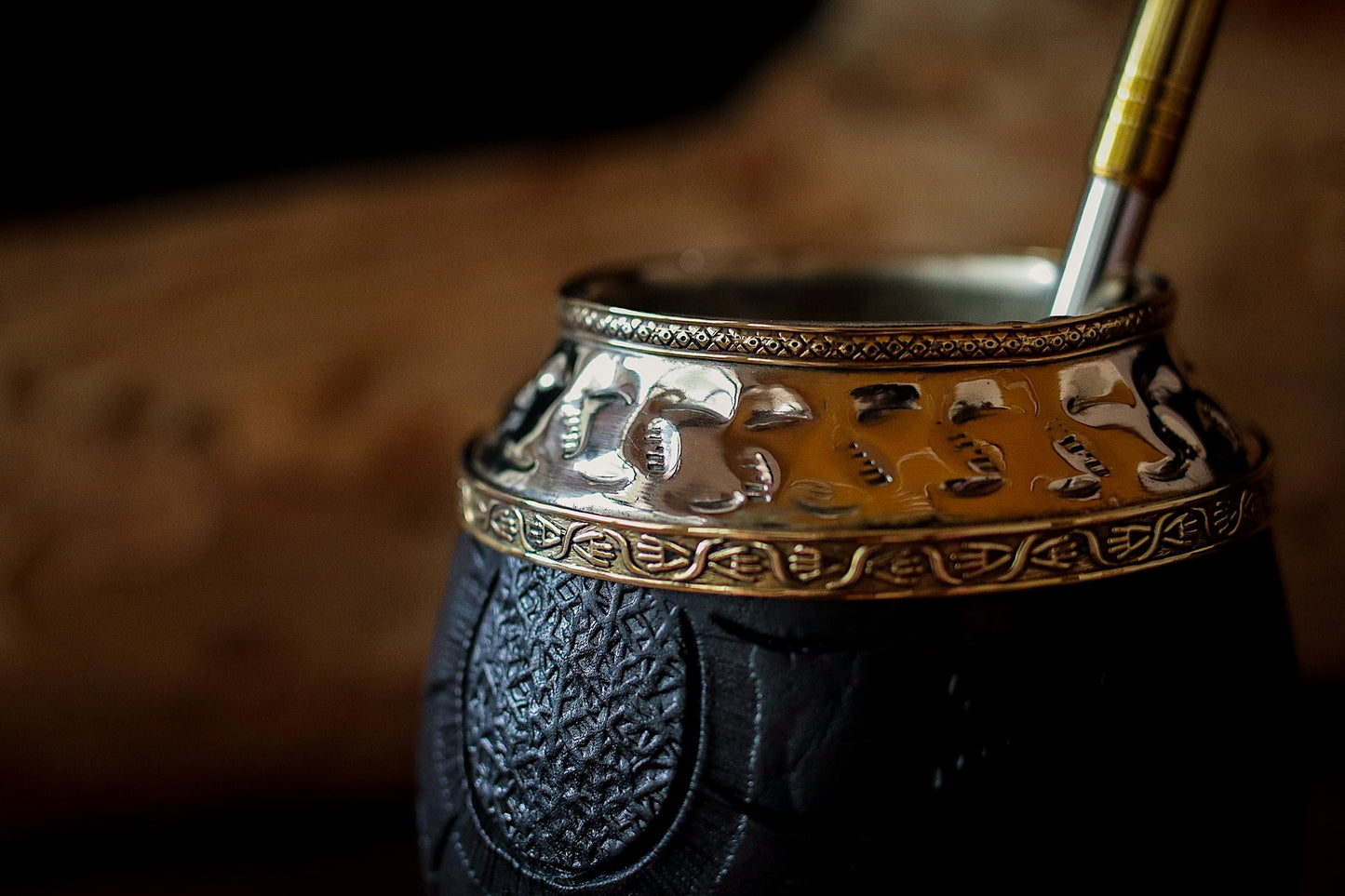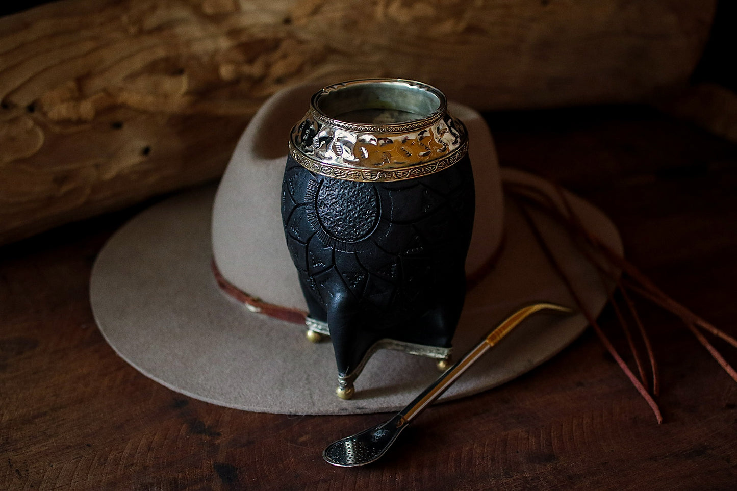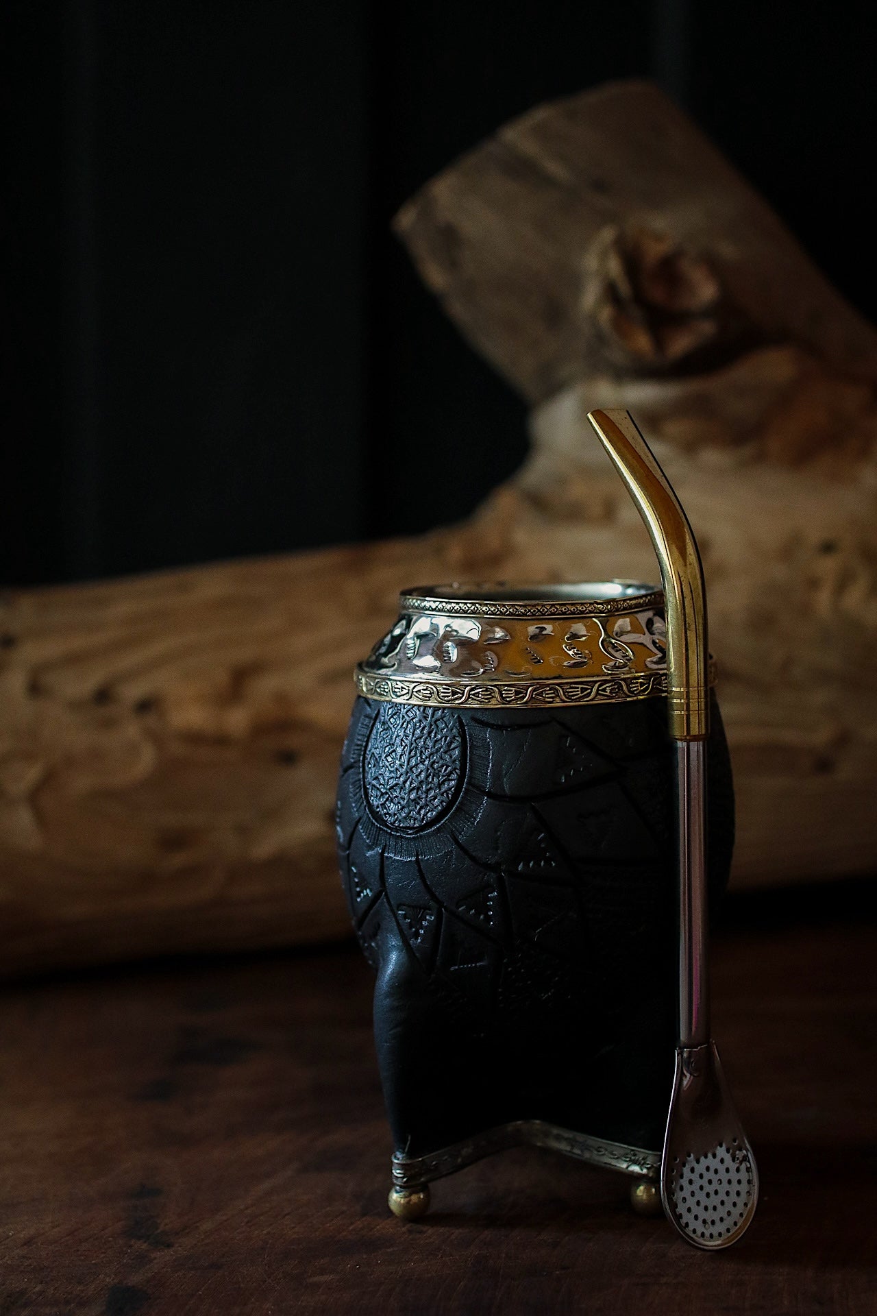 Mate de porongo forrado artesanalmente en cuero natural trabajado a mano.