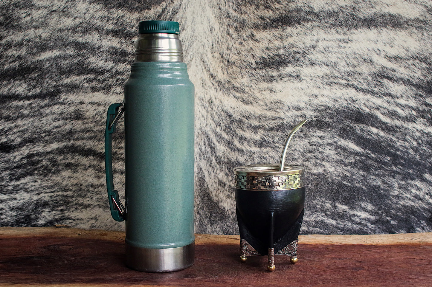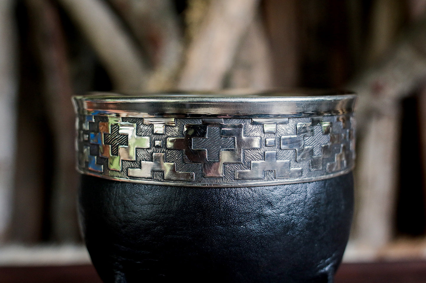 Mate de porongo forrado artesanalmente en cuero natural.