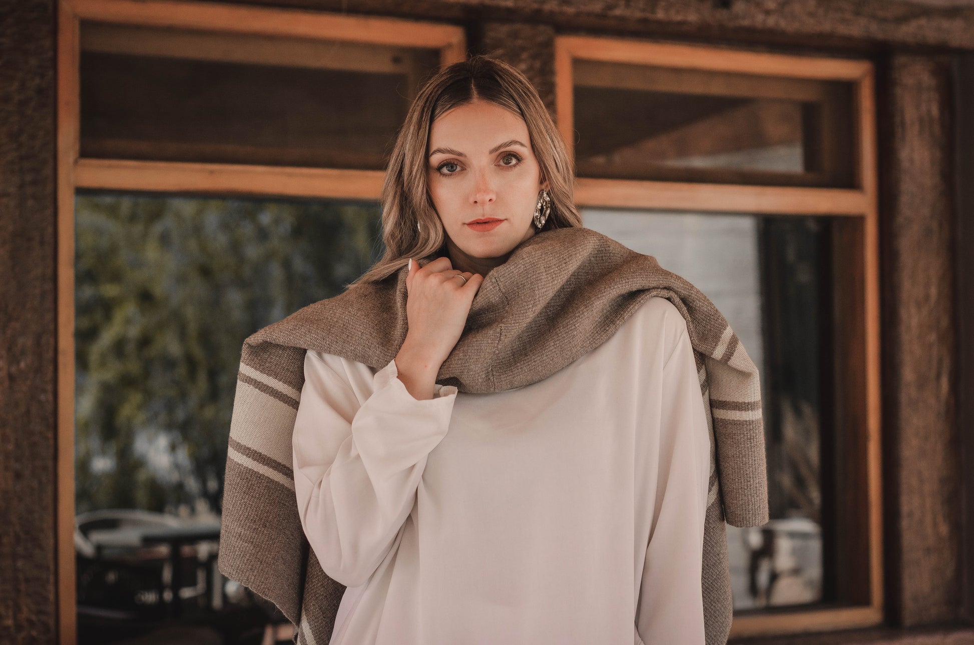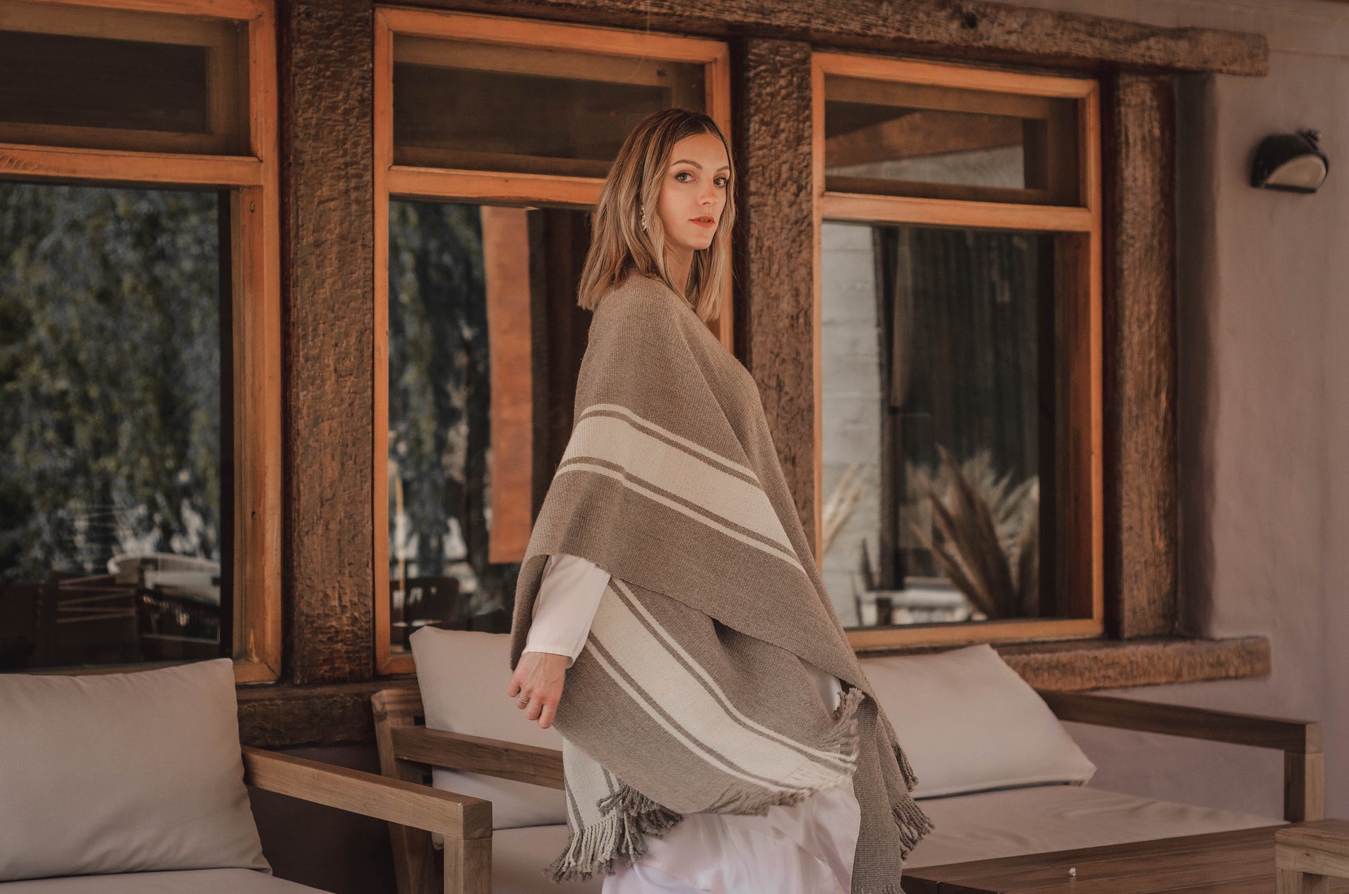 The poncho is a unique piece woven by hand with sheep wool threads on a Creole loom , with a high density of closed weft and light weight.