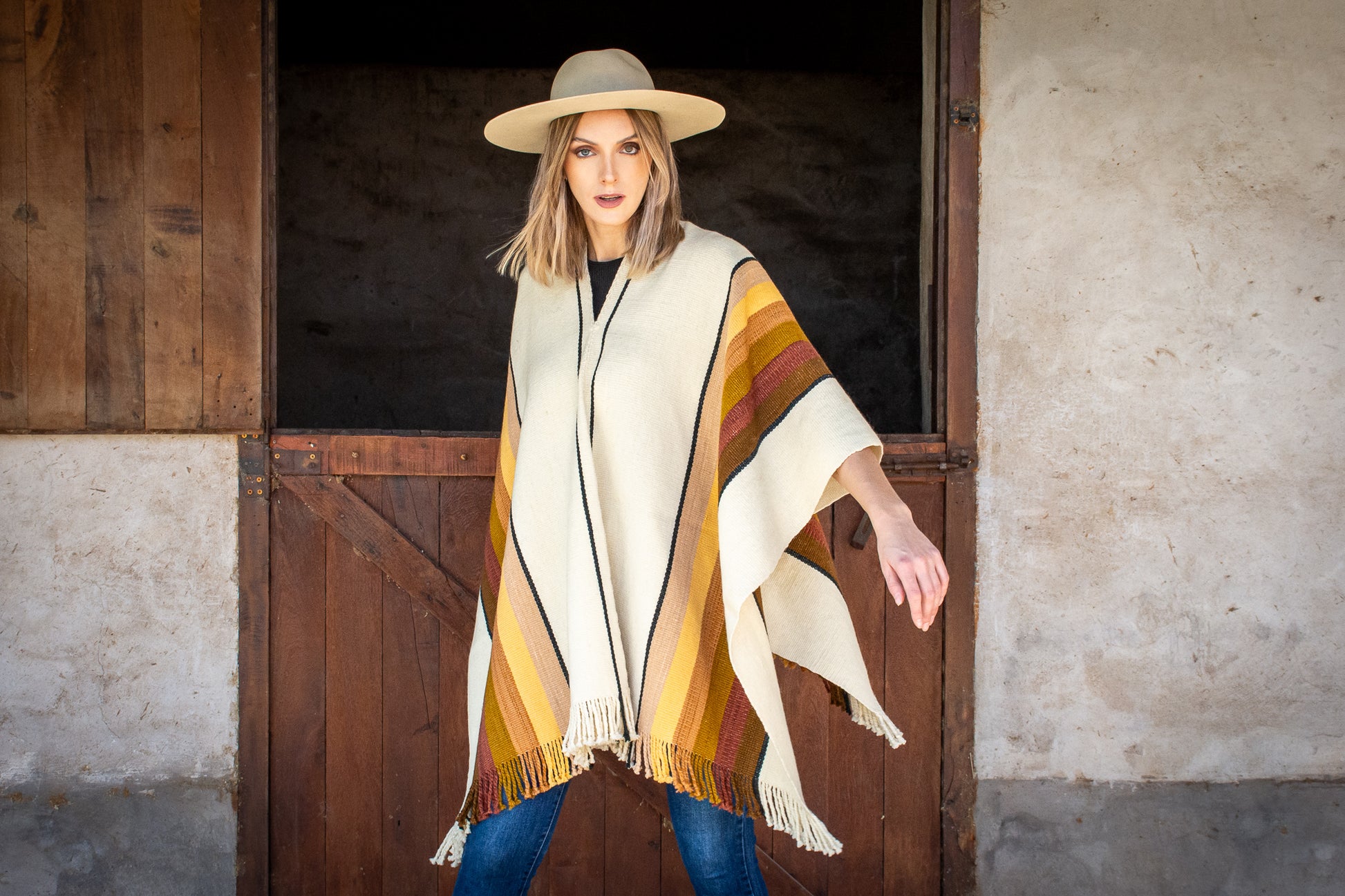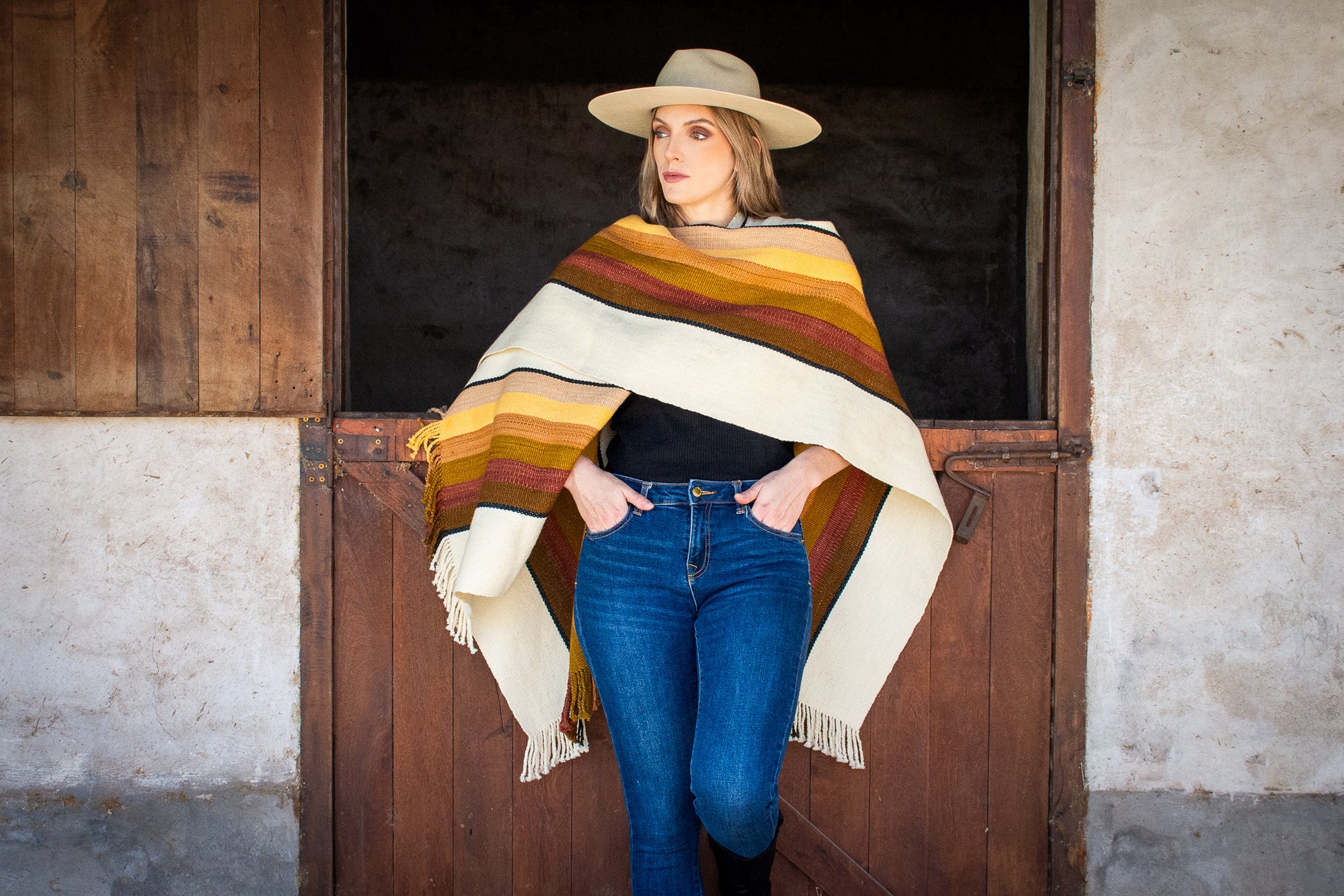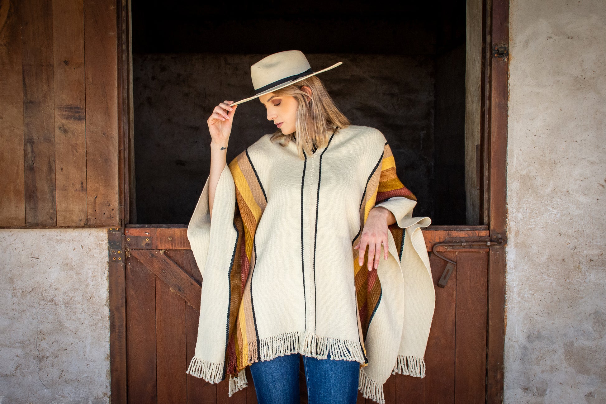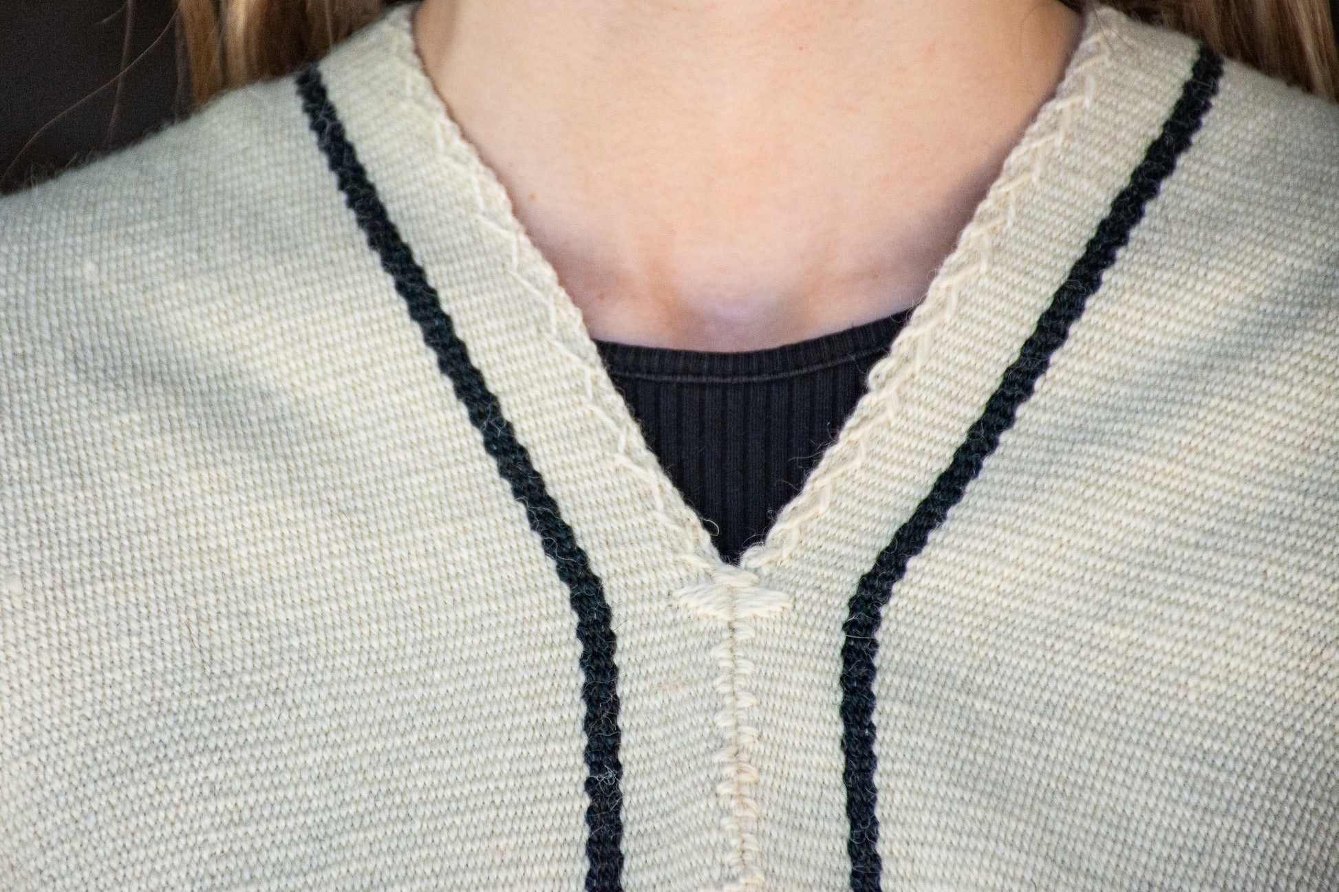 The poncho is a unique piece woven by hand with sheep wool threads on a Creole loom , with a high density of closed weft and light weight.