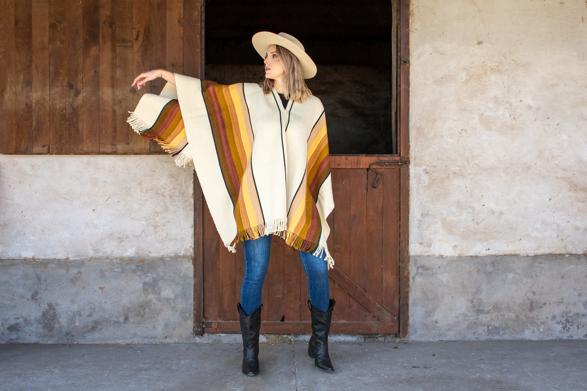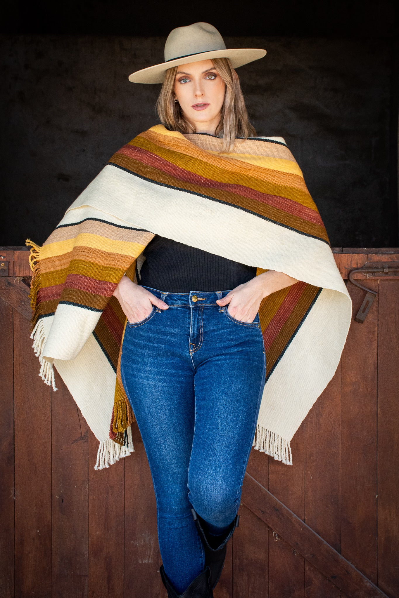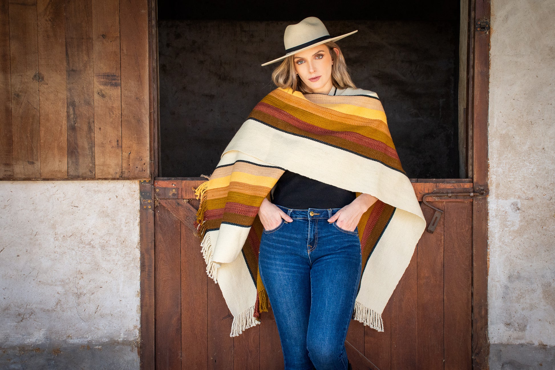 The poncho is a unique piece woven by hand with sheep wool threads on a Creole loom , with a high density of closed weft and light weight.
