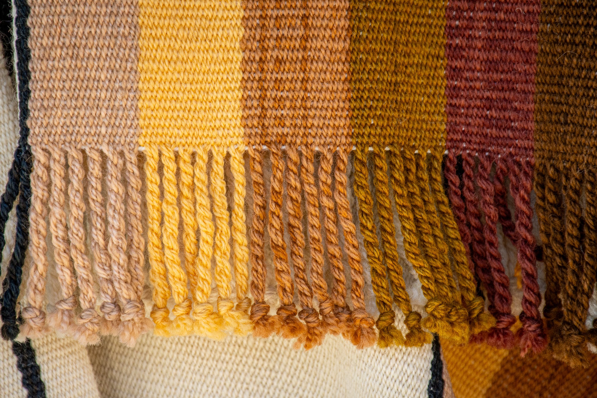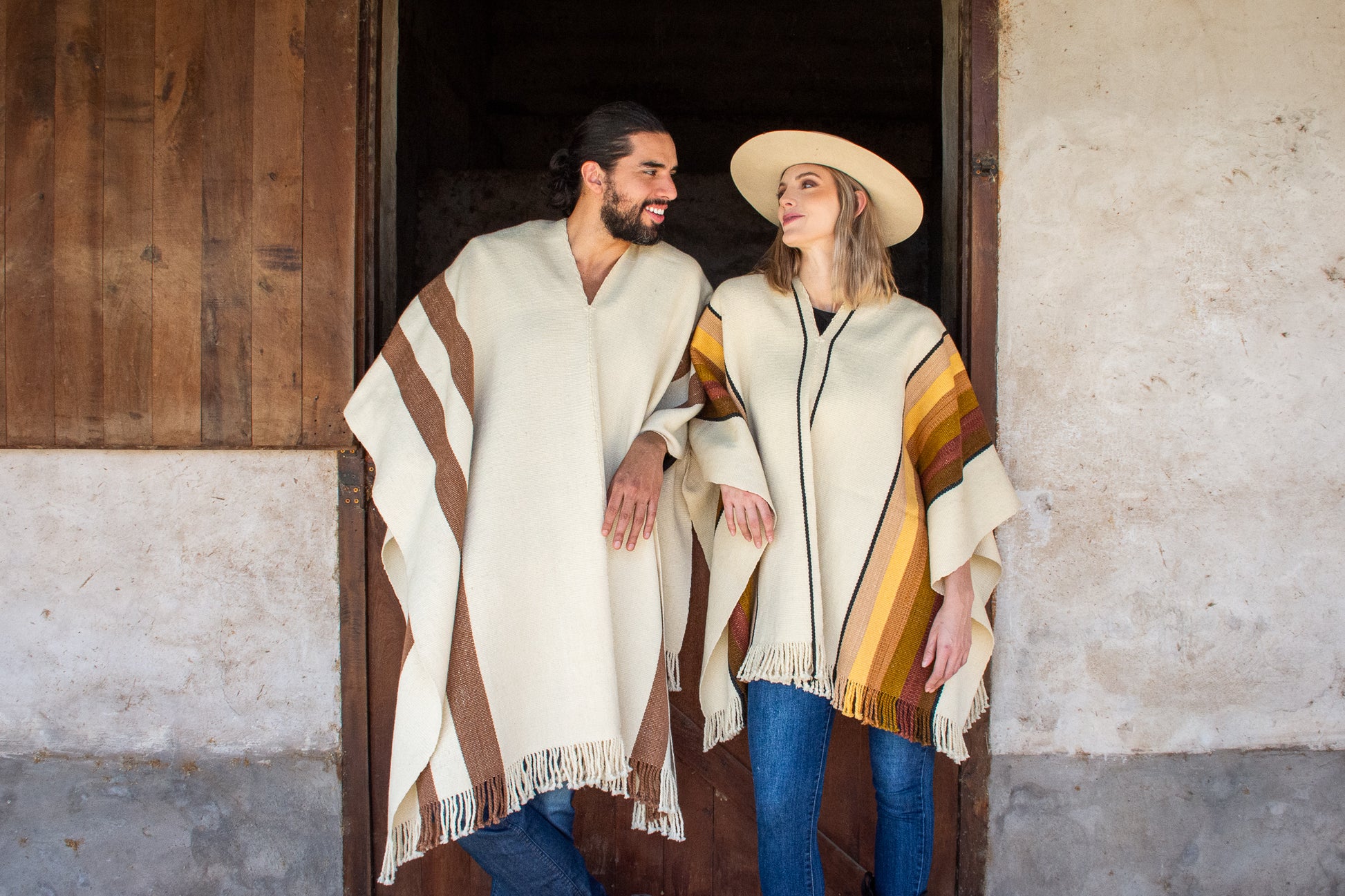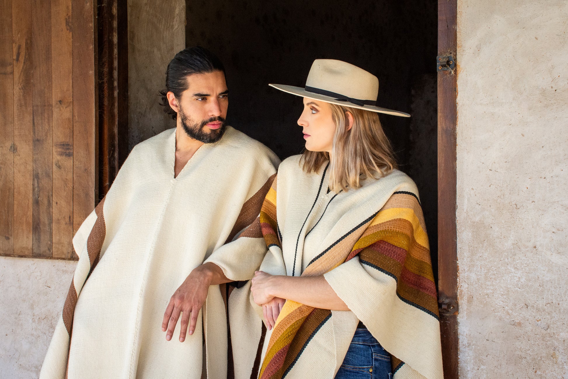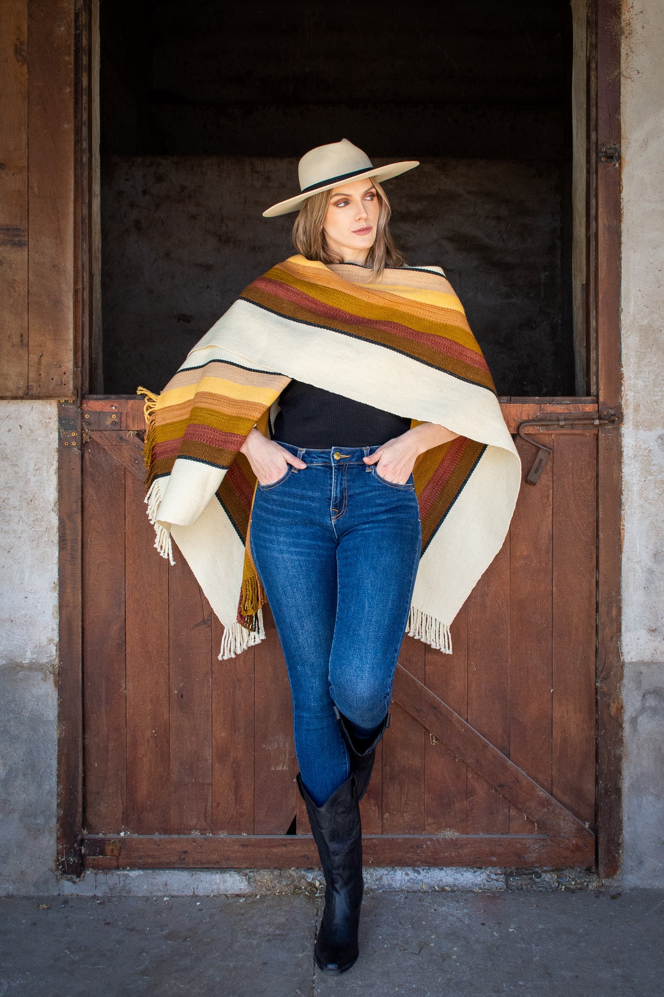 The poncho is a unique piece woven by hand with sheep wool threads on a Creole loom , with a high density of closed weft and light weight.