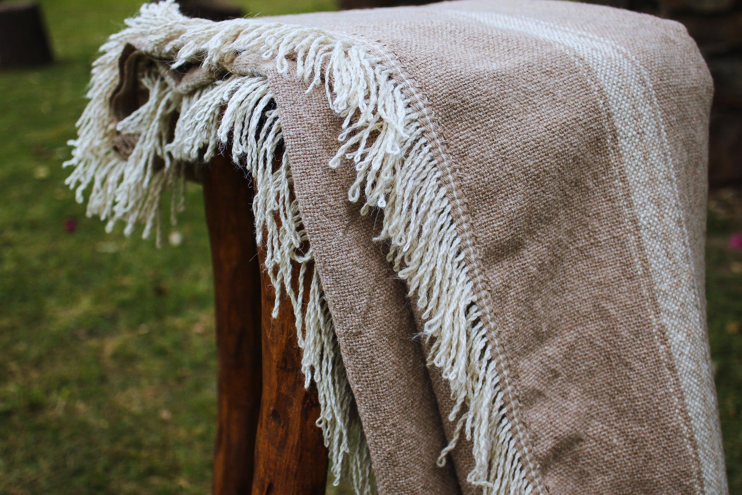 It is Artisanal from the shearing of the Sheep , fleece washing, carding, spinning in a distaff and making in an old loom.