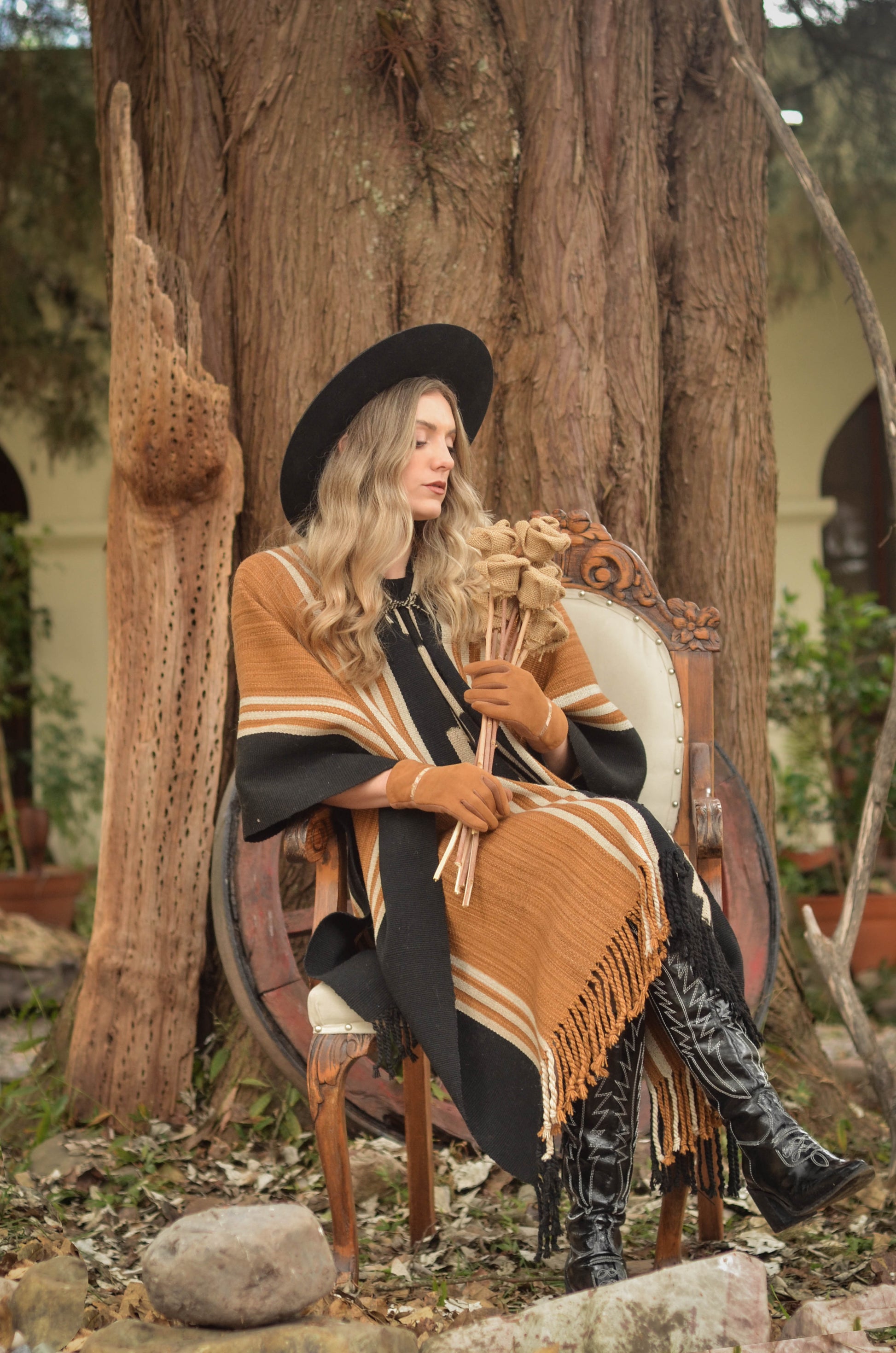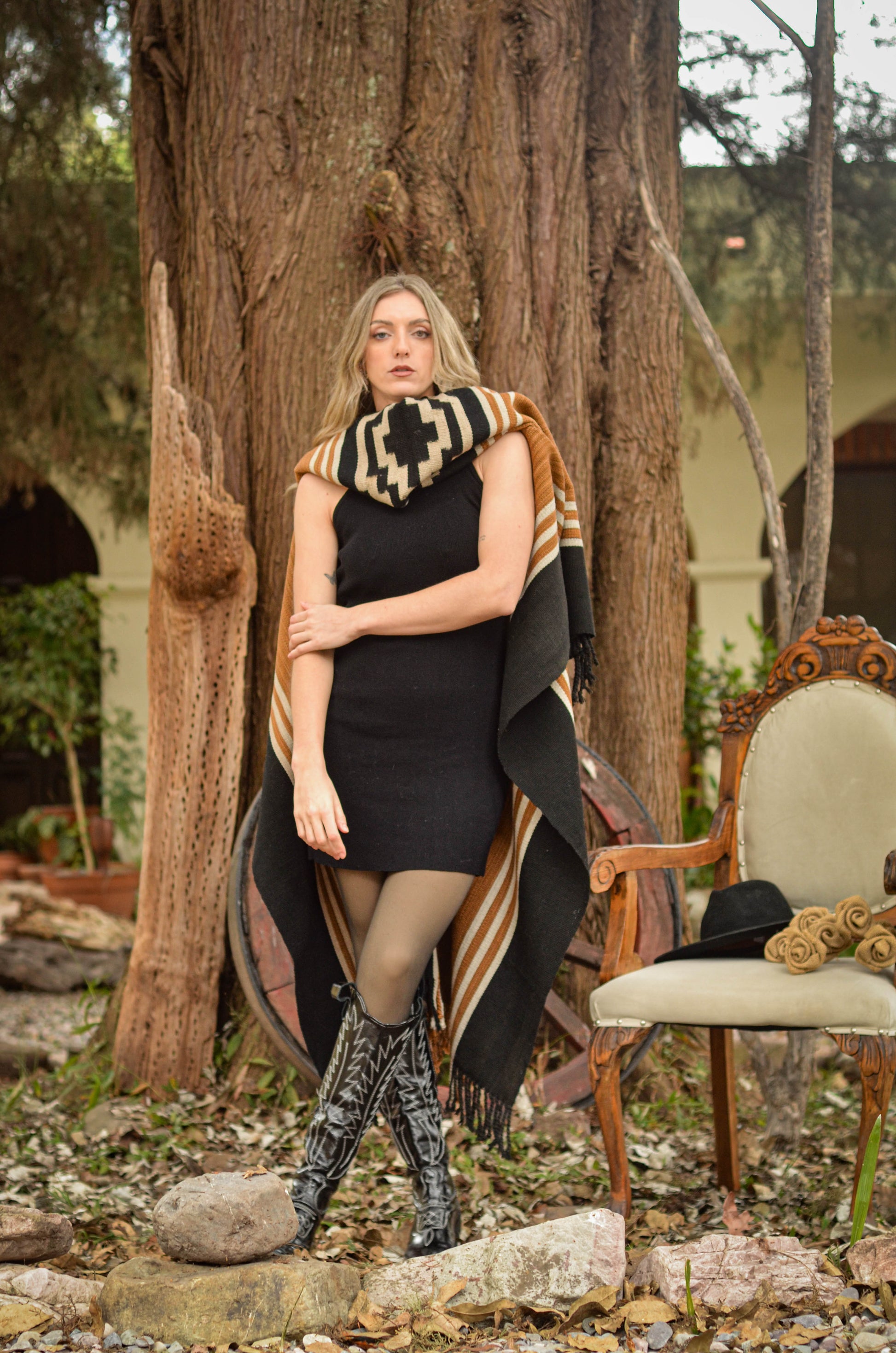 Poncho "Araucana" es un poncho Guarda Atada y es parte de la Colección "Belgrano" de 23 obras textiles Uayno, es una pieza única tejida artesanalmente con hilos de lana de oveja en telar criollo.