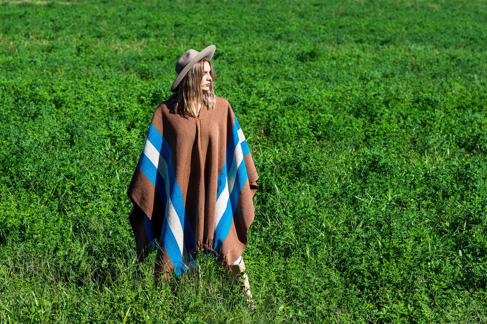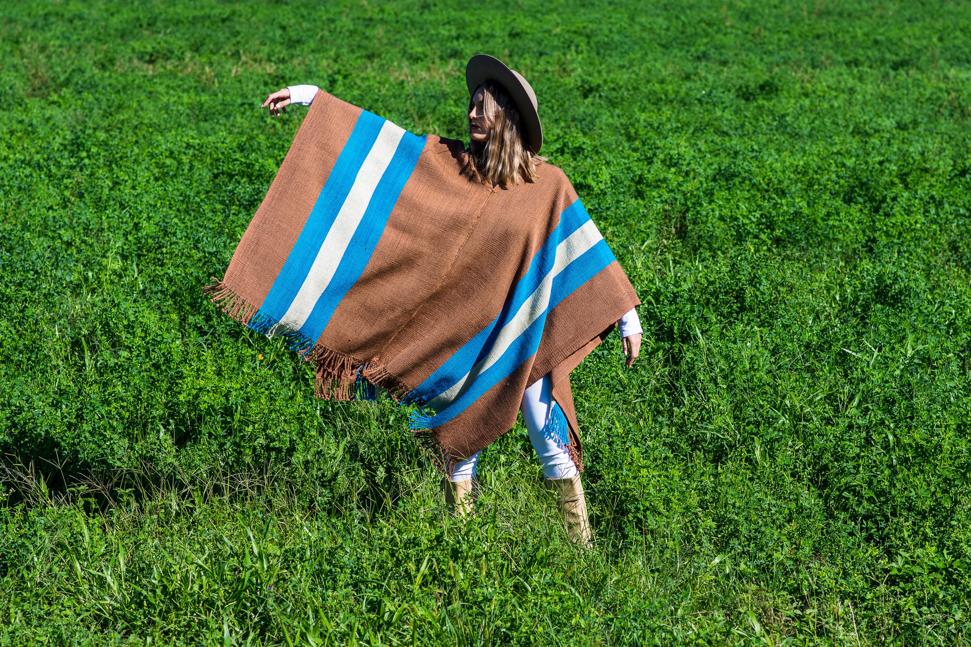 The poncho is a unique piece woven by hand with sheep wool threads on a Creole loom , with a high density of closed weft and light weight.