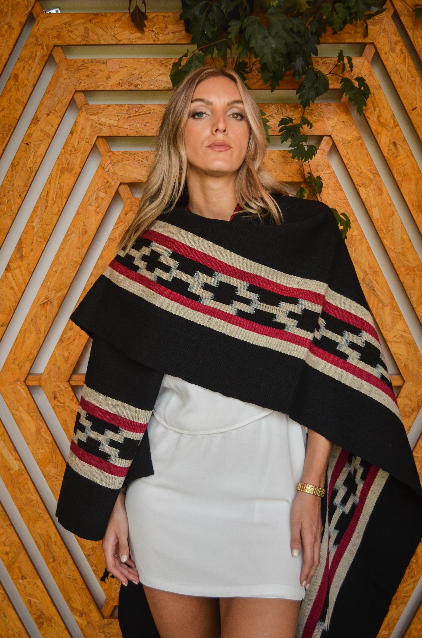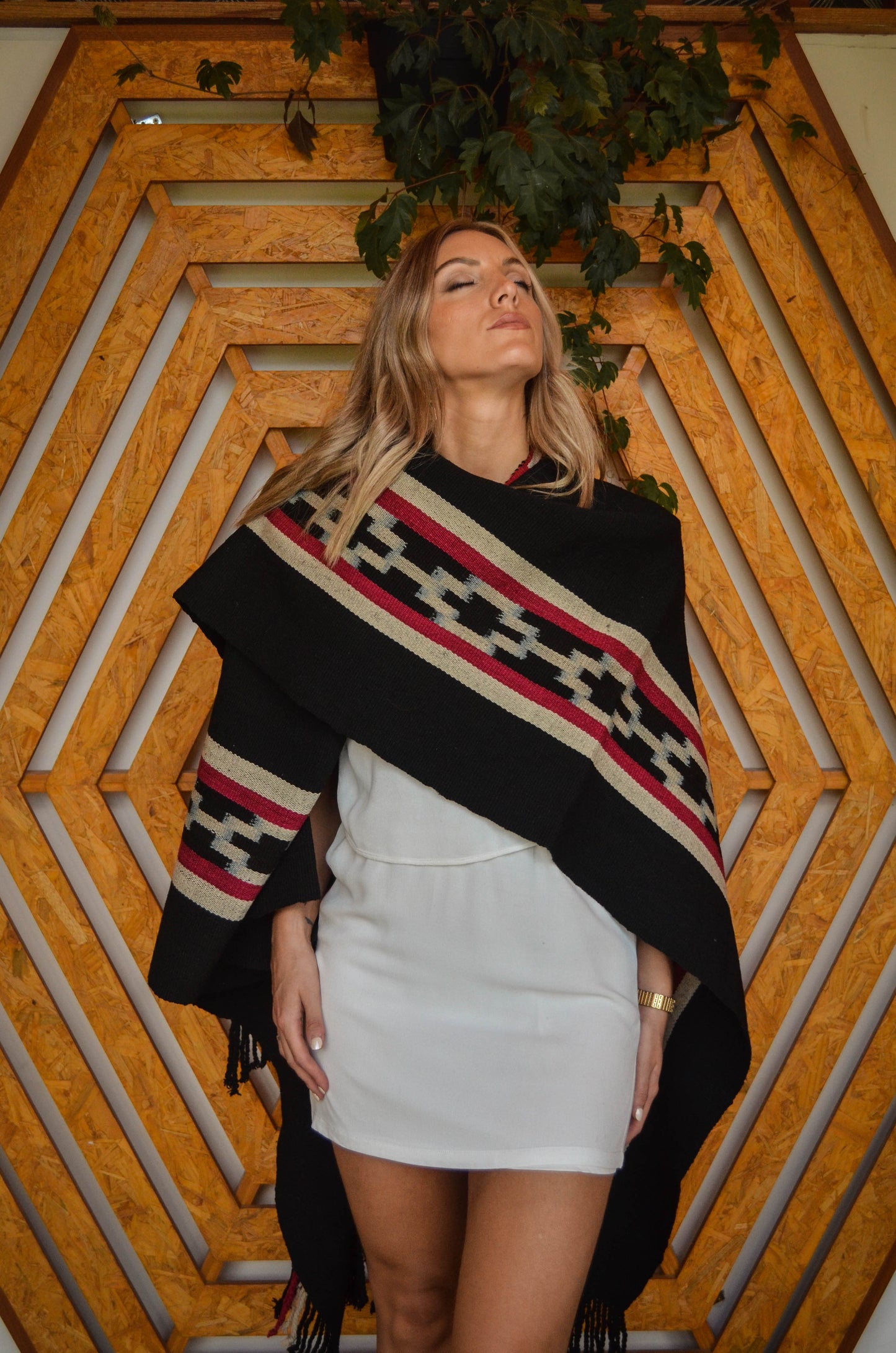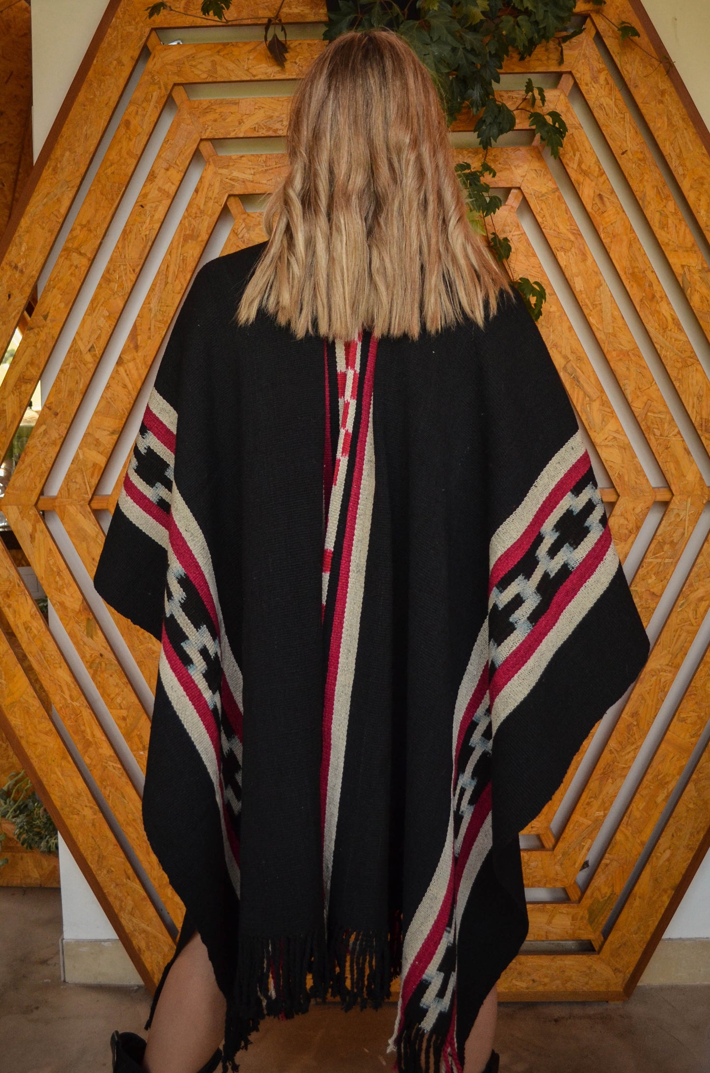 Poncho "Yrigoyen" es un poncho Guarda Atada y es parte de la Colección "Tango" de 23 obras textiles Uayno, es una pieza única tejida artesanalmente con hilos de lana de oveja en telar criollo.