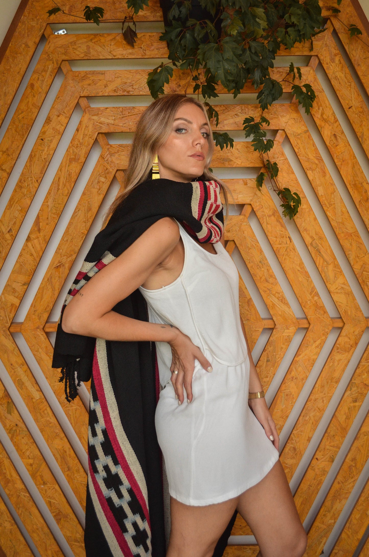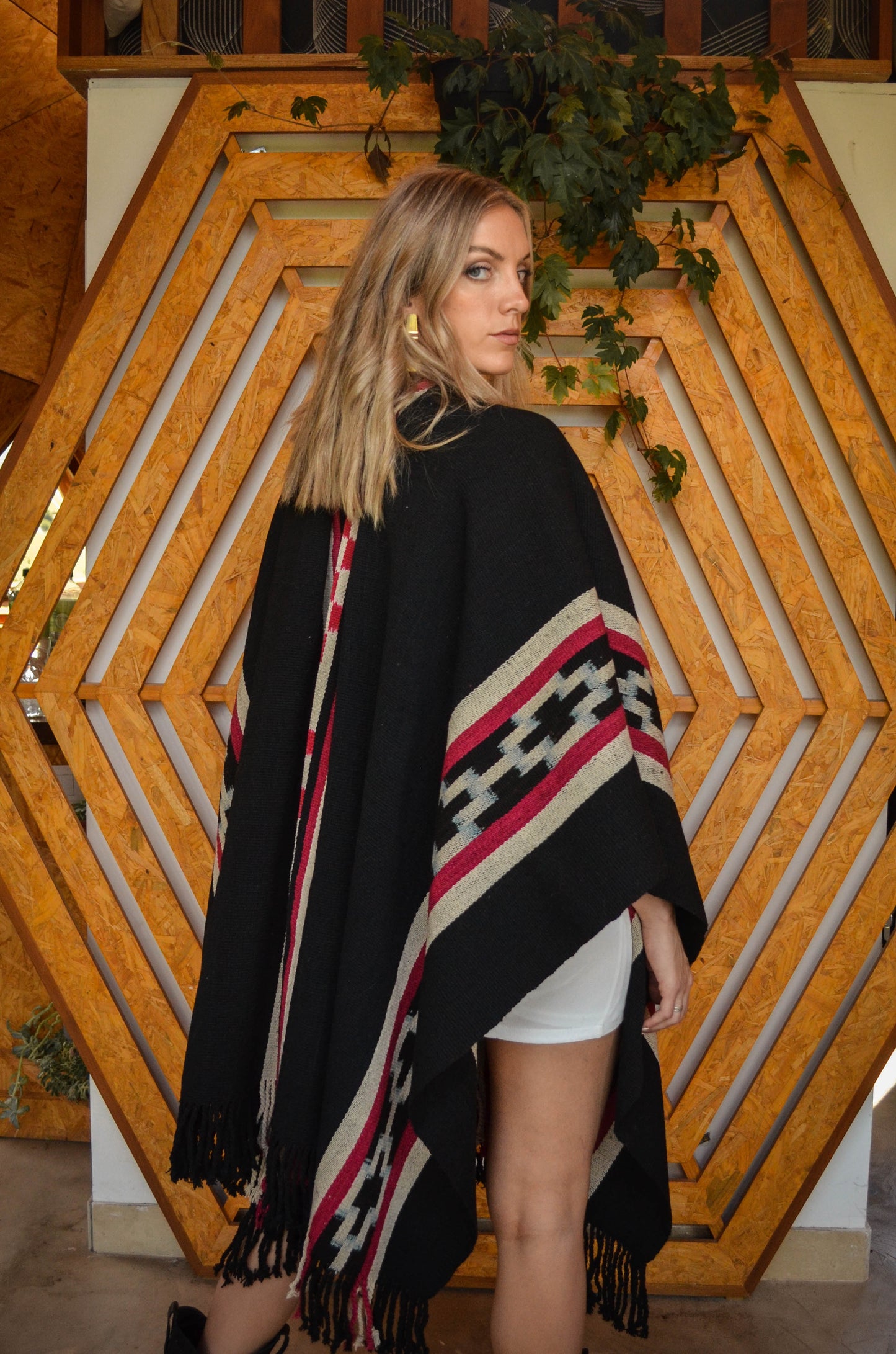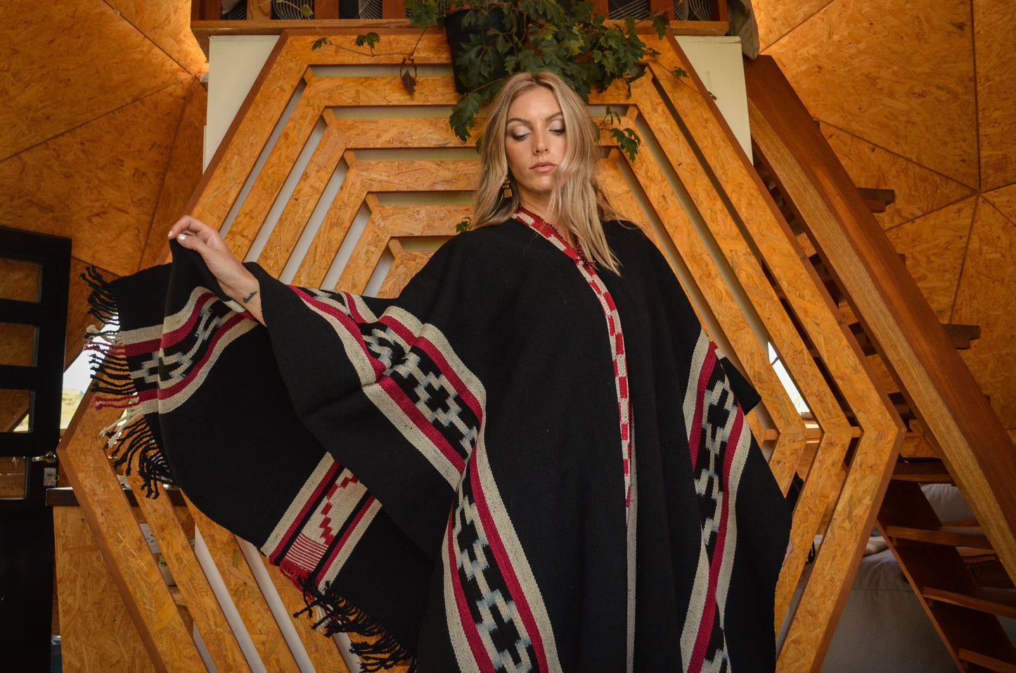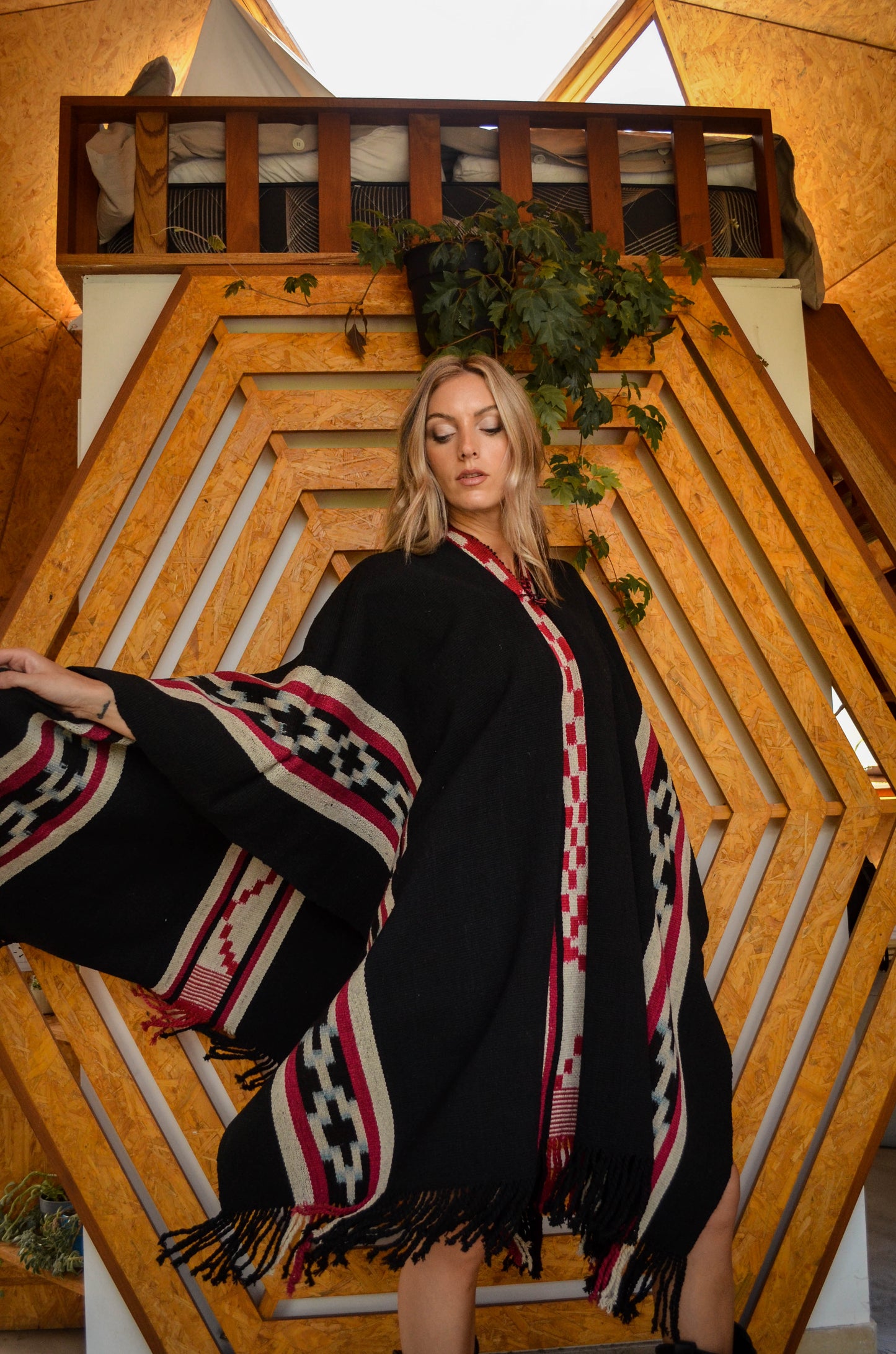 Poncho "Yrigoyen" es un poncho Guarda Atada y es parte de la Colección "Tango" de 23 obras textiles Uayno, es una pieza única tejida artesanalmente con hilos de lana de oveja en telar criollo.