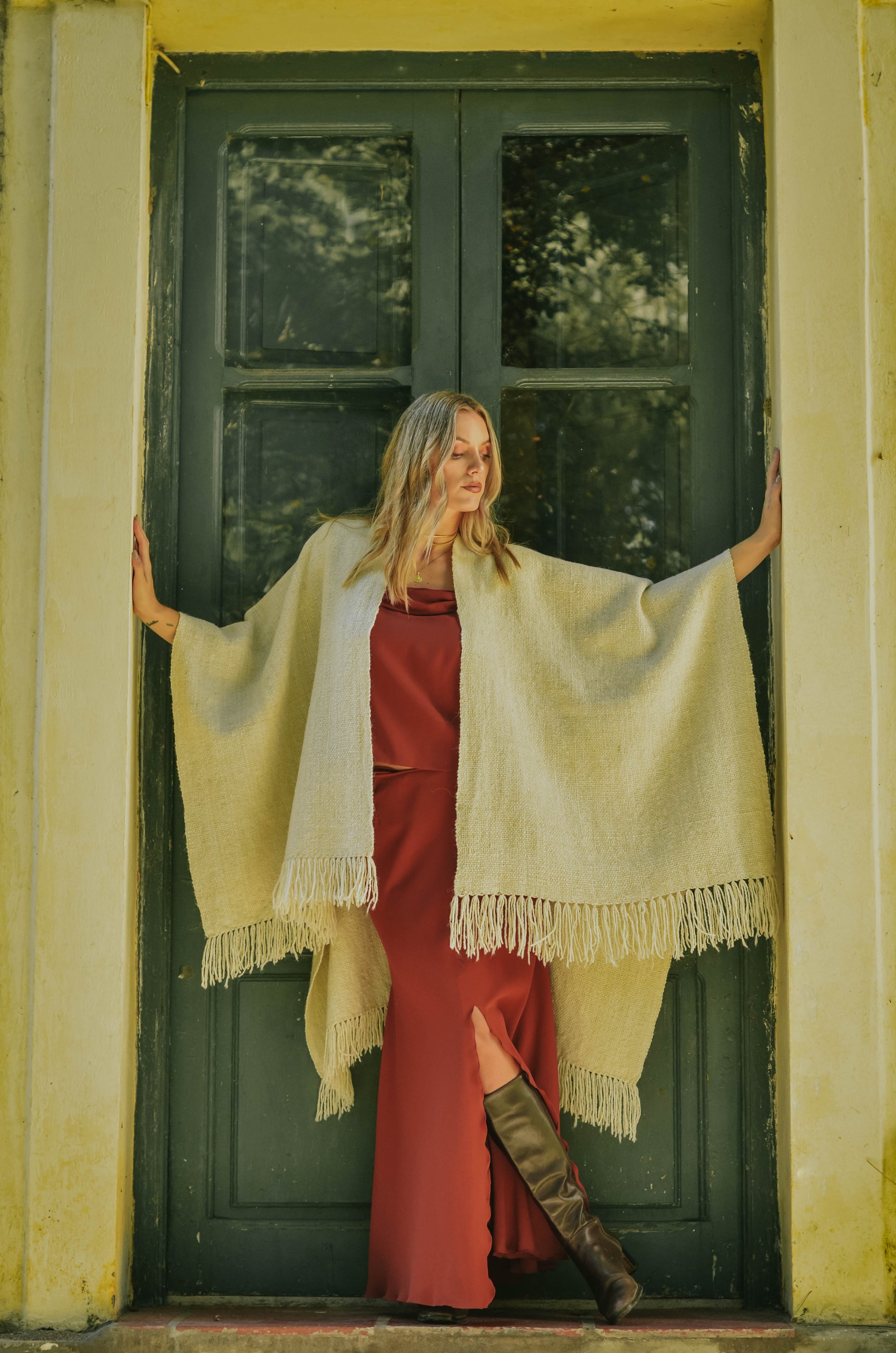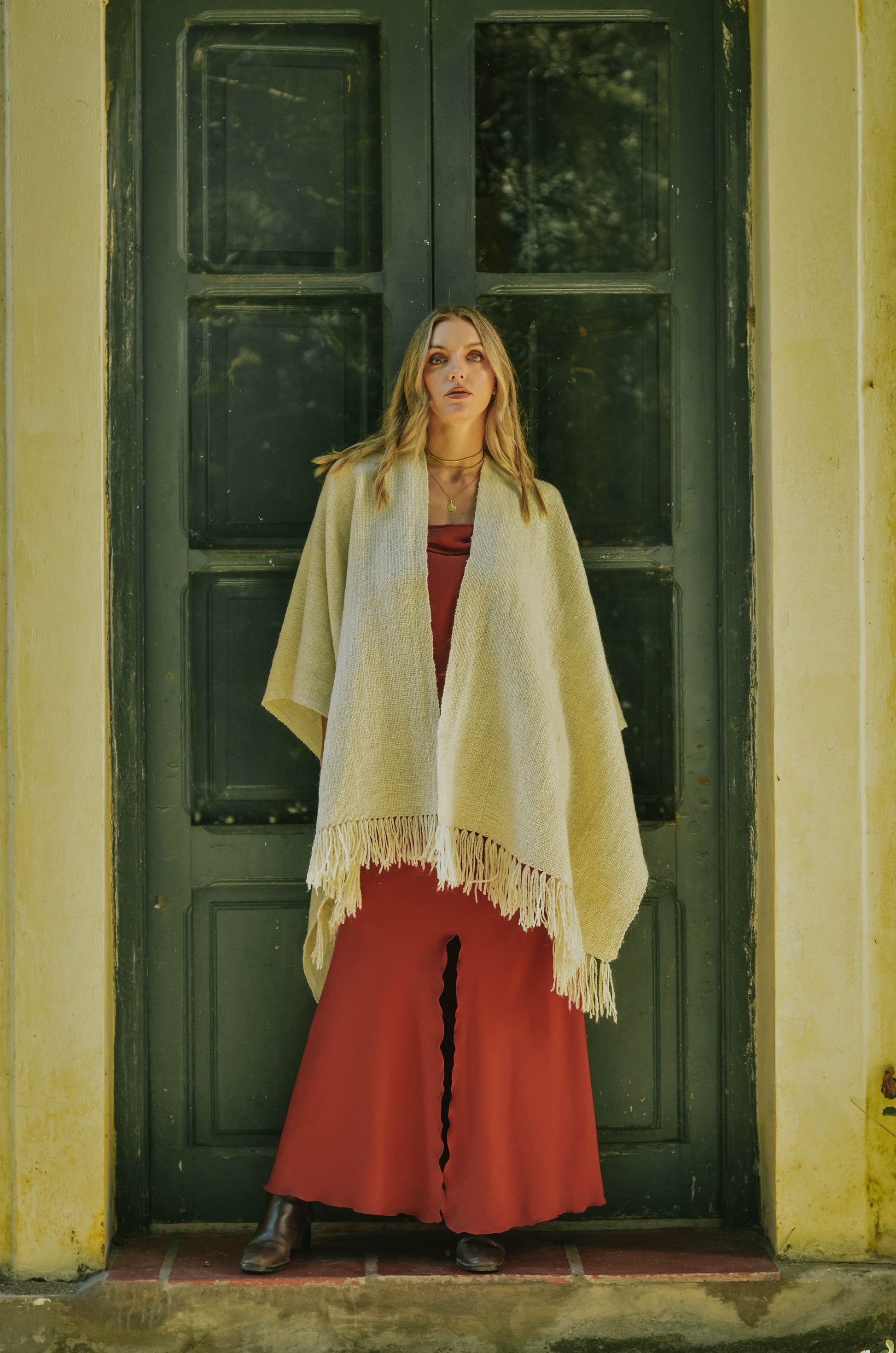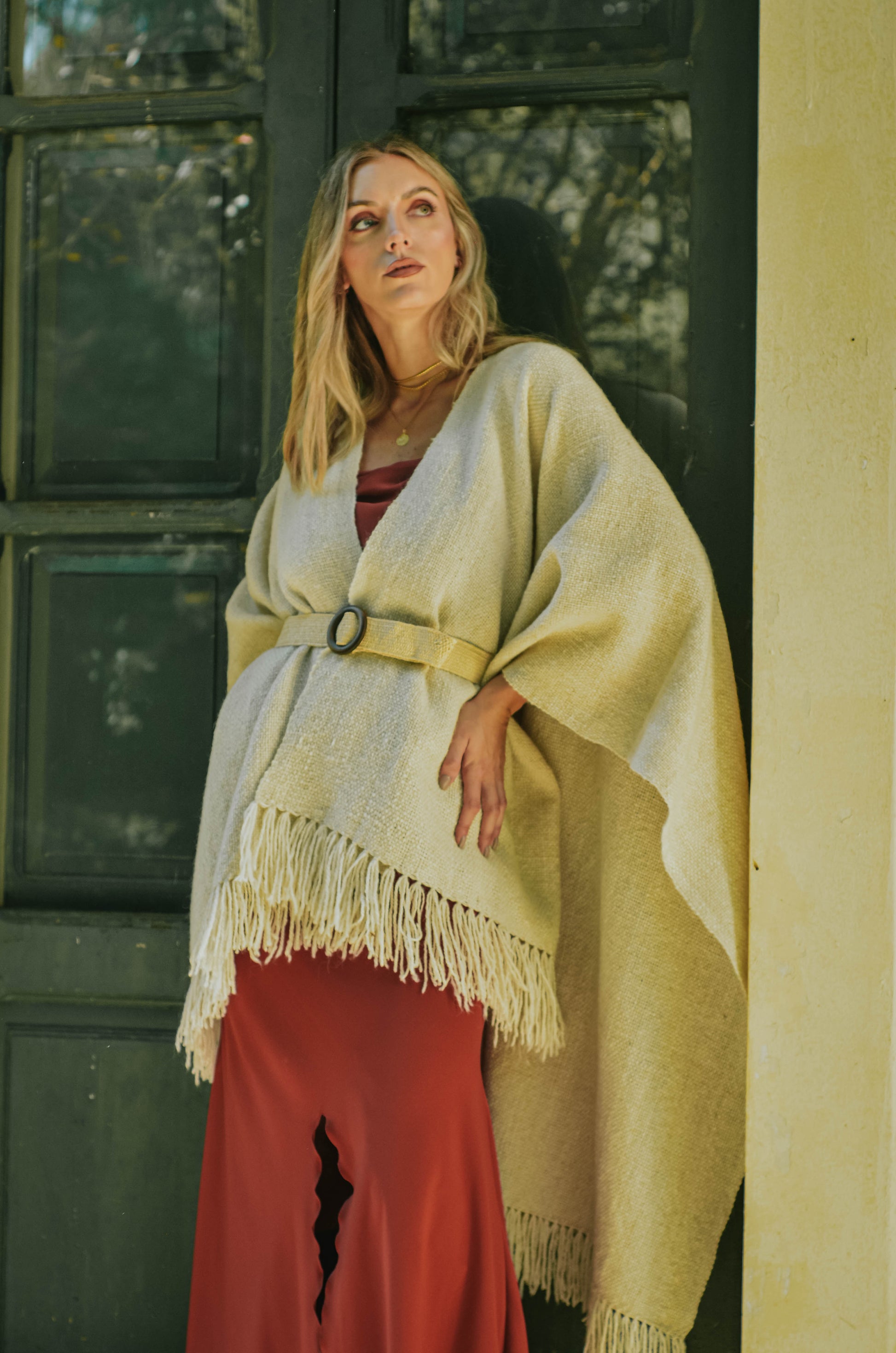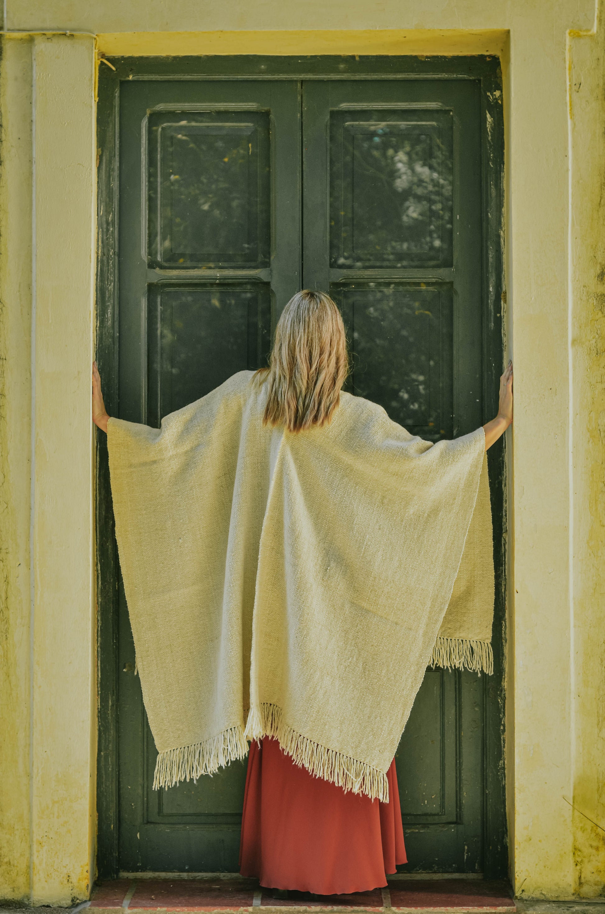 Ruana "Shuta" está hecha a mano en telar rústico con hilos de lana de oveja.
