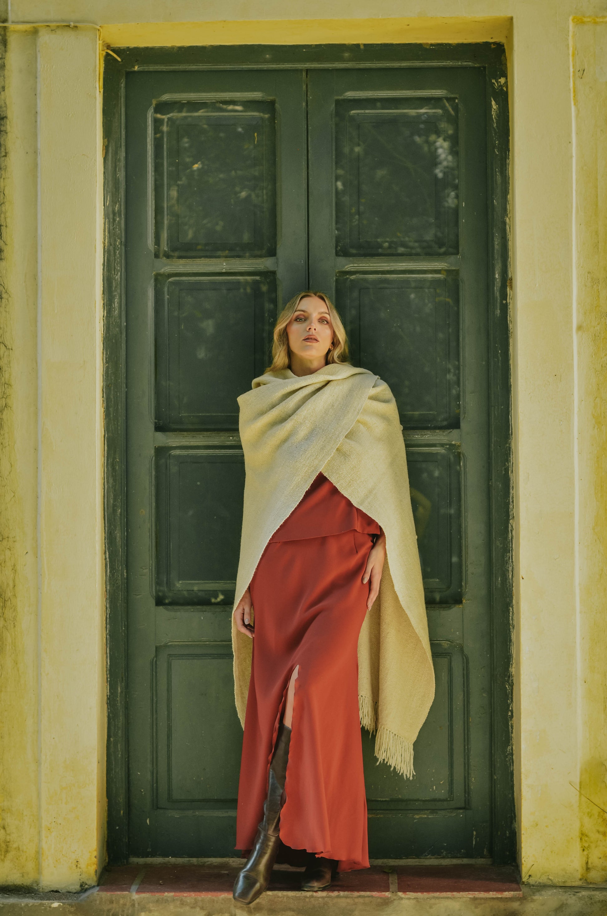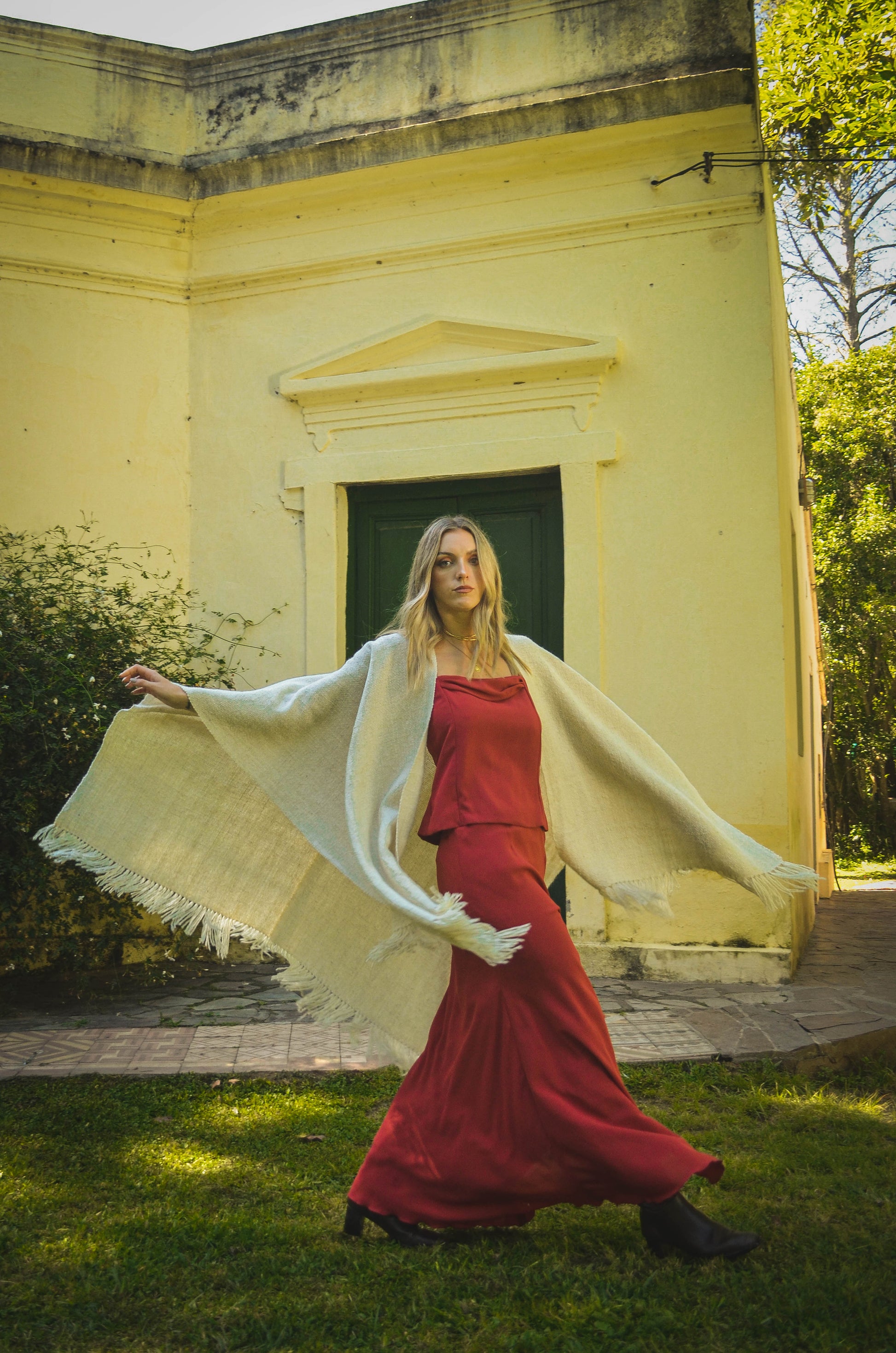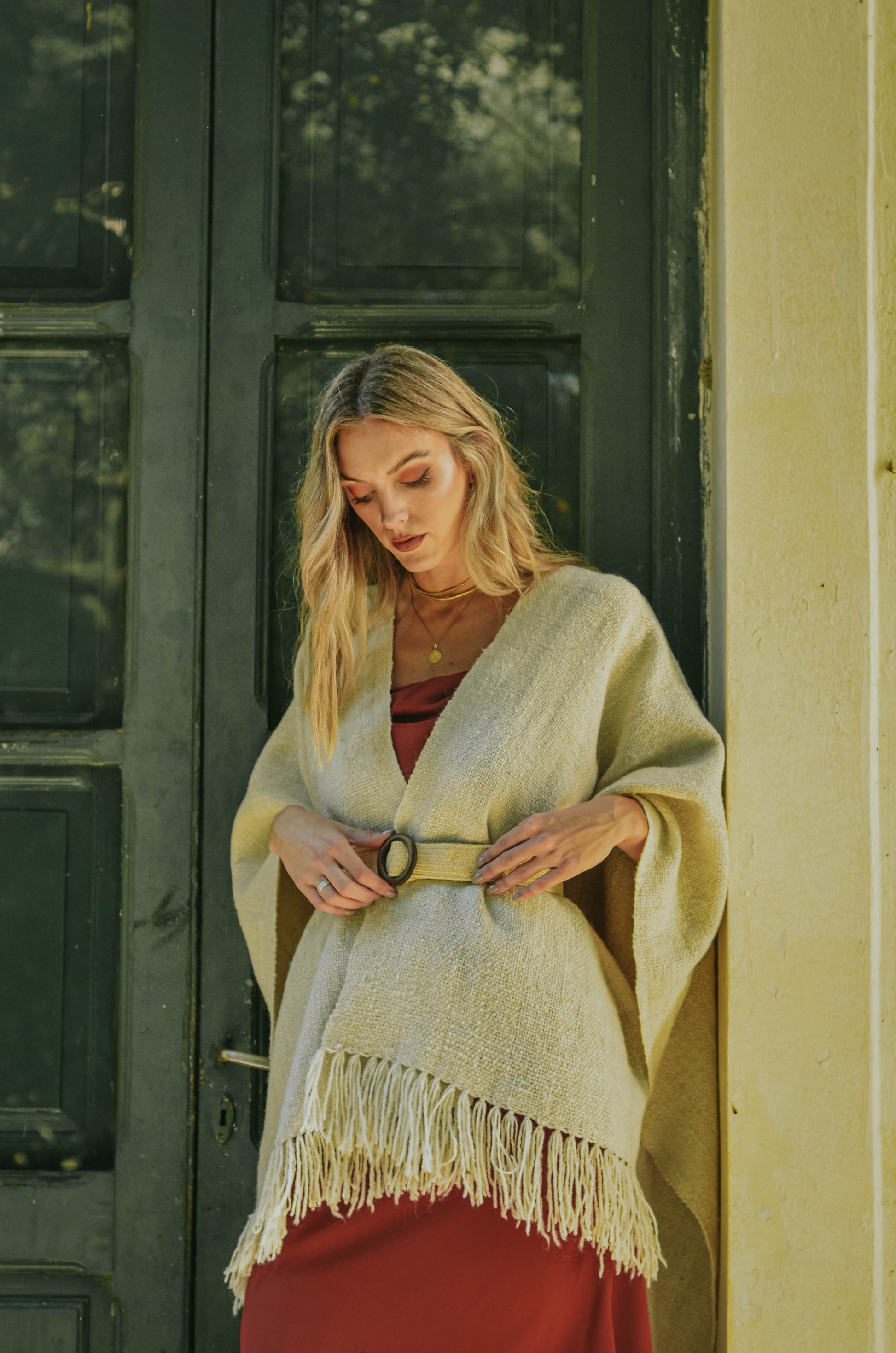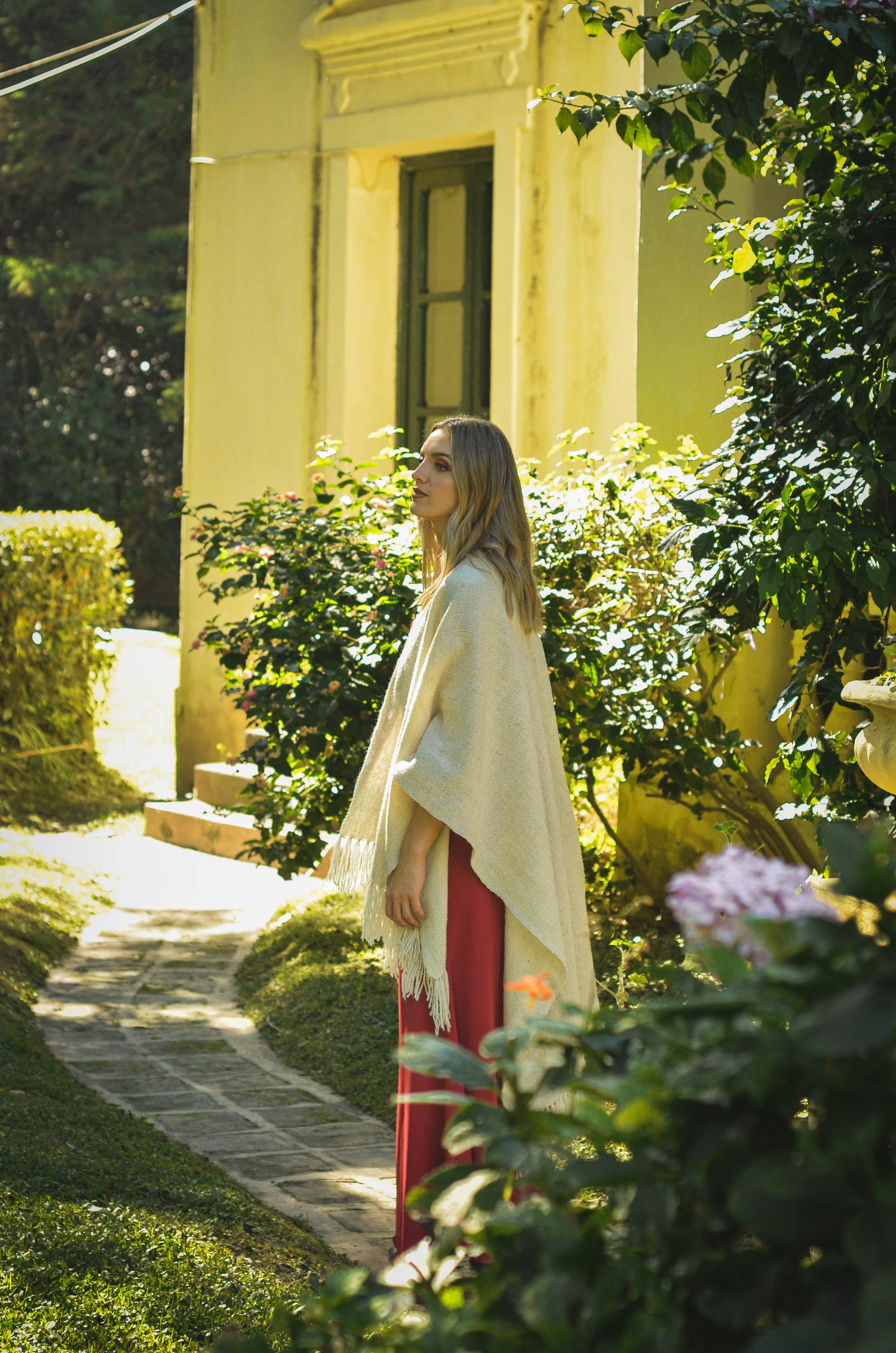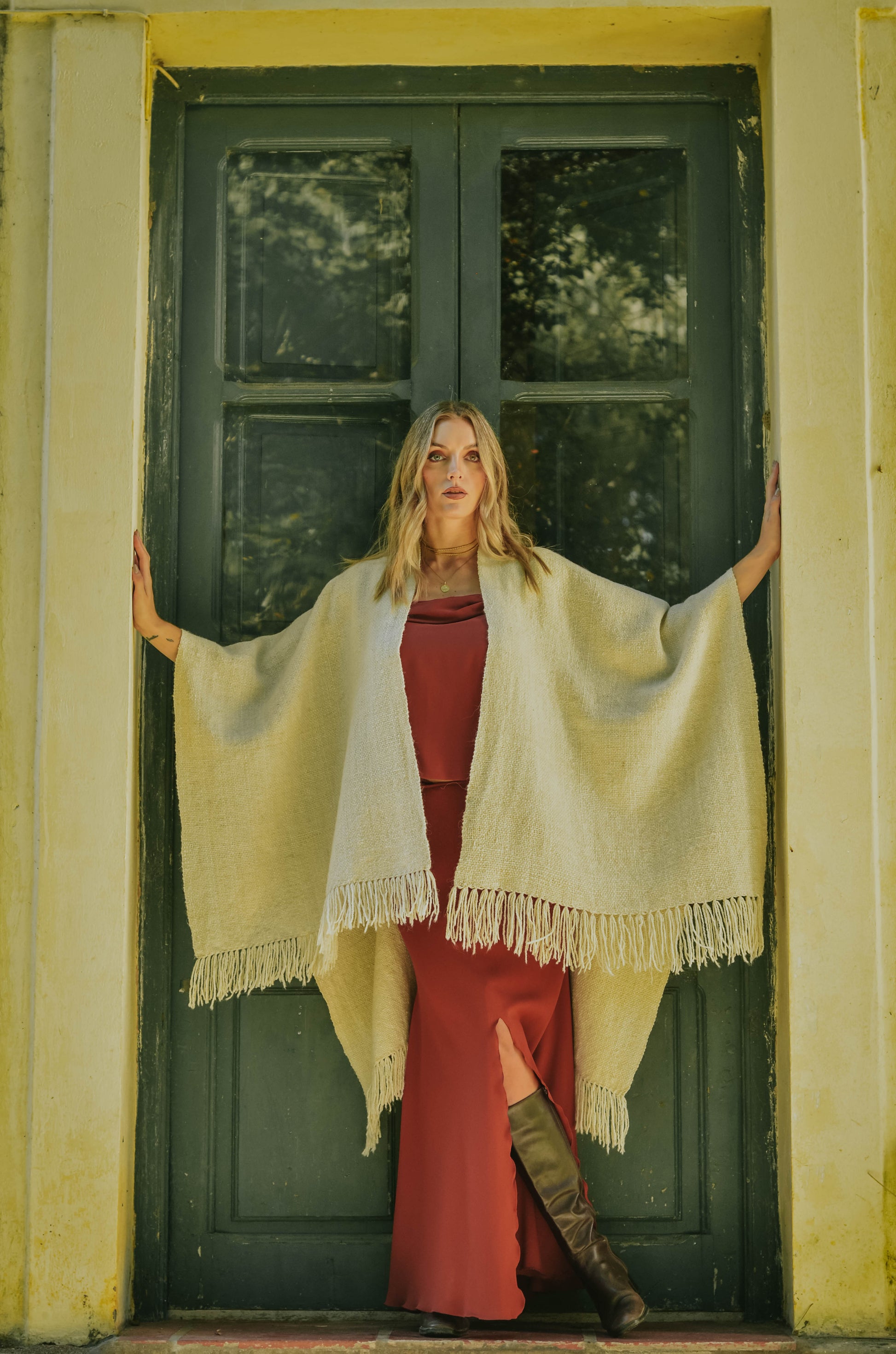 Ruana "Shuta" está hecha a mano en telar rústico con hilos de lana de oveja.