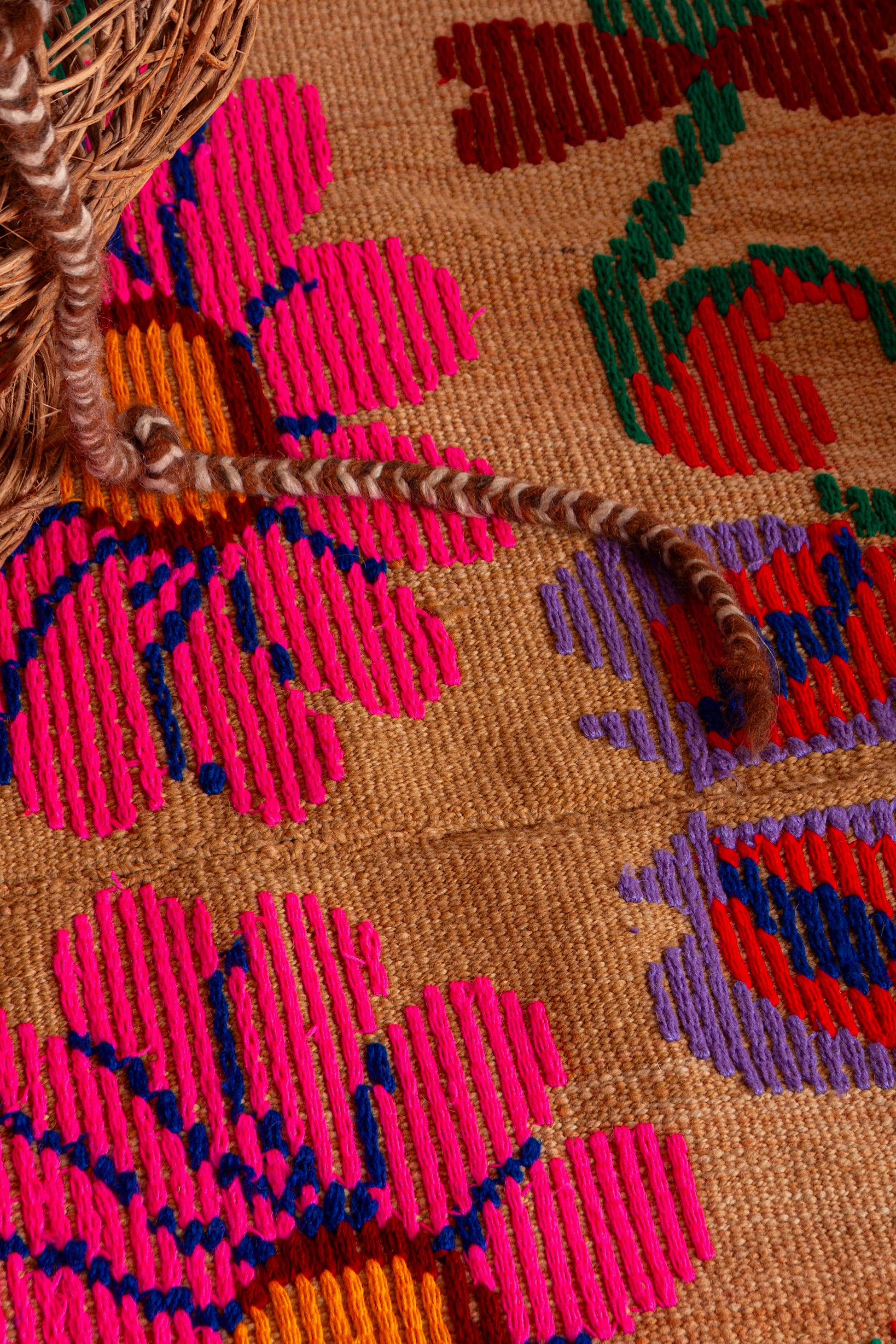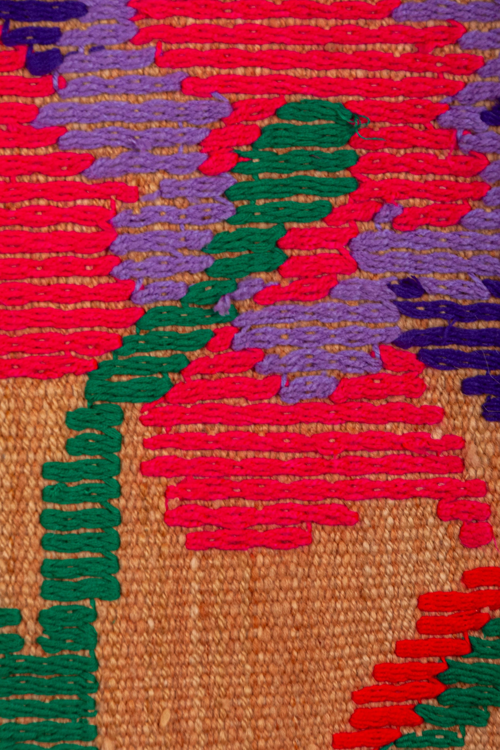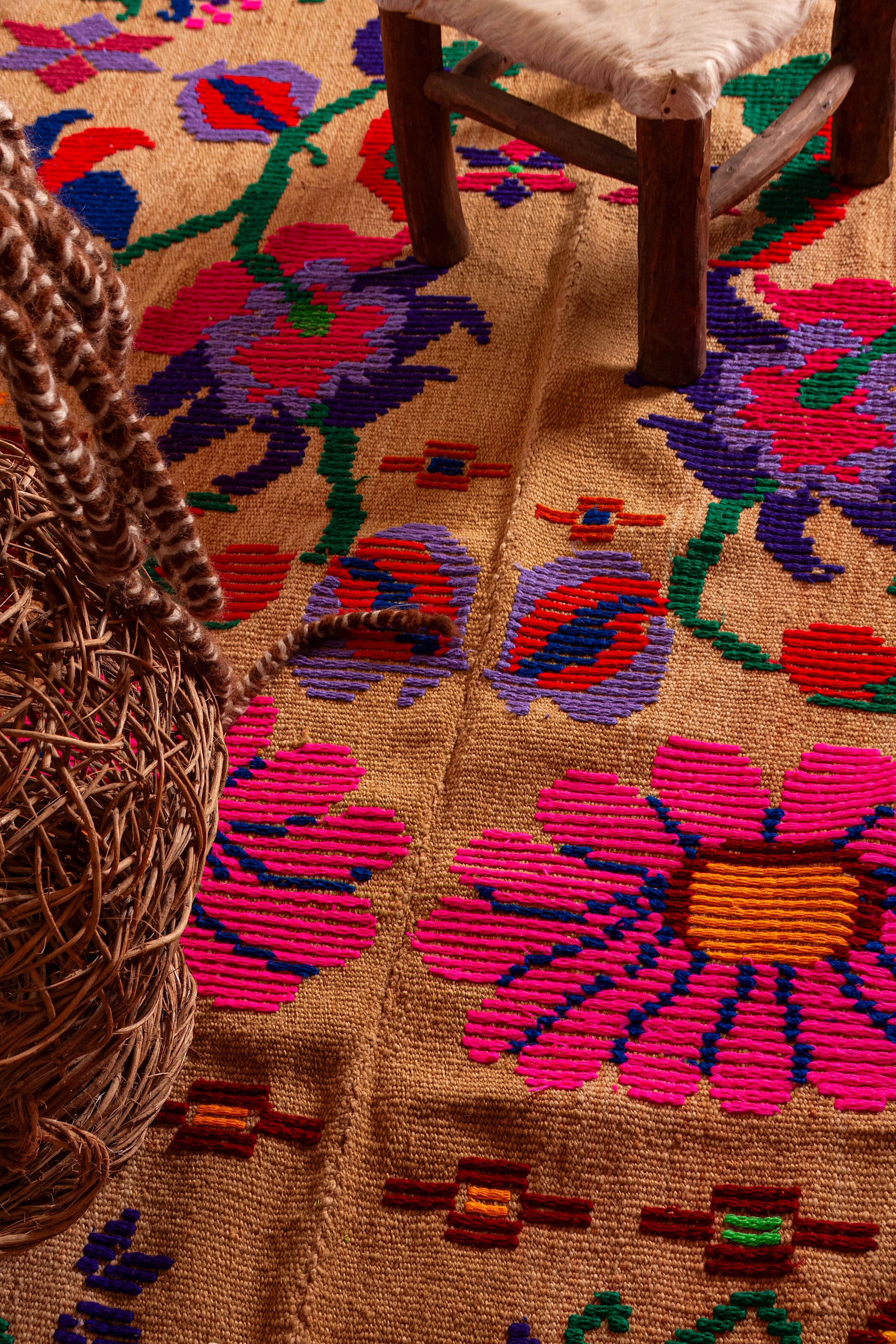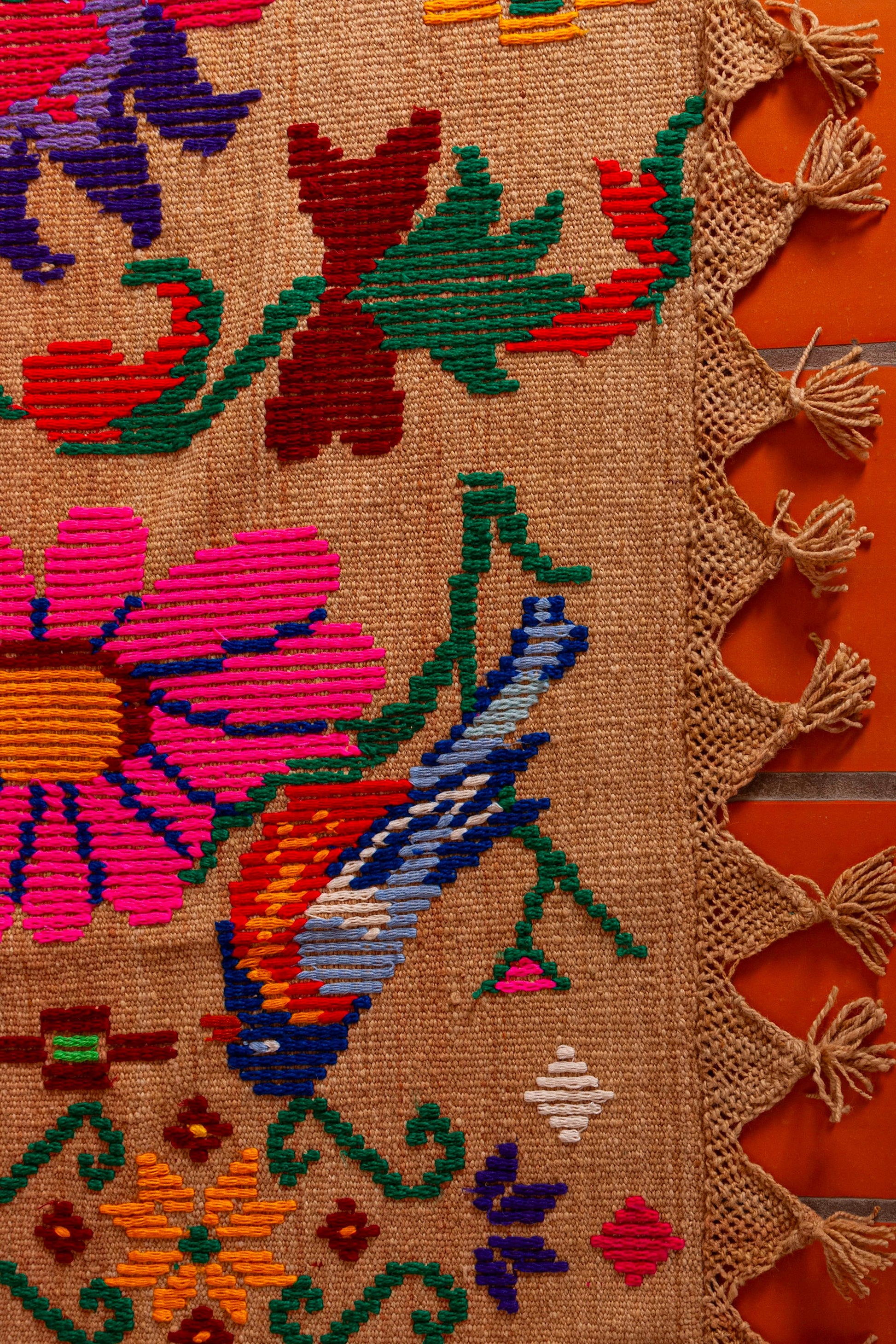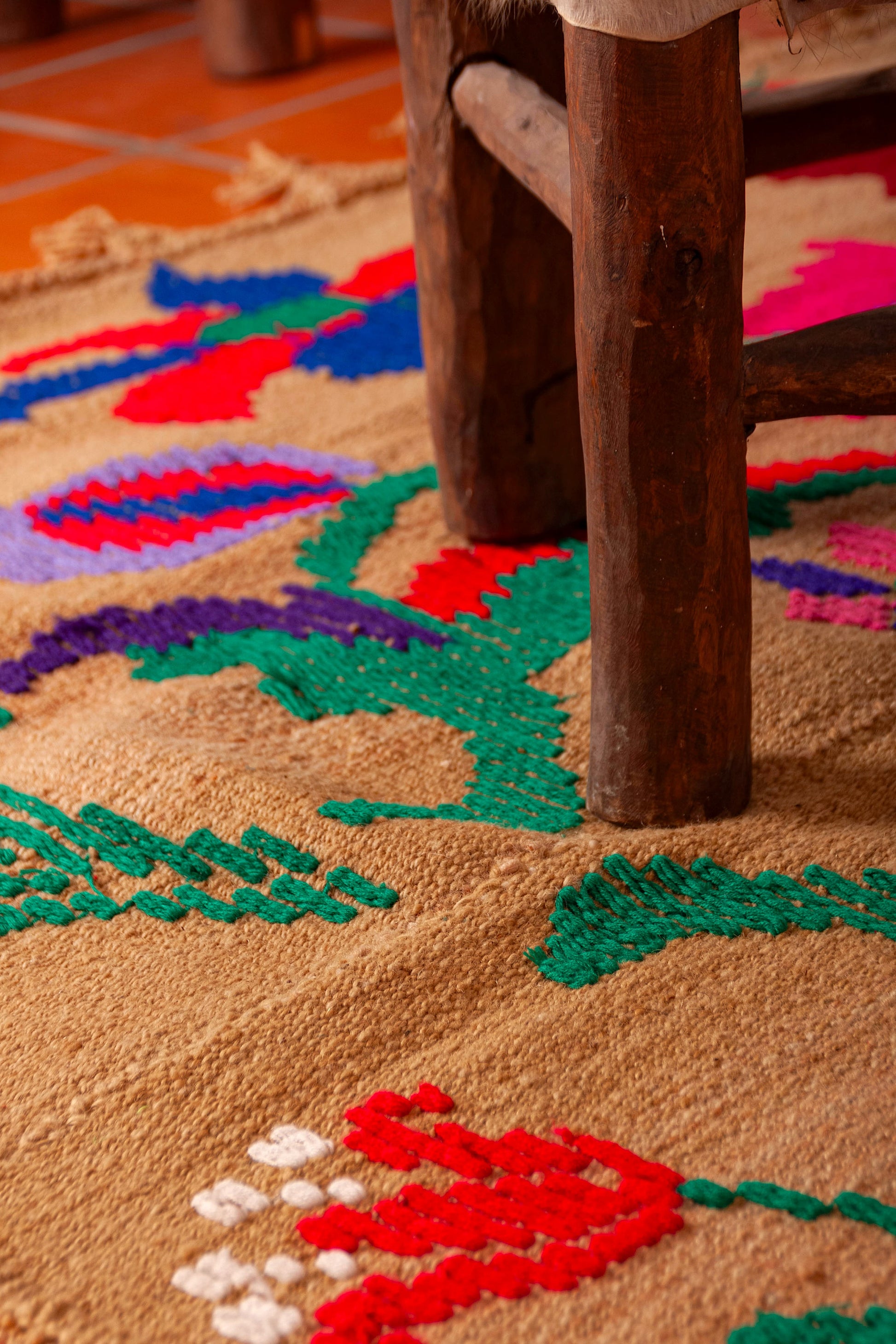 Alfombra "Jujuy" es de lana de oveja, hecha a mano en telar rústico y bordada artesanalmente.