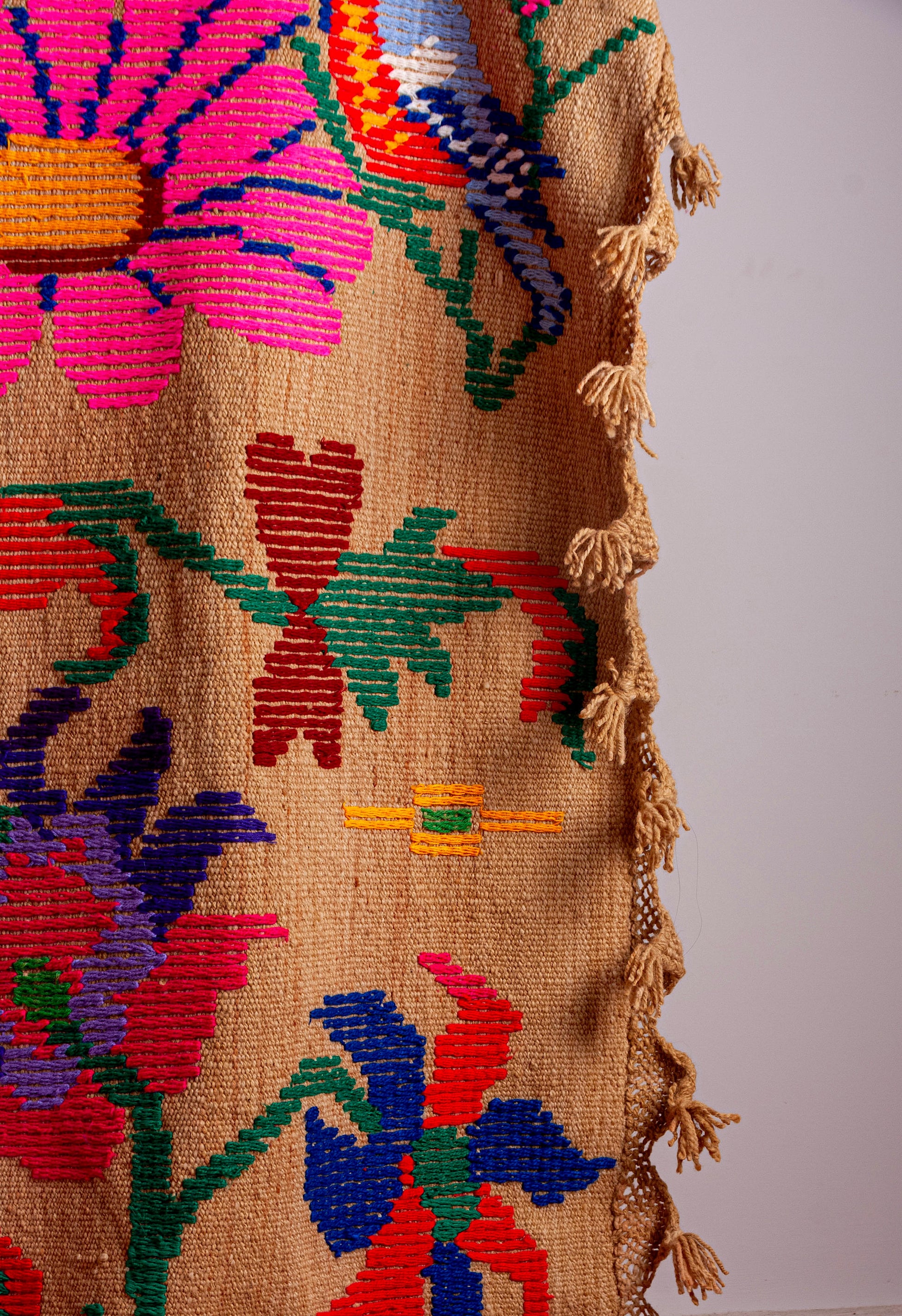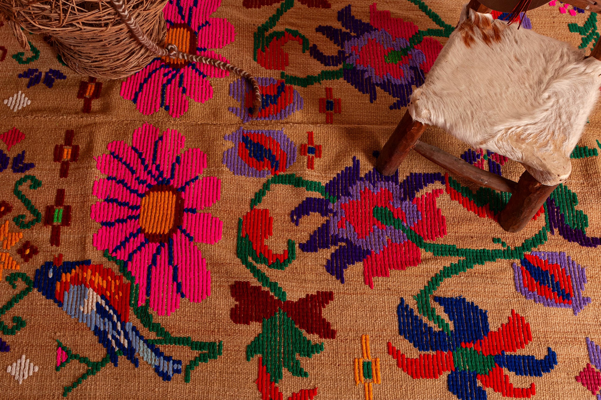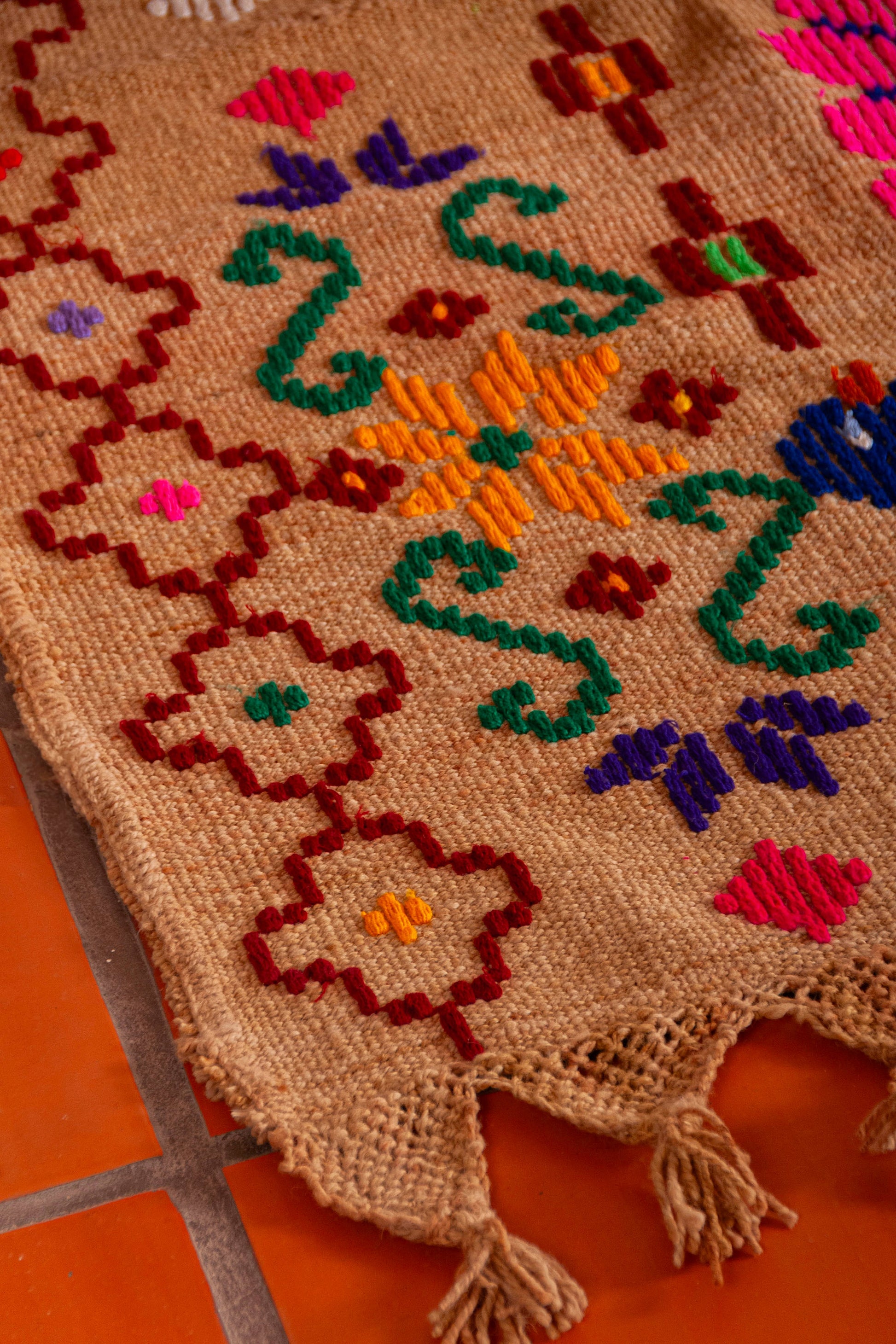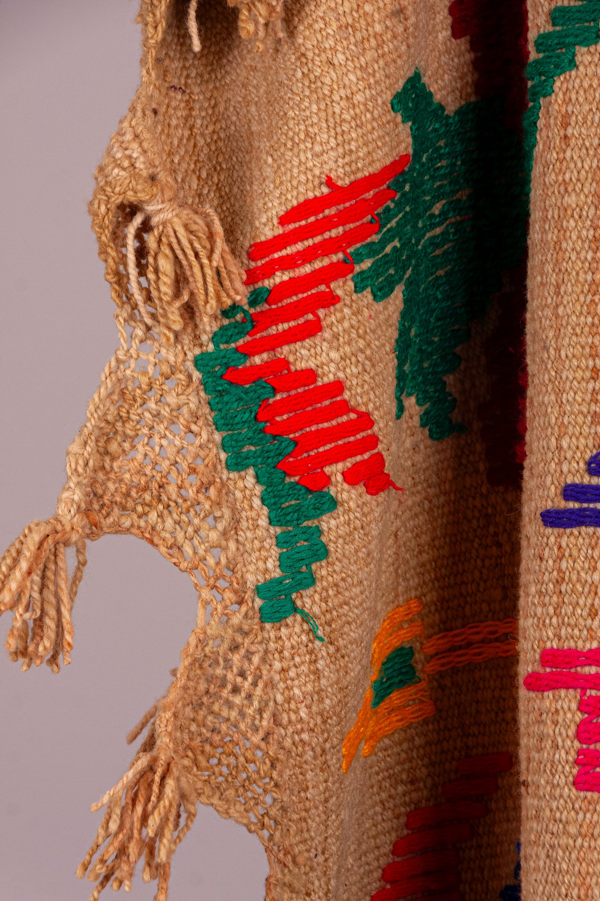 Alfombra "Jujuy" es de lana de oveja, hecha a mano en telar rústico y bordada artesanalmente.