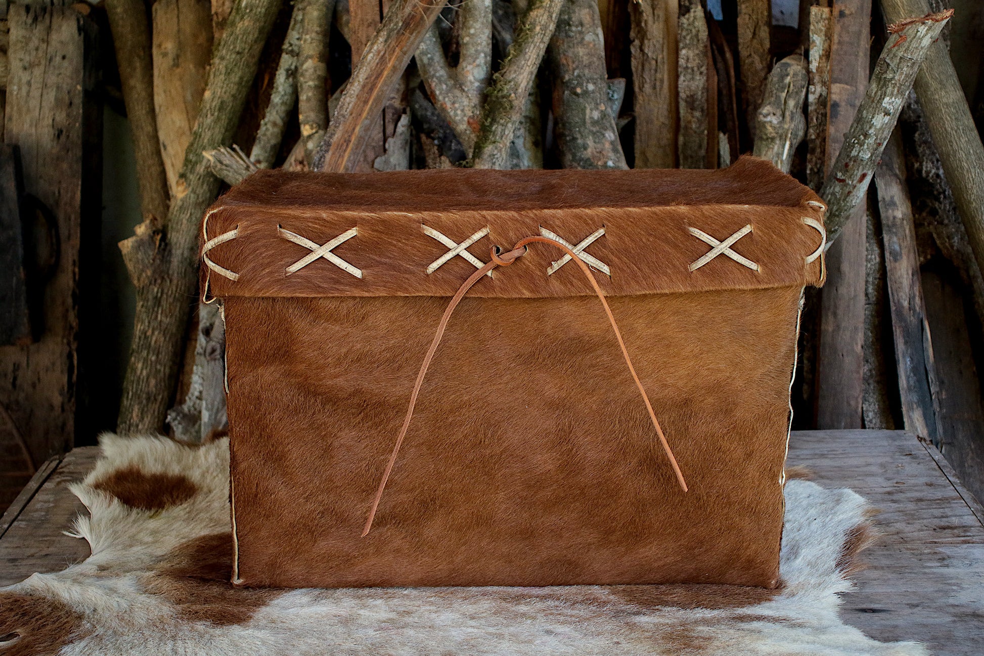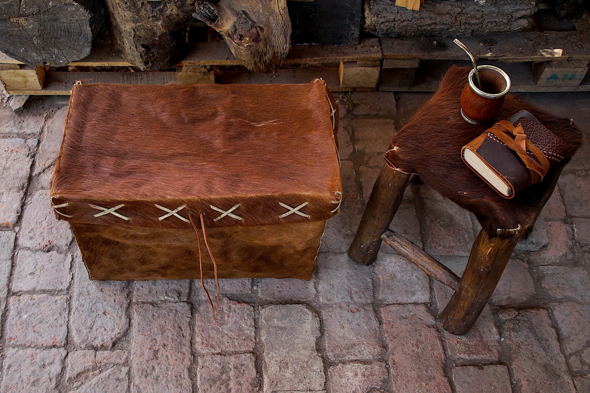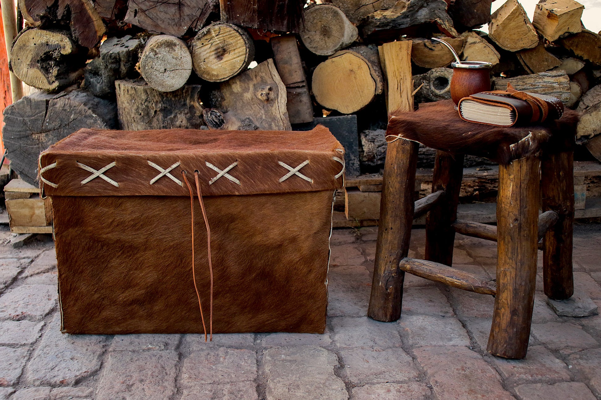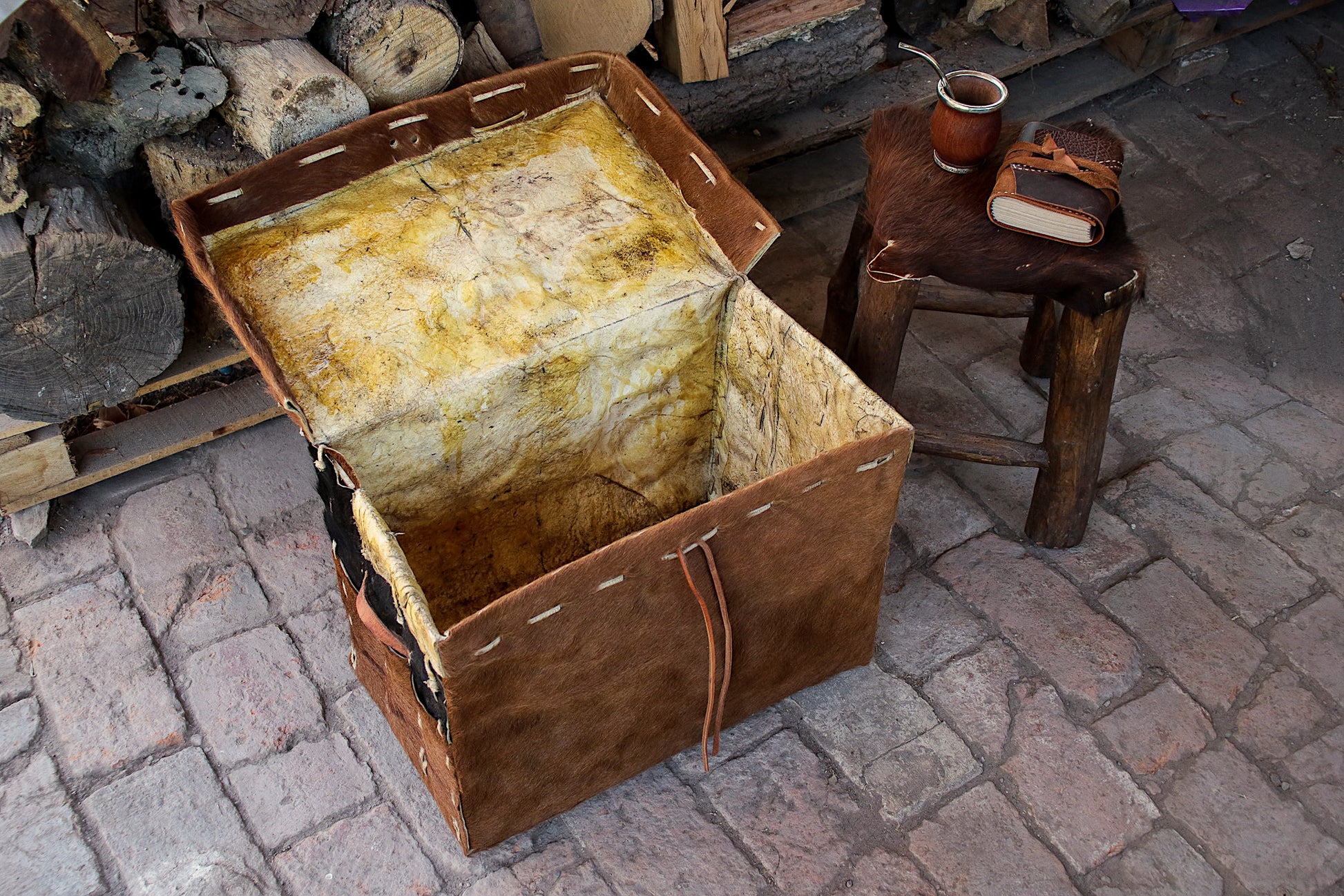 Baúl de cuero natural hecho a mano desde una sola pieza y cocido con tientos.