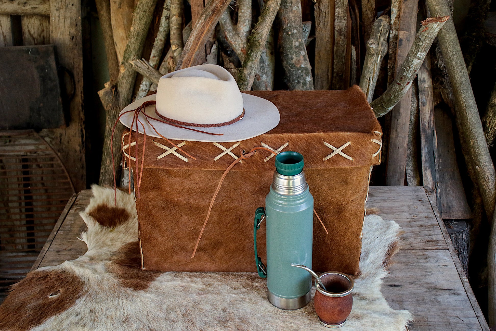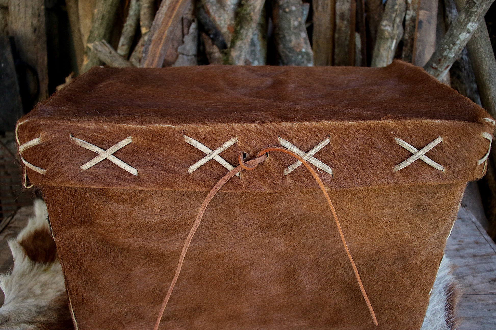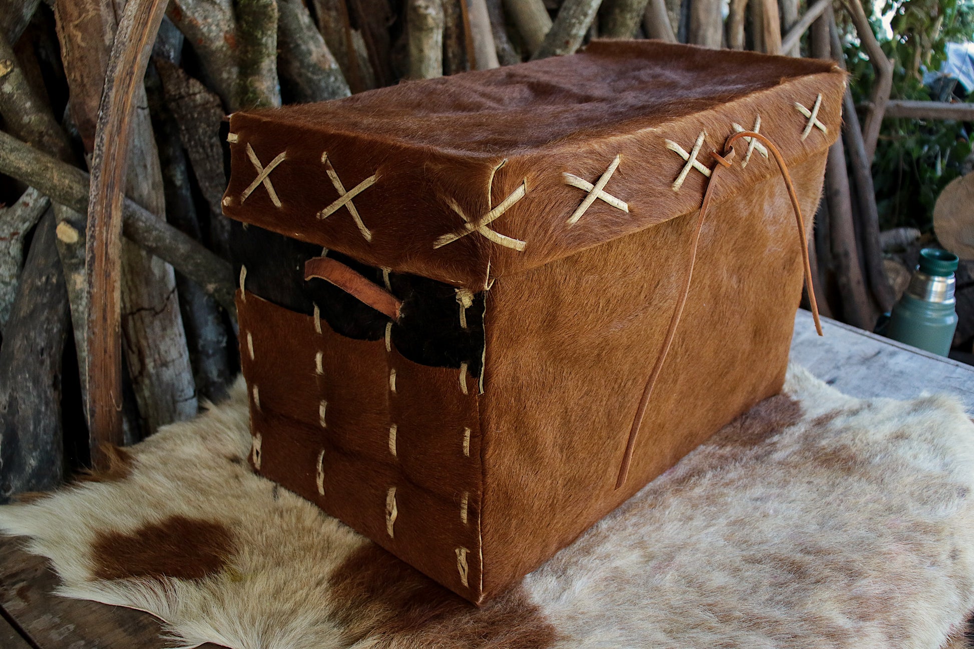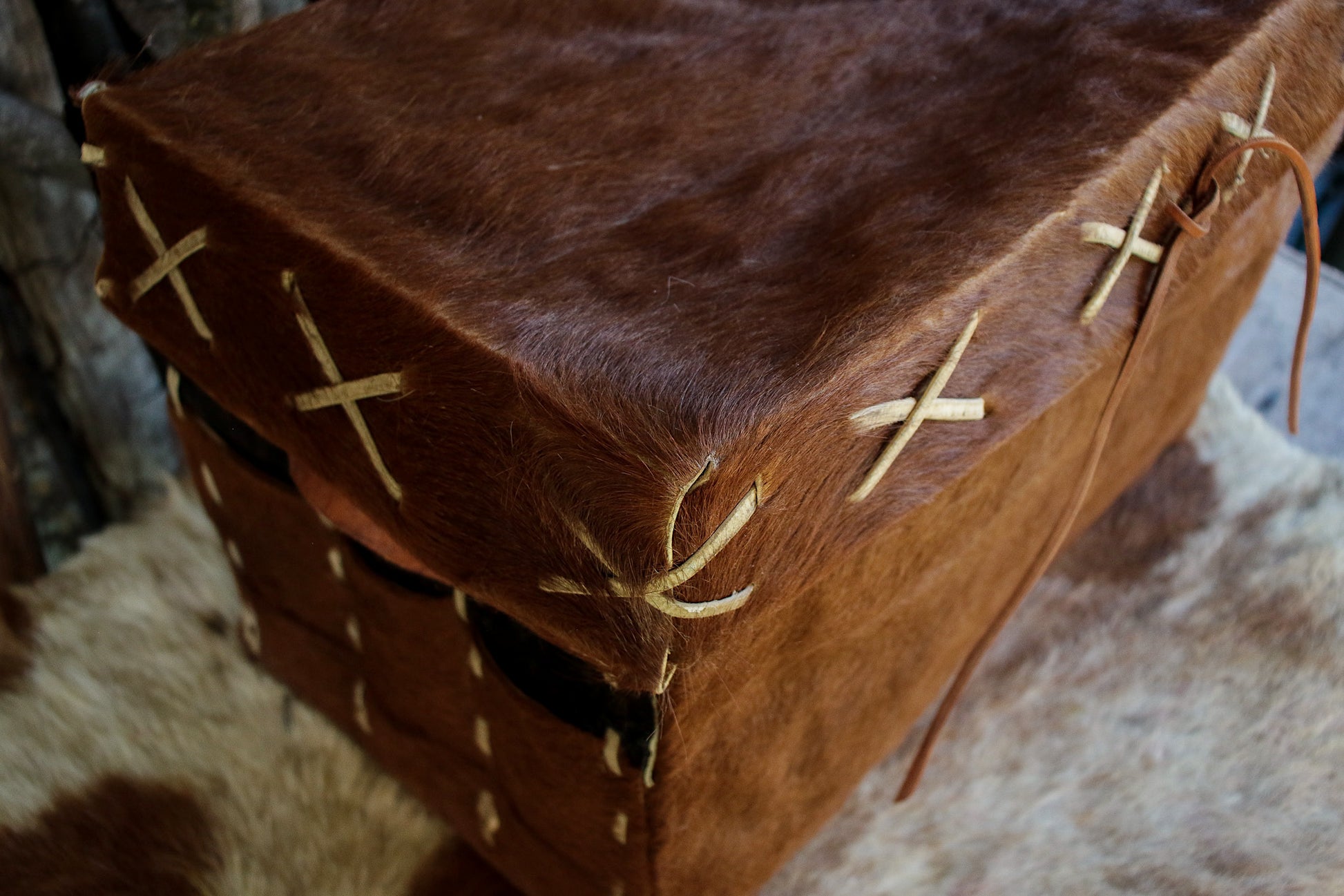 Baúl de cuero natural hecho a mano desde una sola pieza y cocido con tientos.