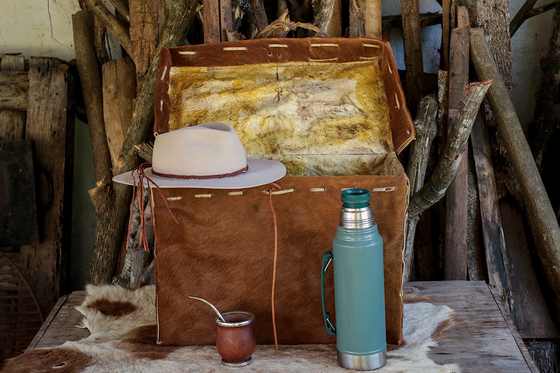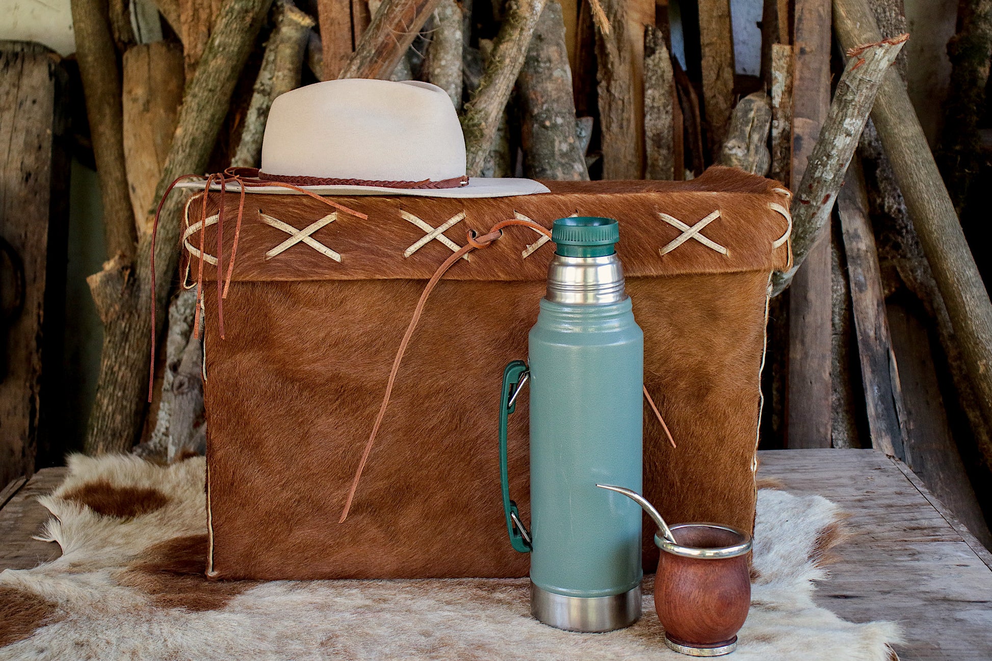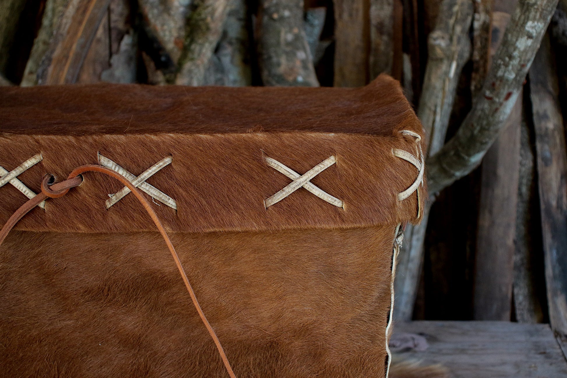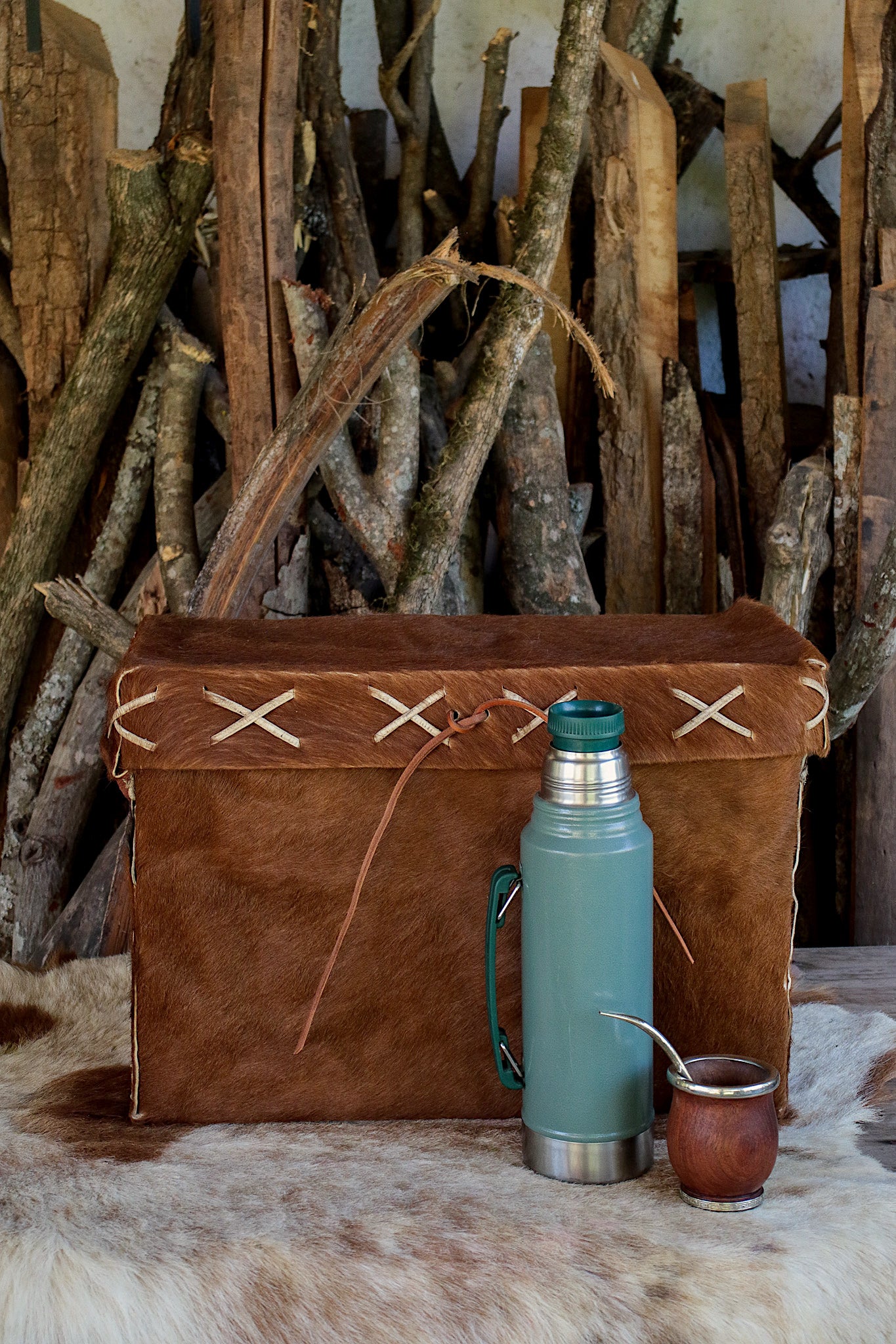 Baúl de cuero natural hecho a mano desde una sola pieza y cocido con tientos.