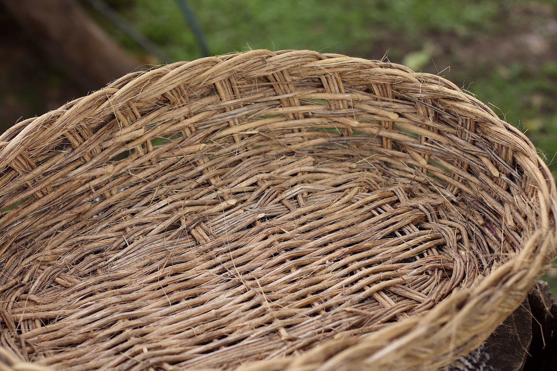 Las ramas se recolectan a mano y se "curan" se limpian los gajos con cuchillo uno por uno hasta quedar la vara lisa, el trenzado es natural, todo entrecruzado a mano firme.