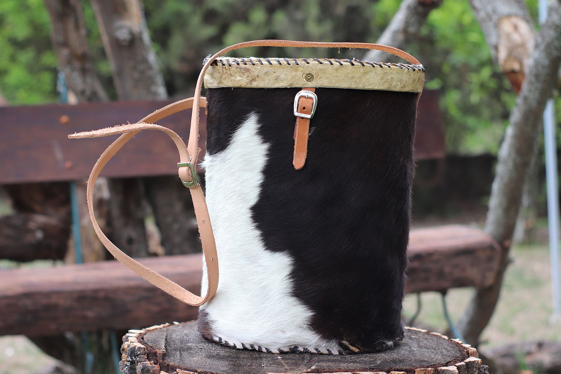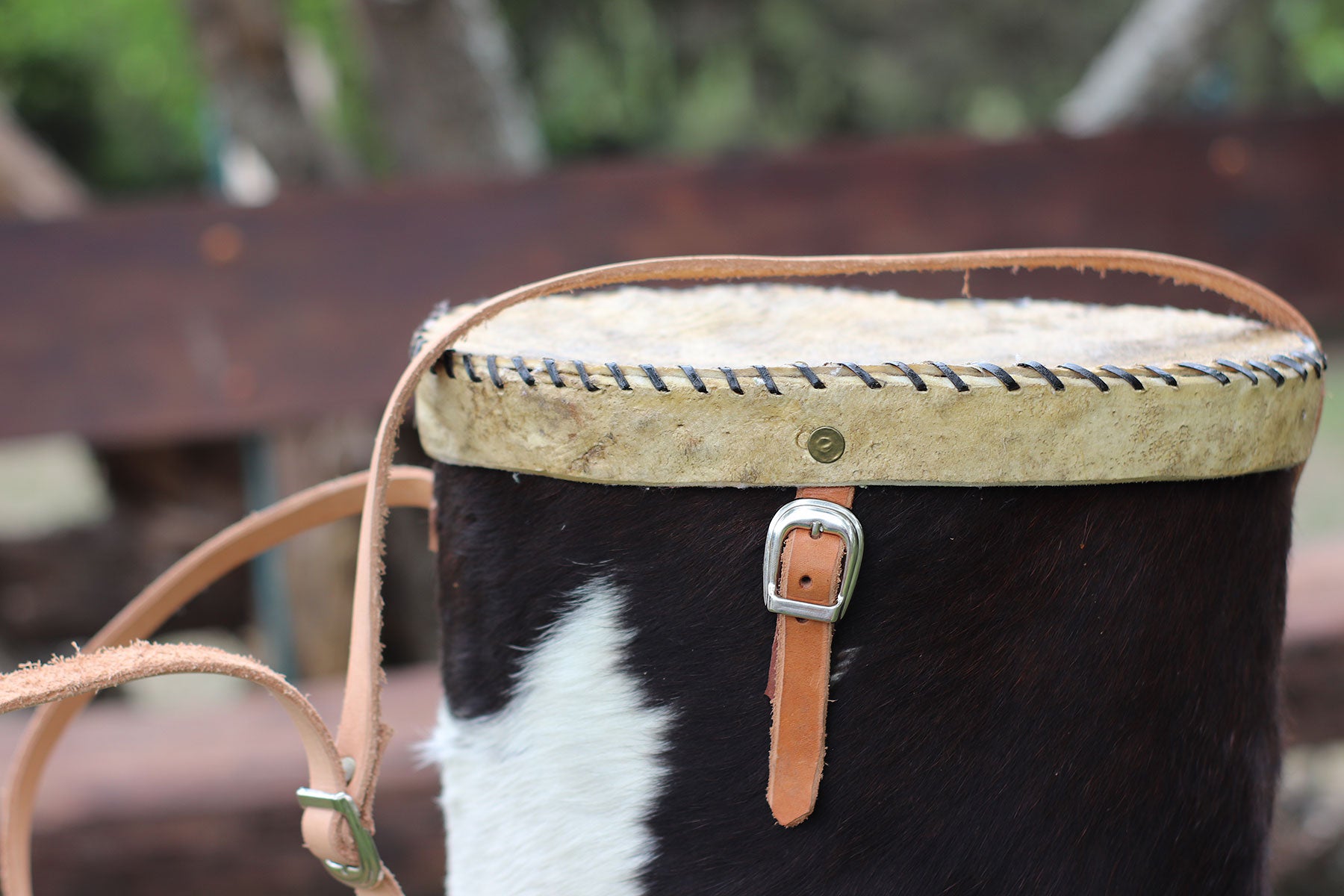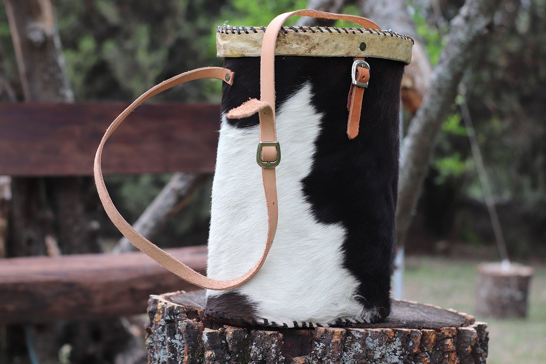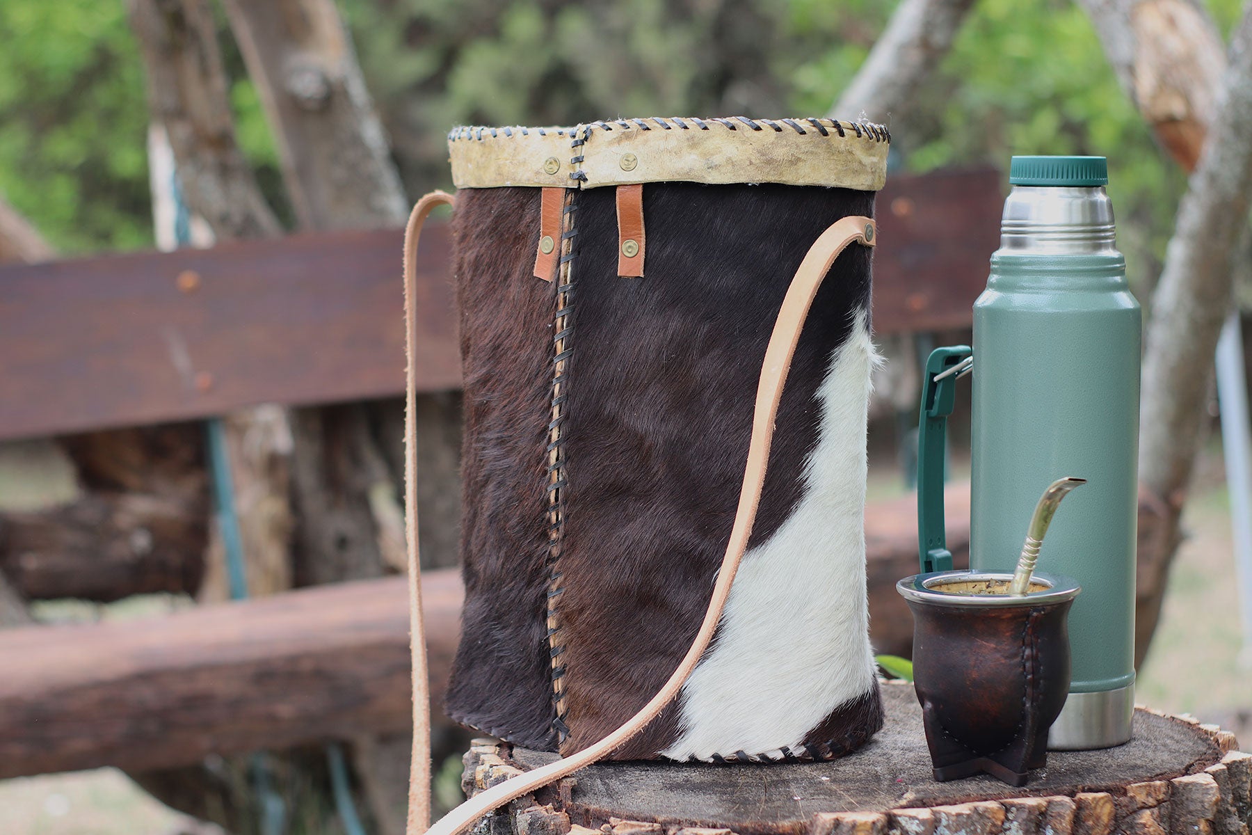 Porta equipo matero de cuero natural de vaca cocido con tientos. El cuero tiene un trabajo de casi 60 días para mantener la durabilidad, inocuidad y calidad eterna. La correa es del mismo material y está hecho integramente en forma artesanal.