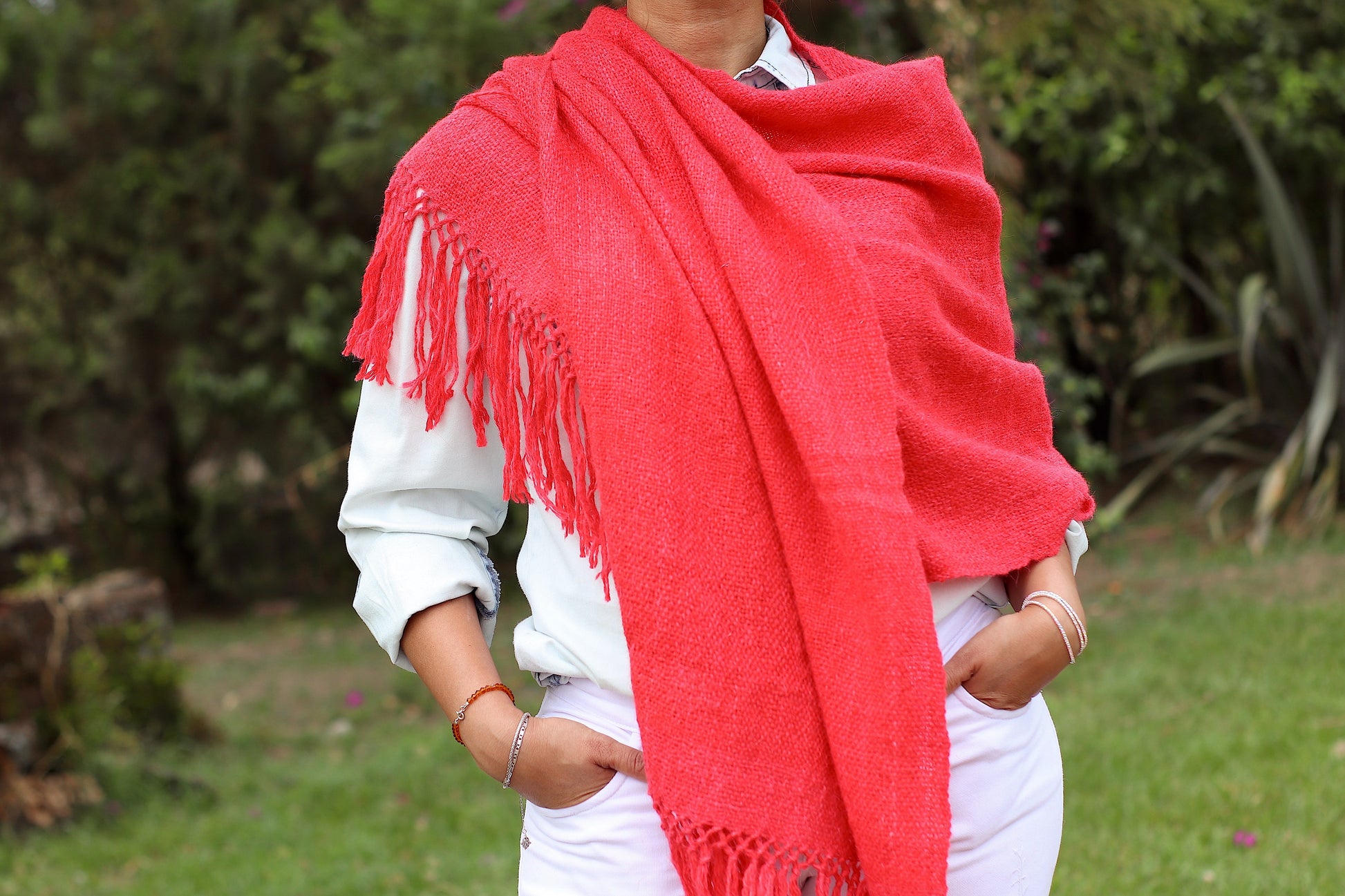 Manta hecha artesanalmente en telar rústico con hilos de llama baby.
