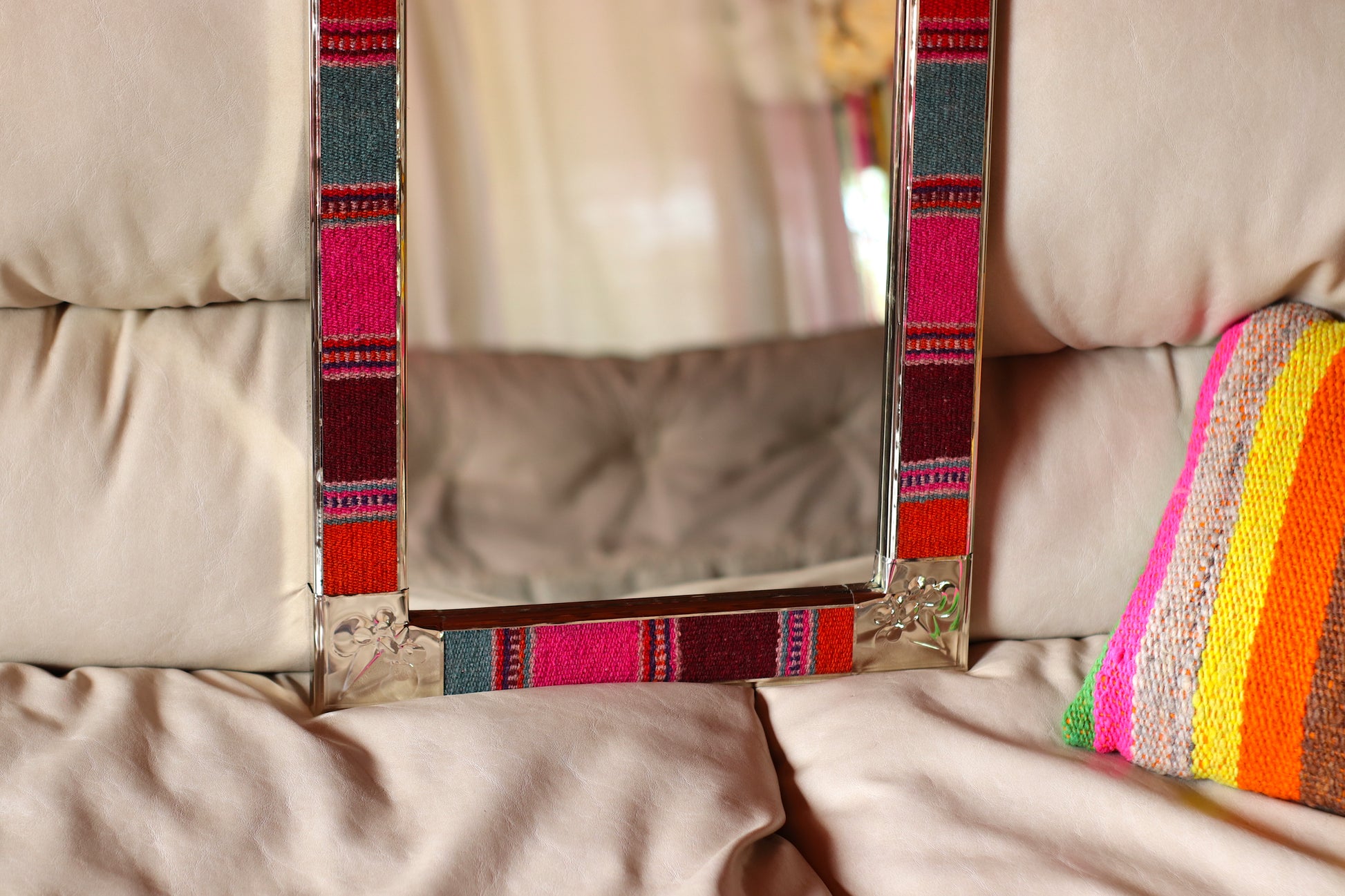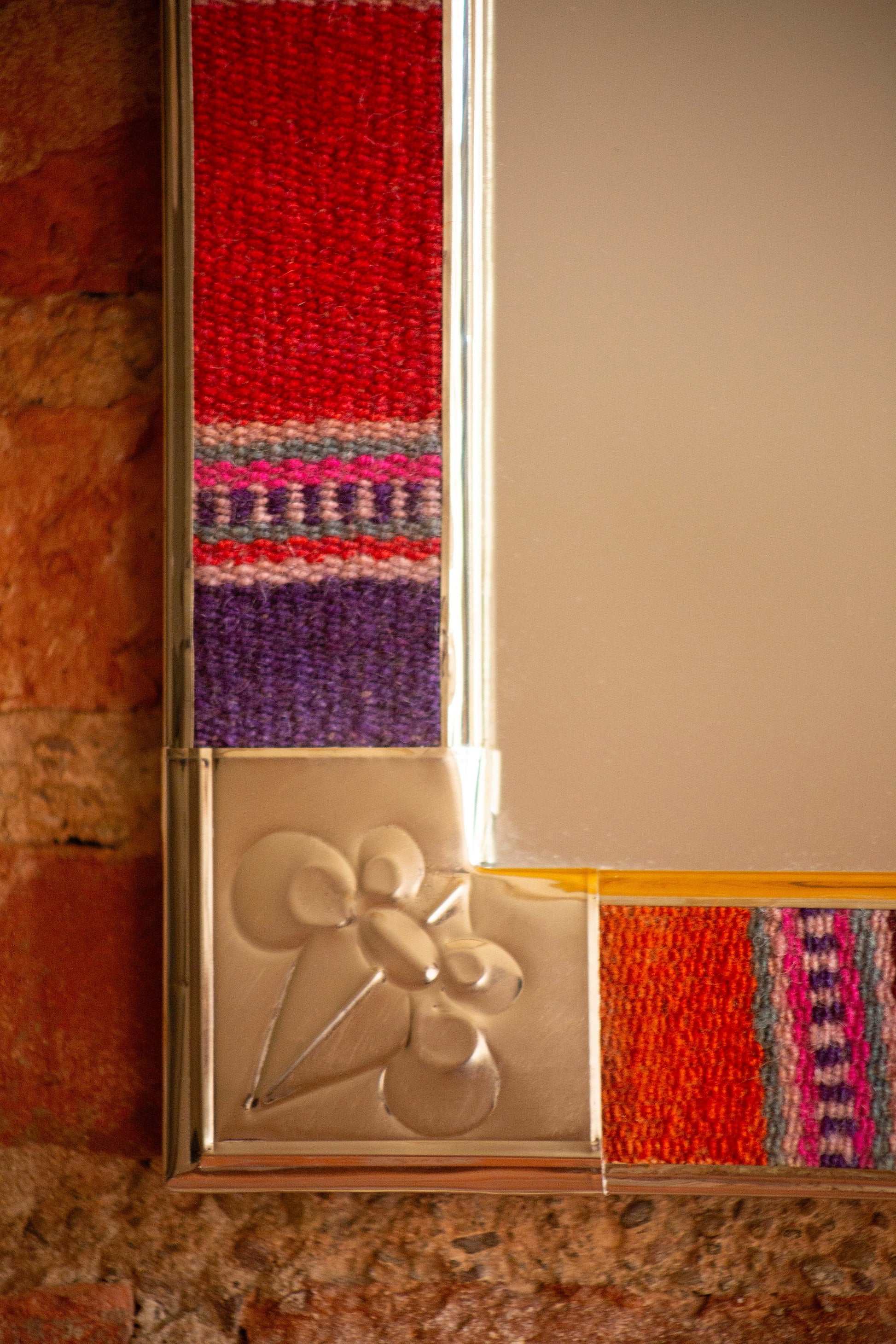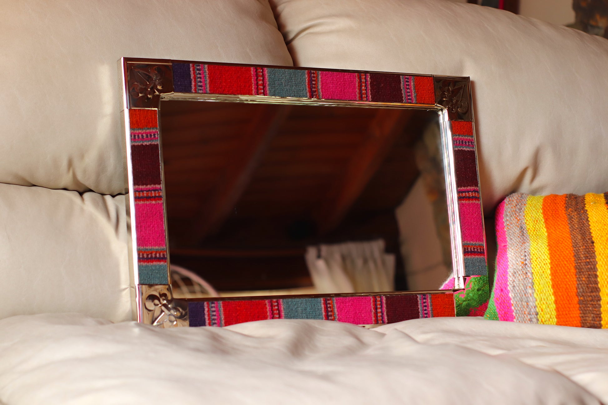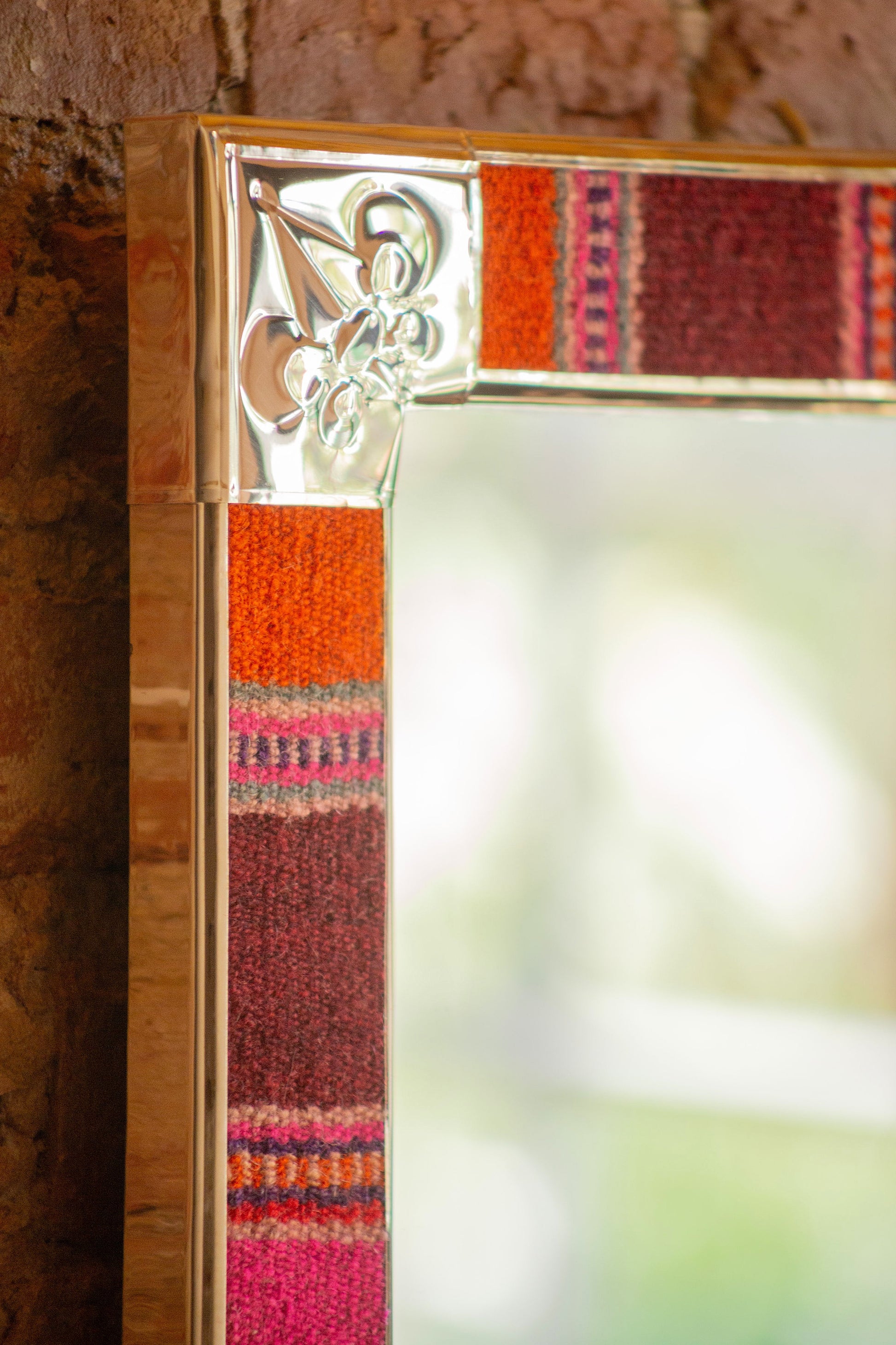 Espejo de diseño andino realizado en marco de madera con bordes de Puyo hecho en telar.