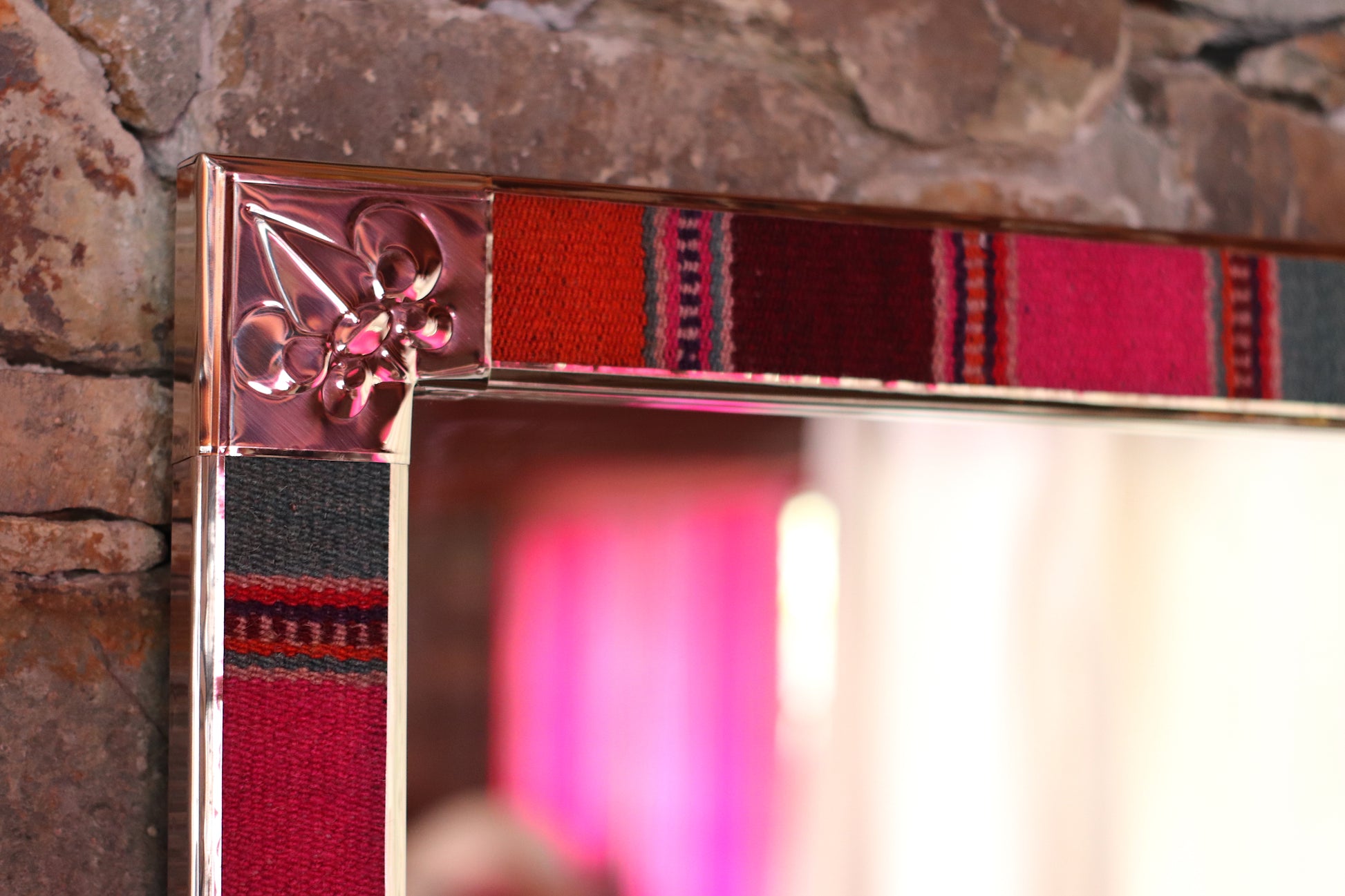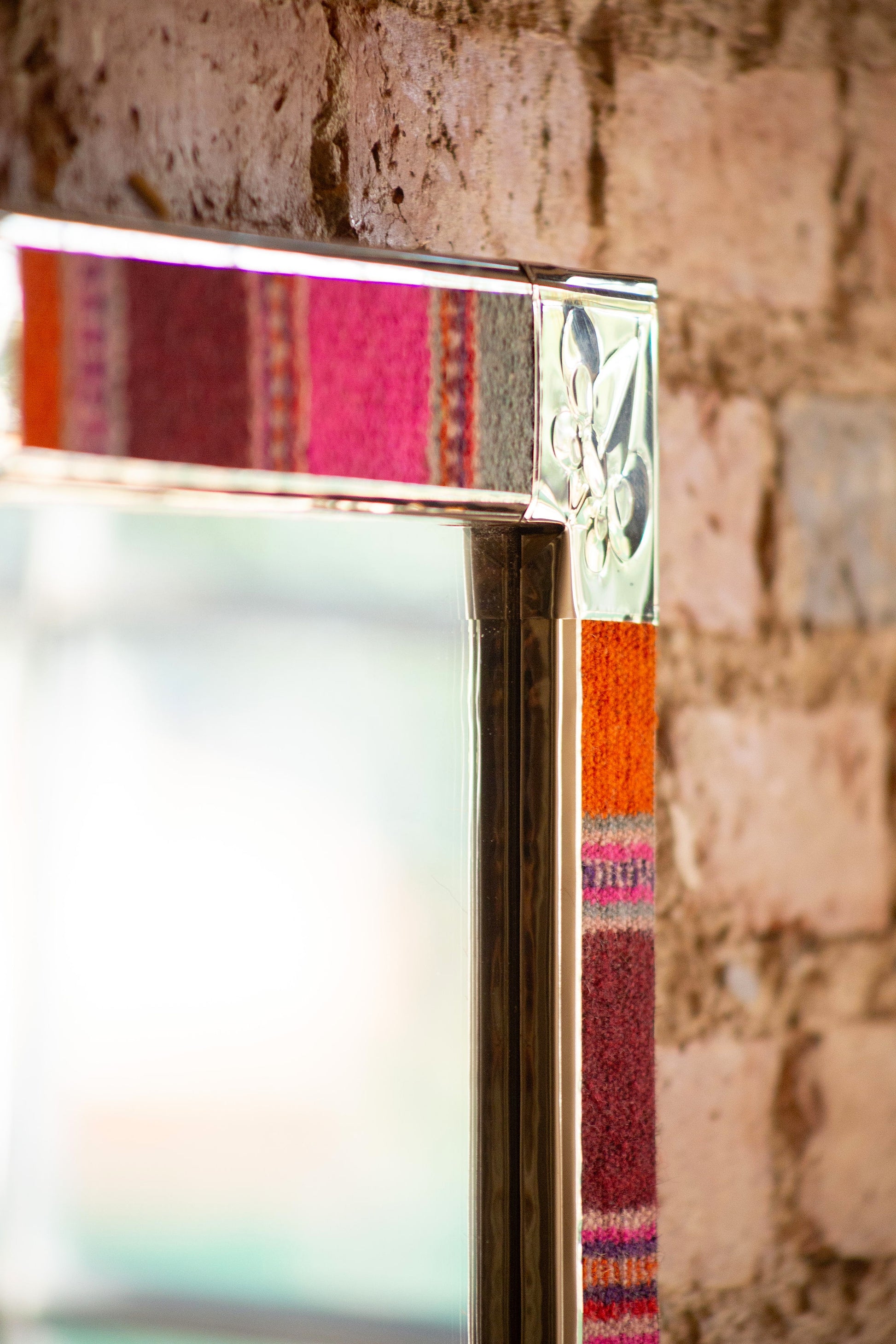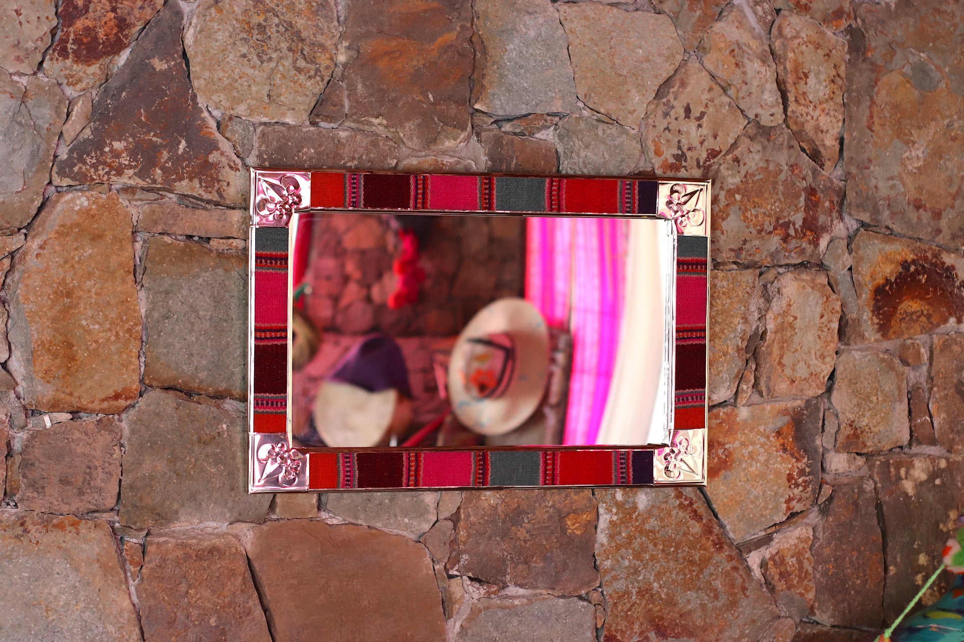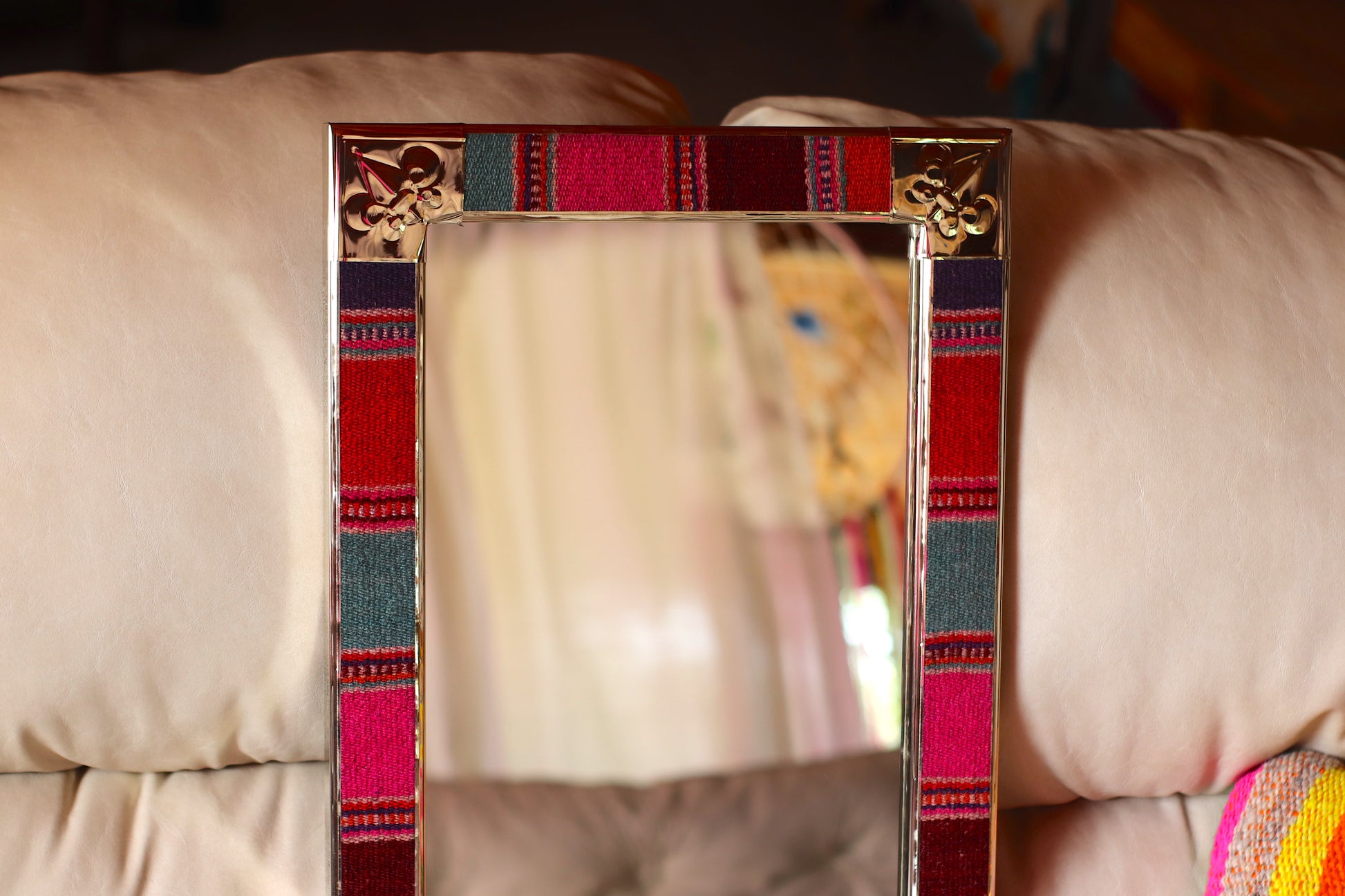 Espejo de diseño andino realizado en marco de madera con bordes de Puyo hecho en telar.