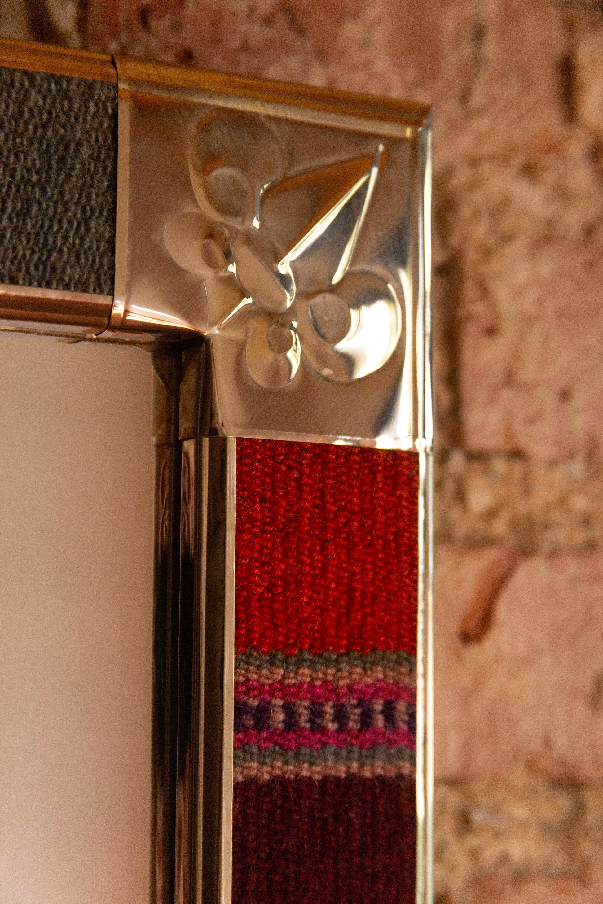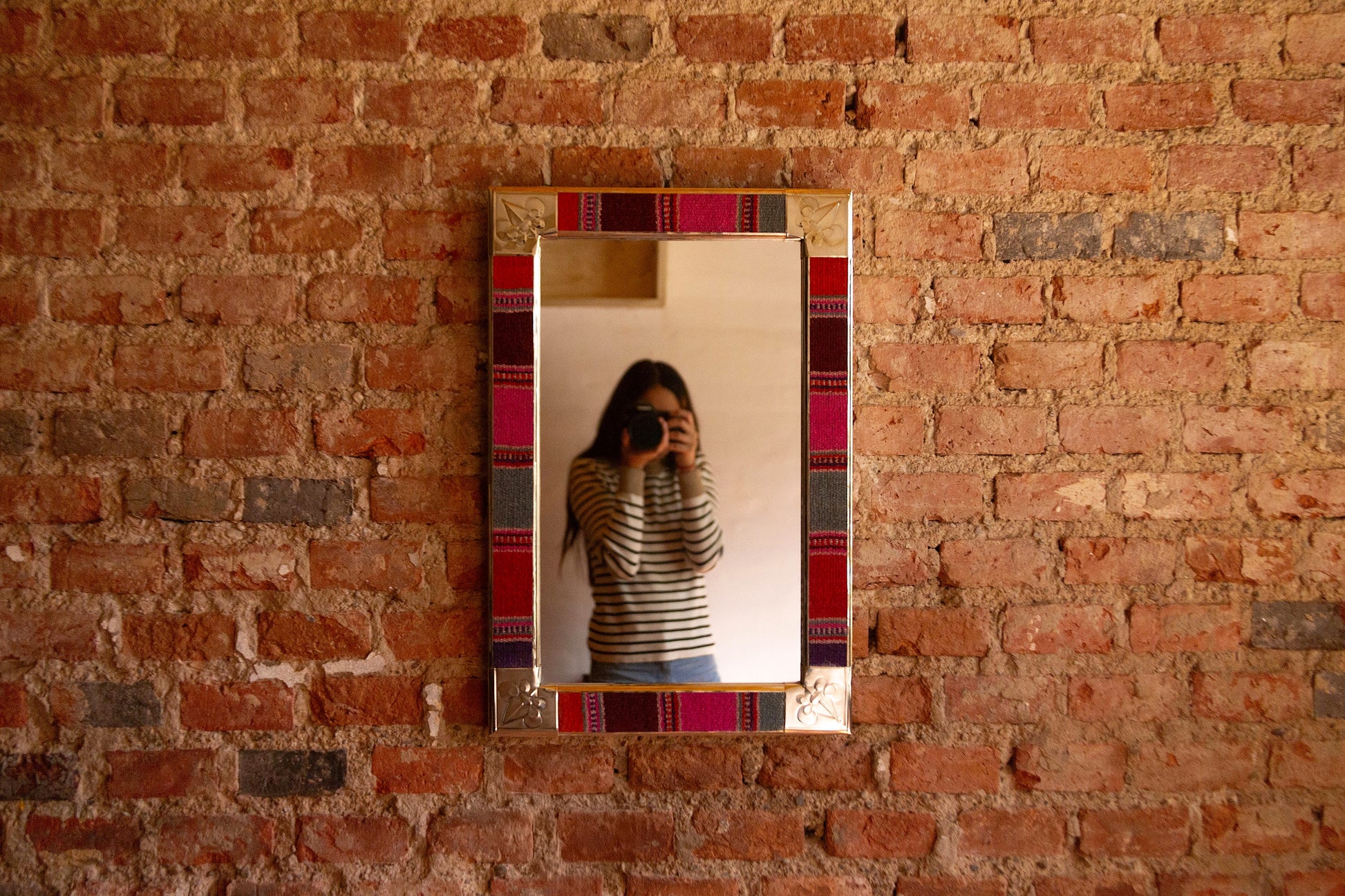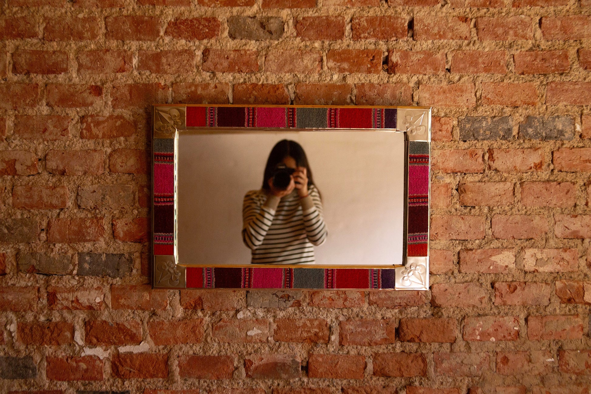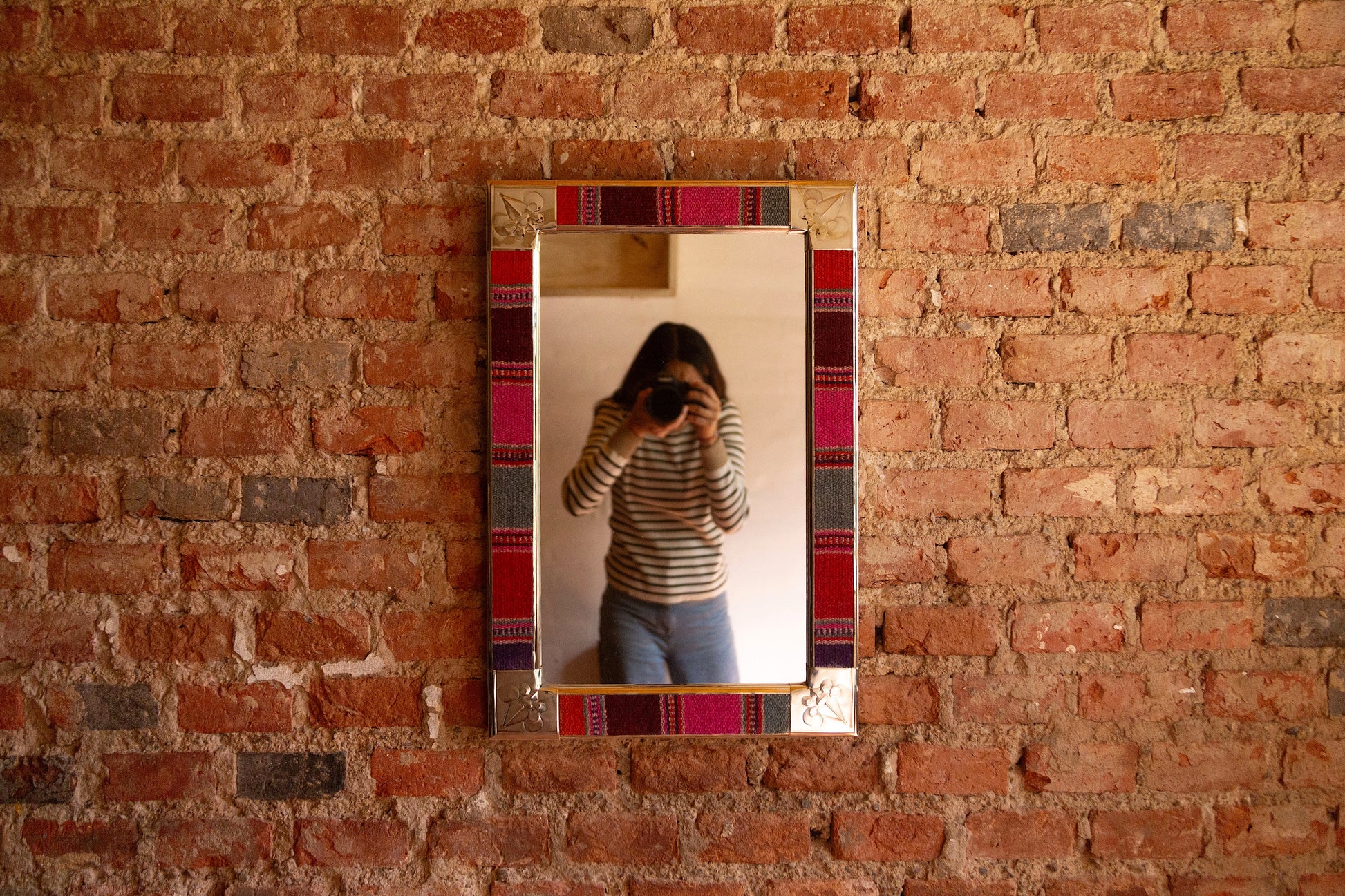 Espejo de diseño andino realizado en marco de madera con bordes de Puyo hecho en telar.