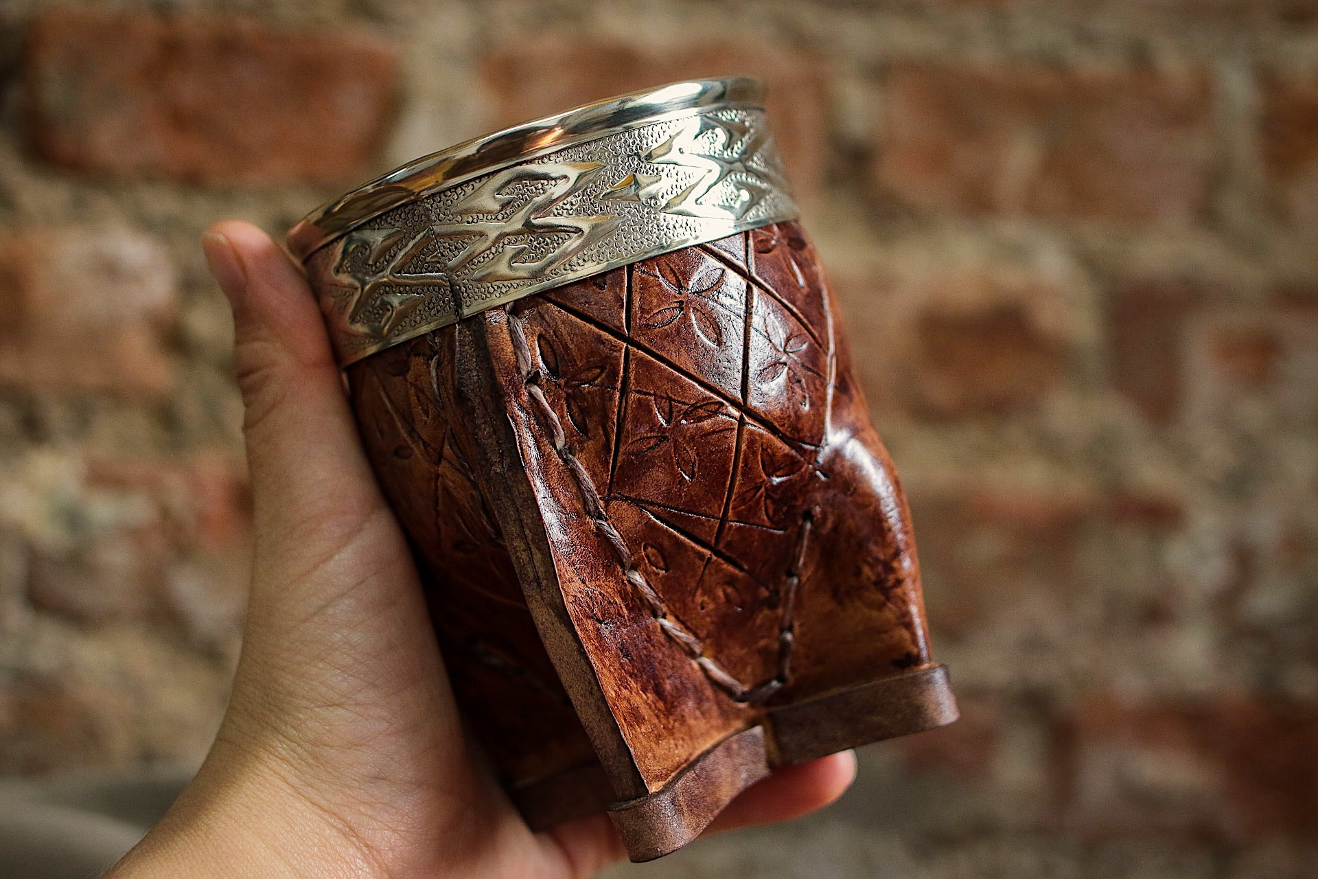 El cuero está repujado artesanalmente con el escudo nacional argentino