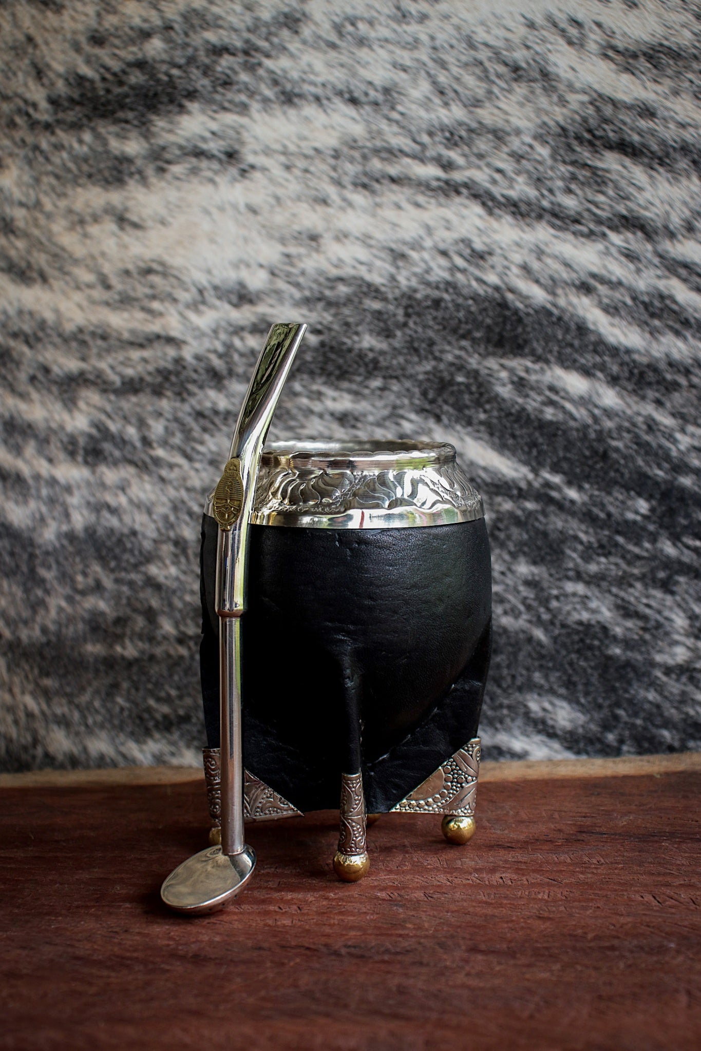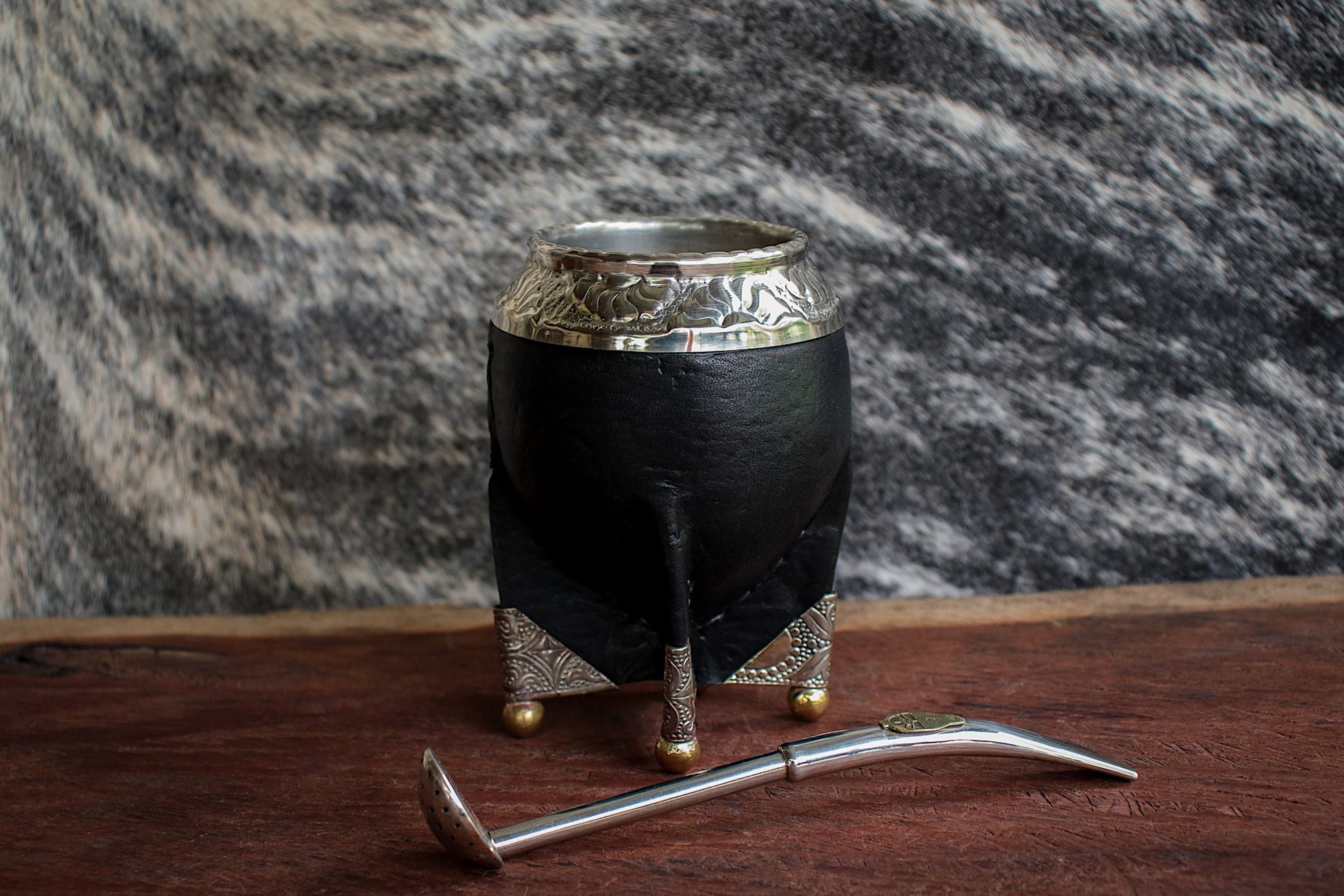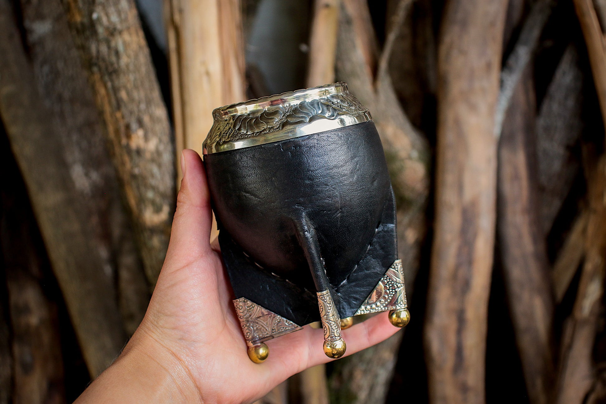 Mate de porongo forrado artesanalmente en cuero natural.
