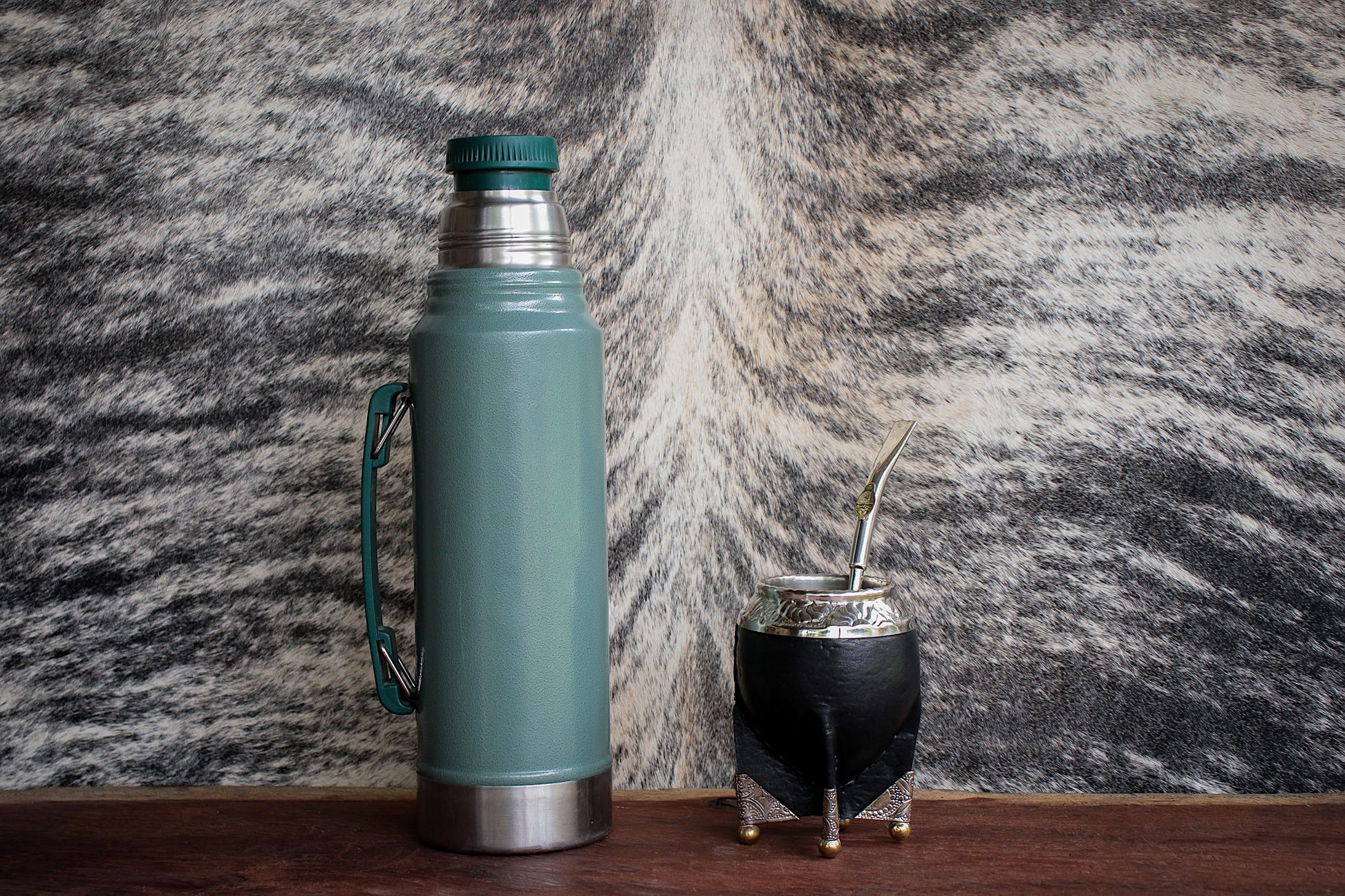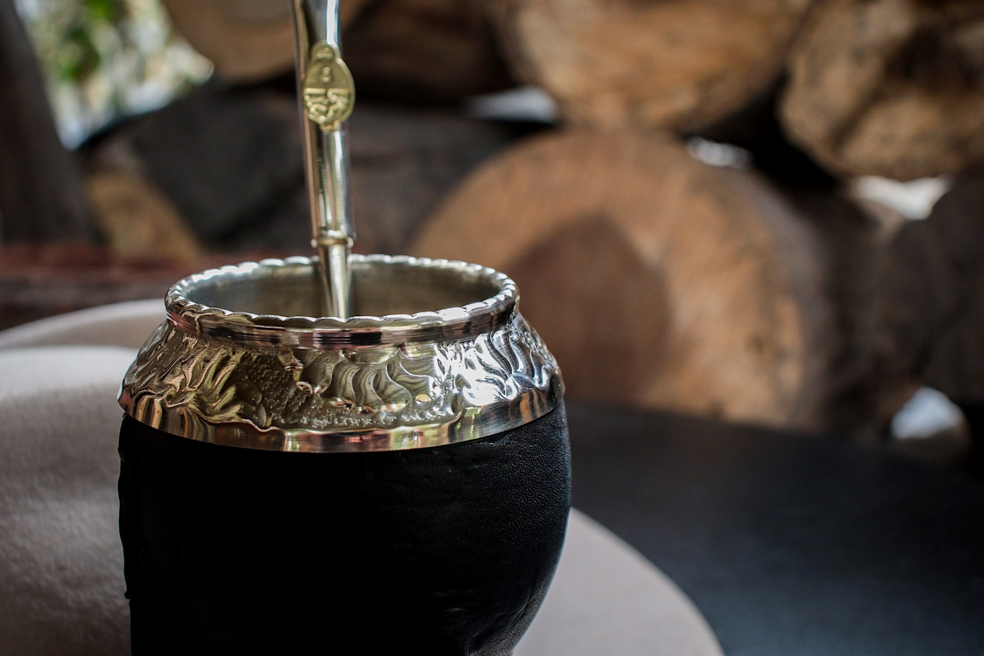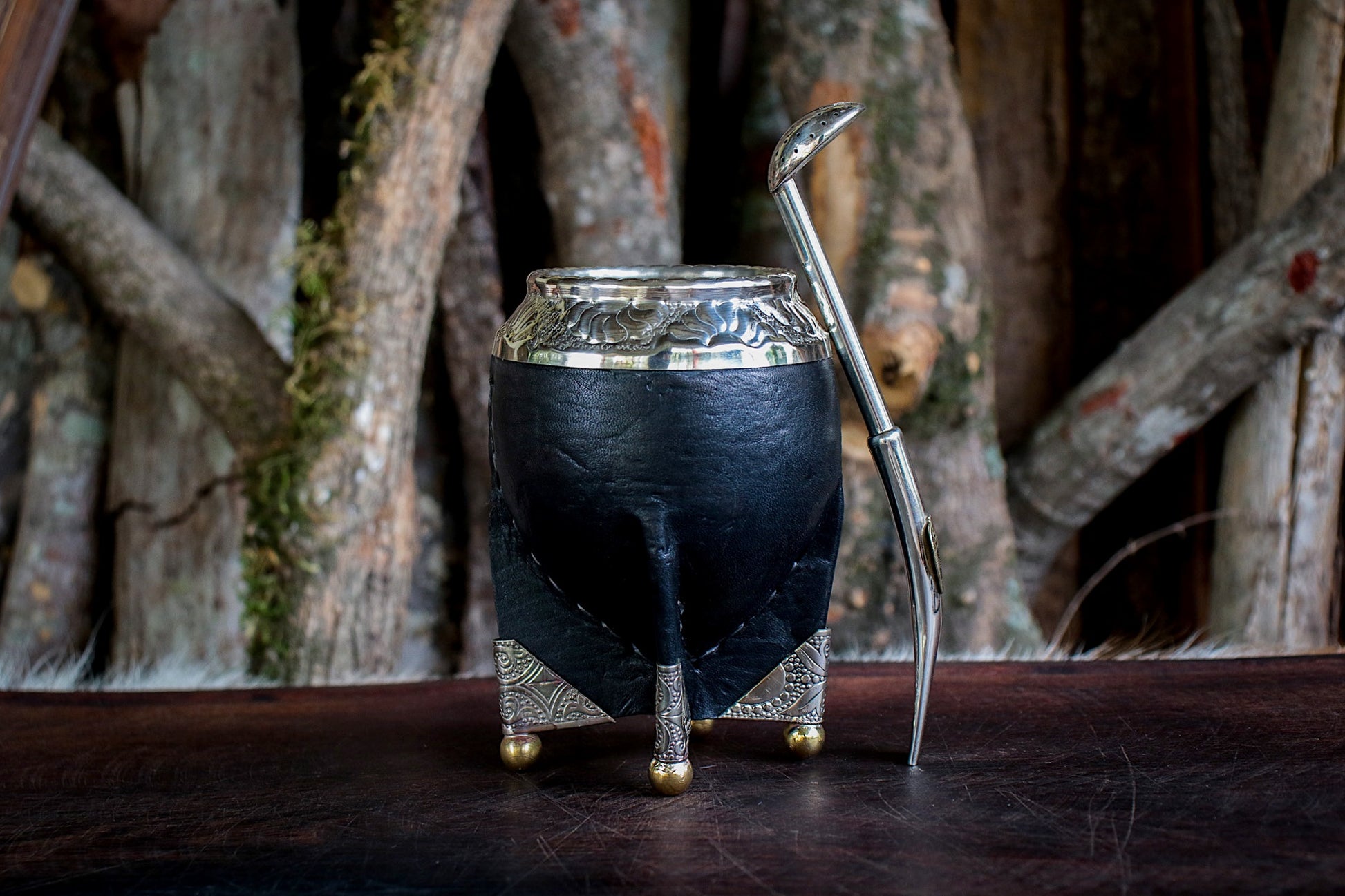 Mate de porongo forrado artesanalmente en cuero natural.