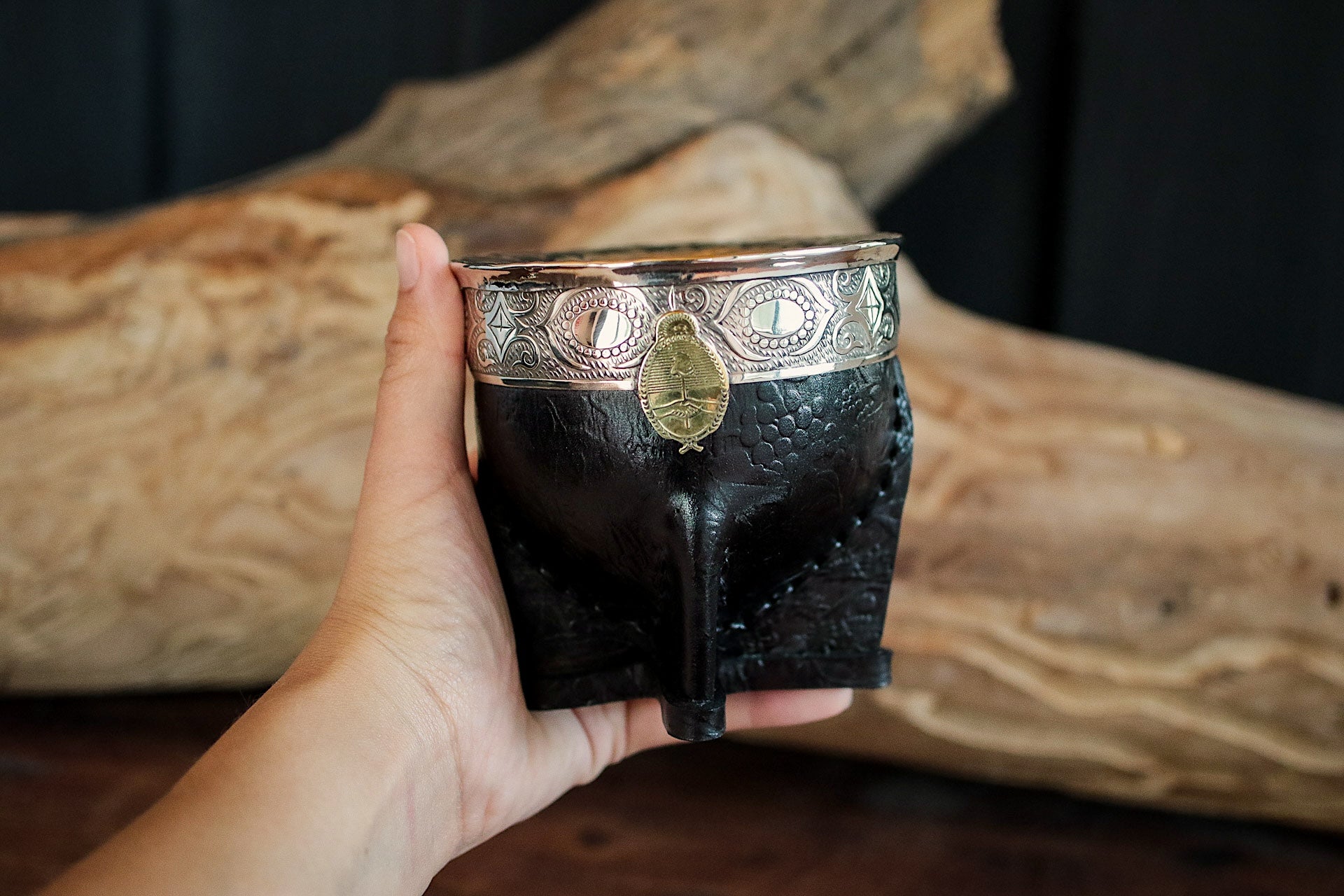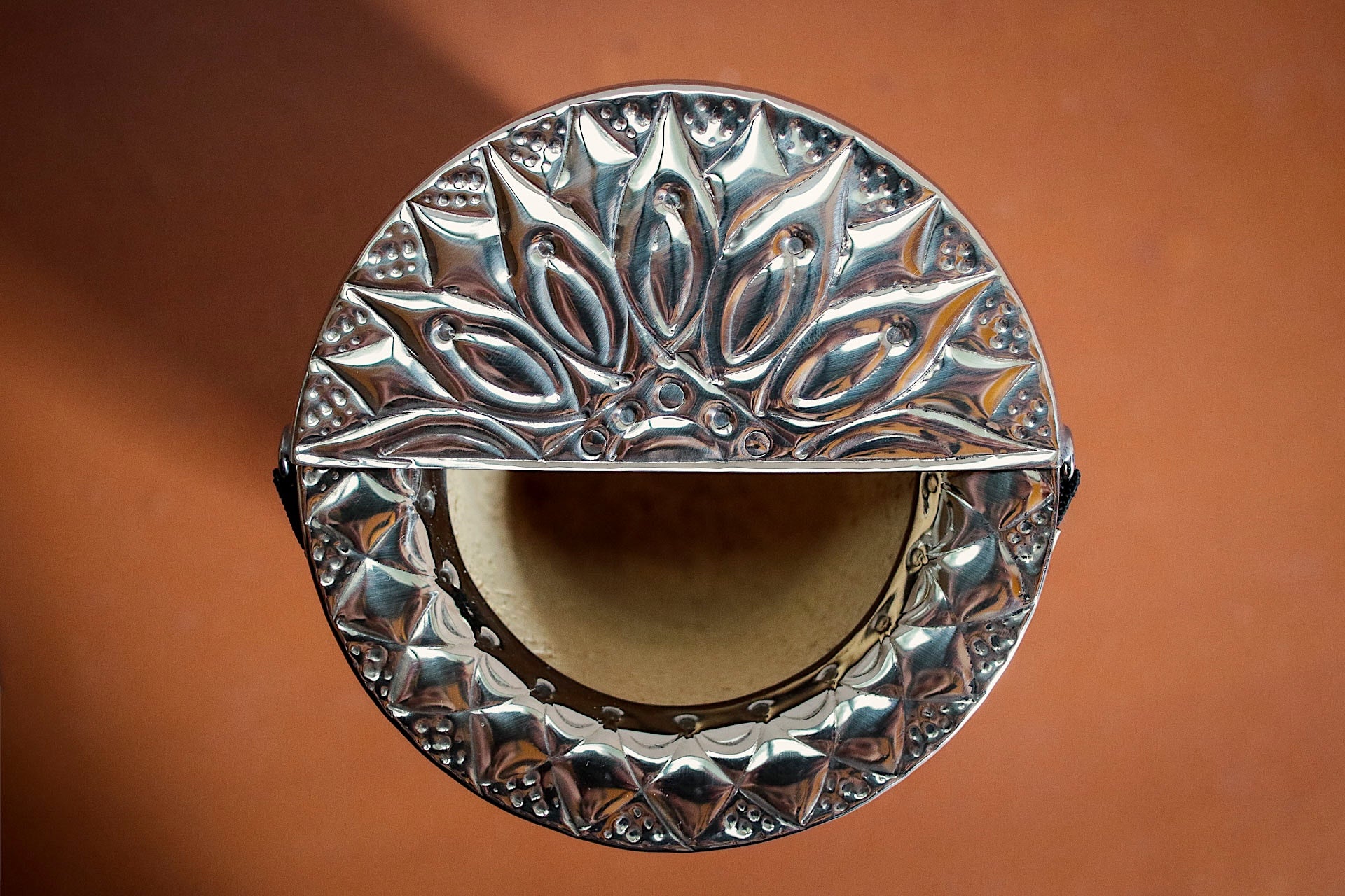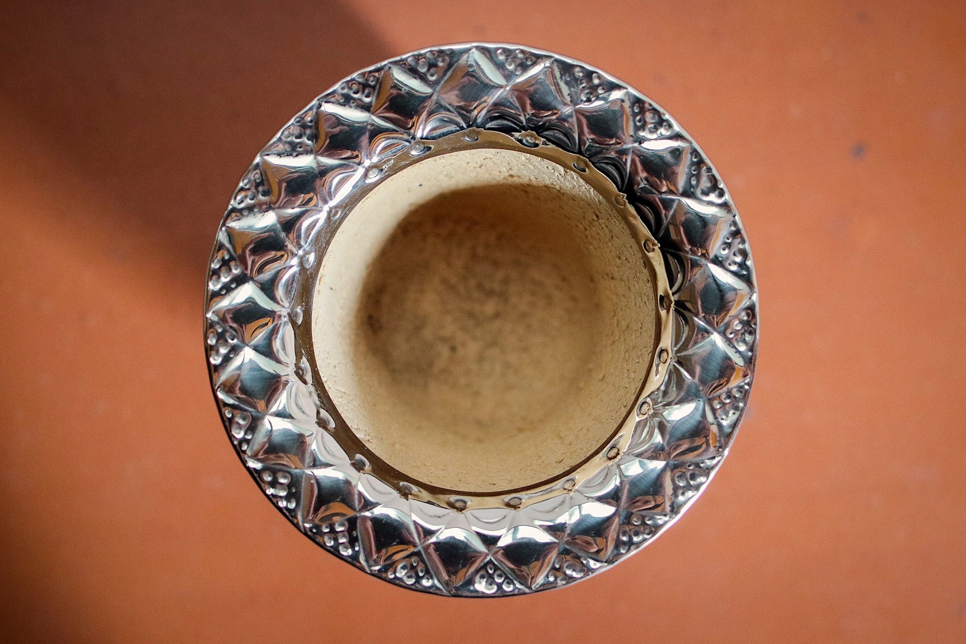 Mate imperial de porongo forrado artesanalmente en cuero natural con matepa de alpaca