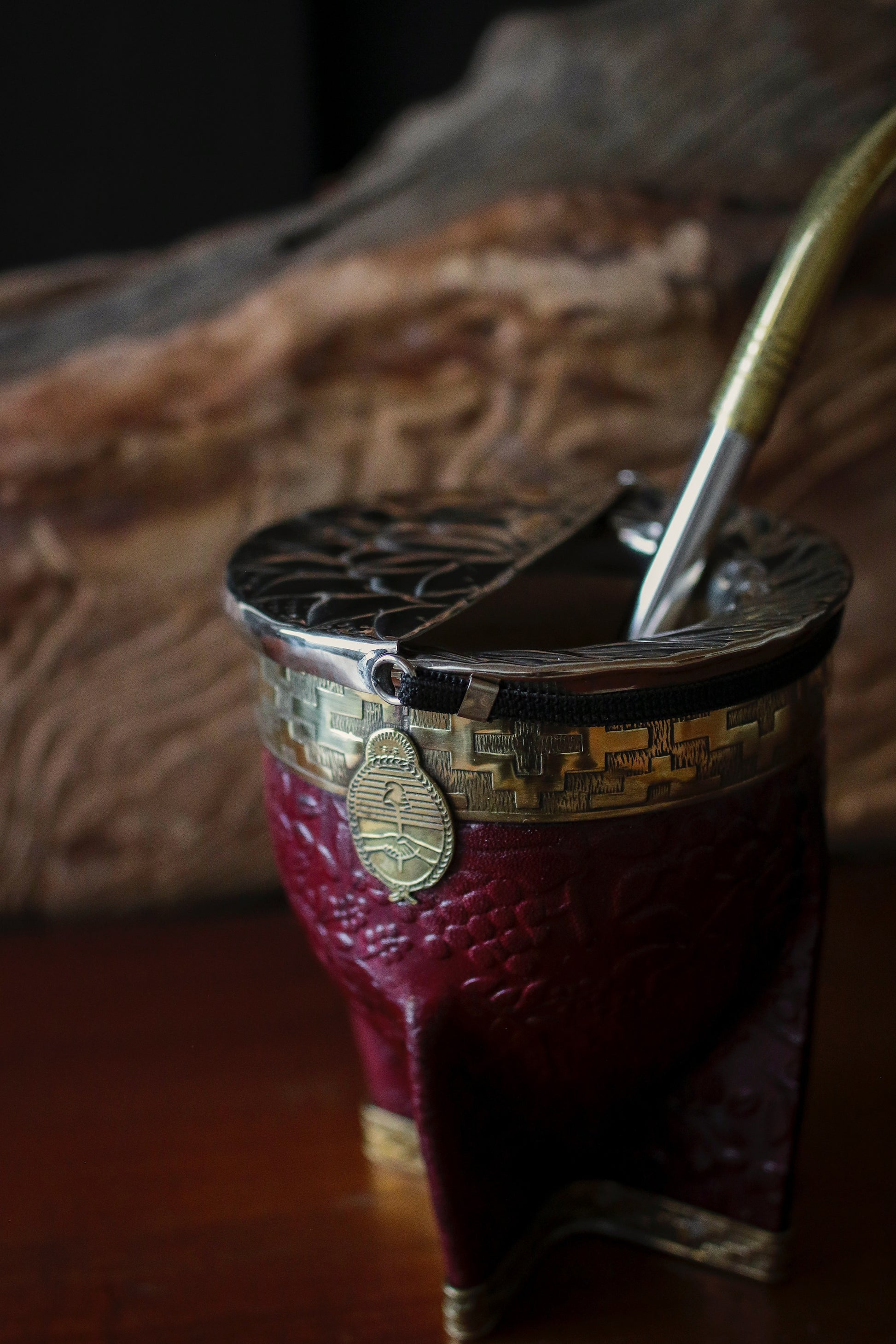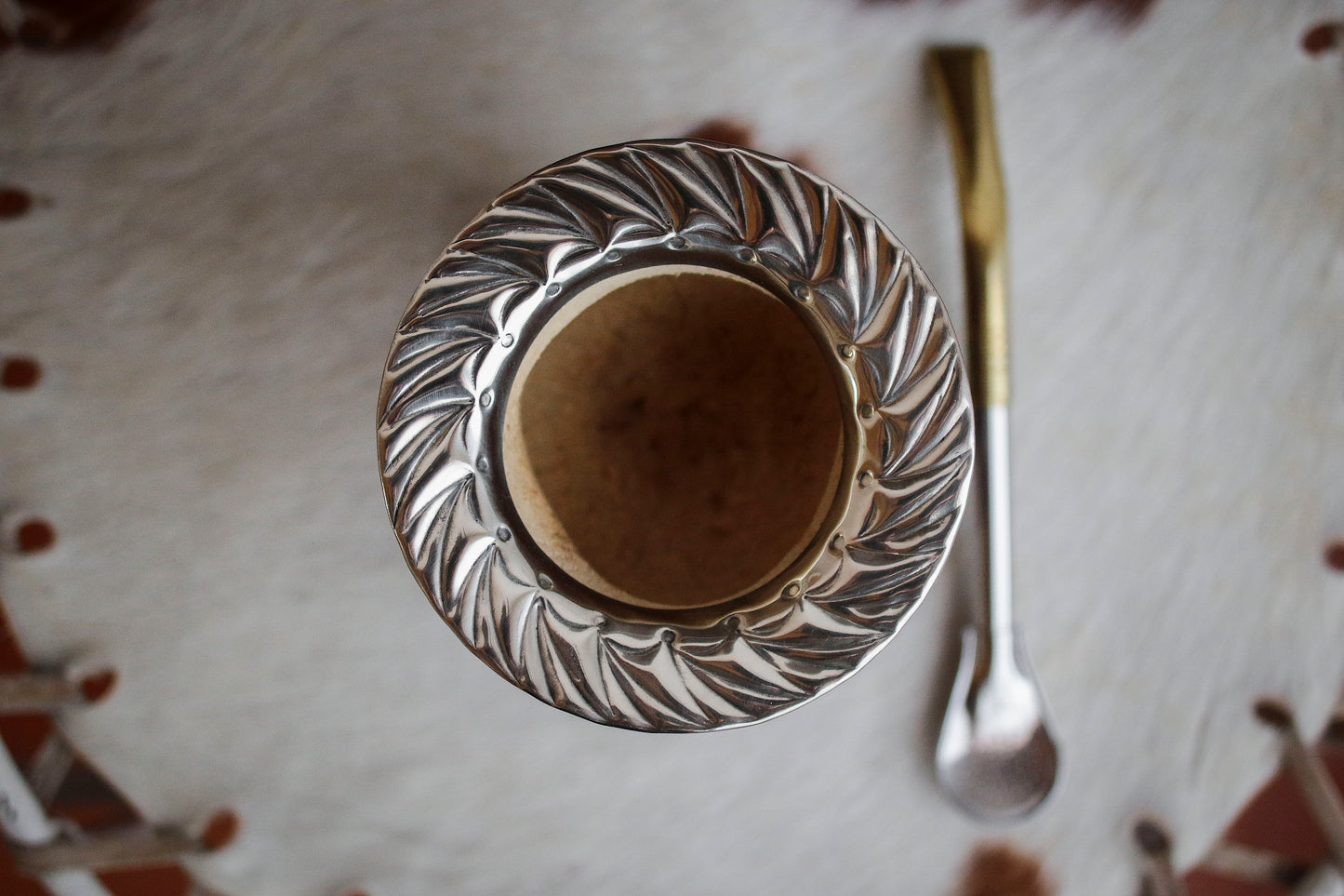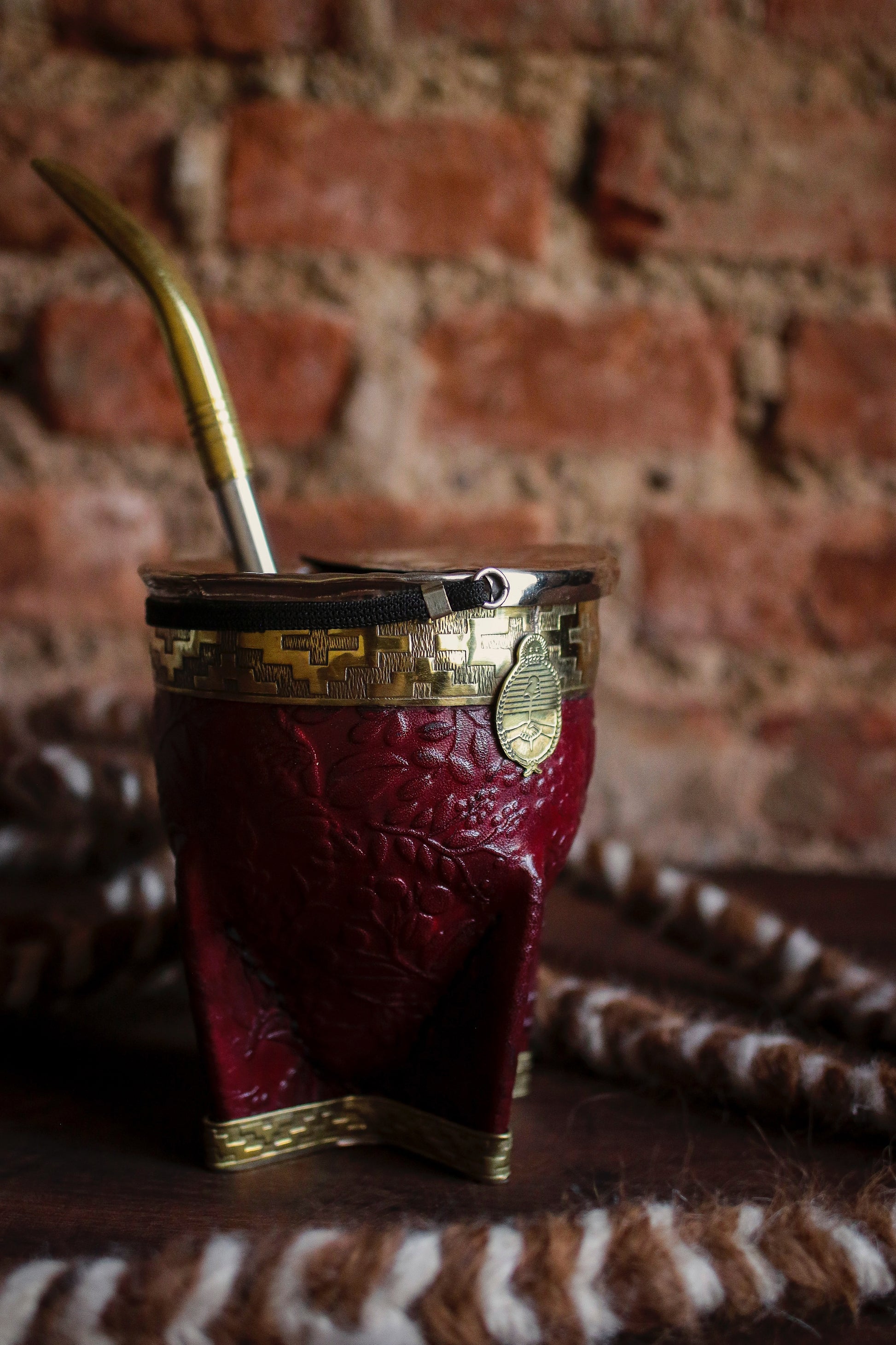 Mate imperial de porongo forrado artesanalmente en cuero natural con matepa de alpaca y base cincelada