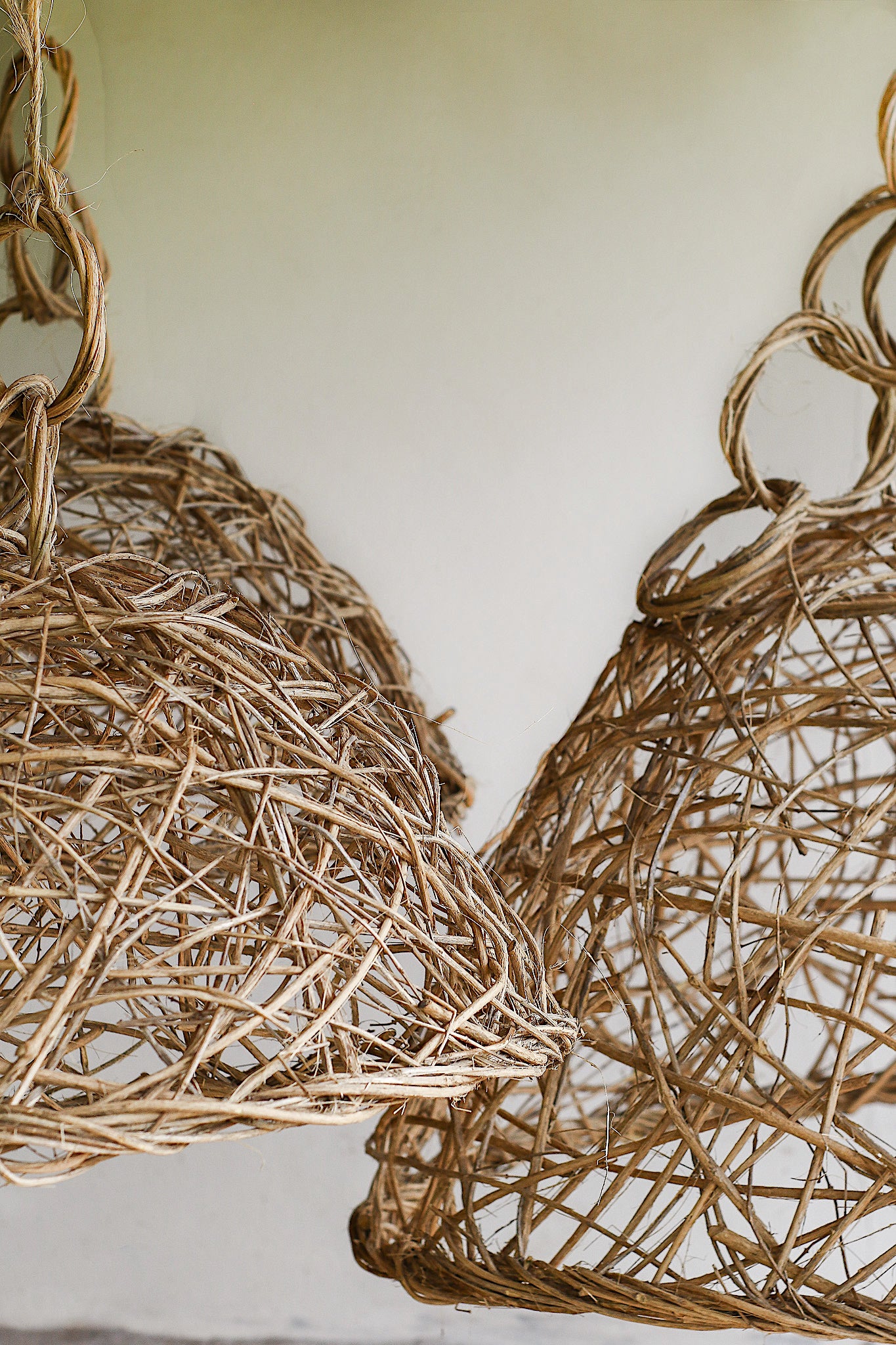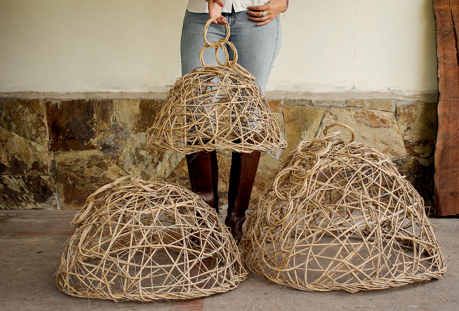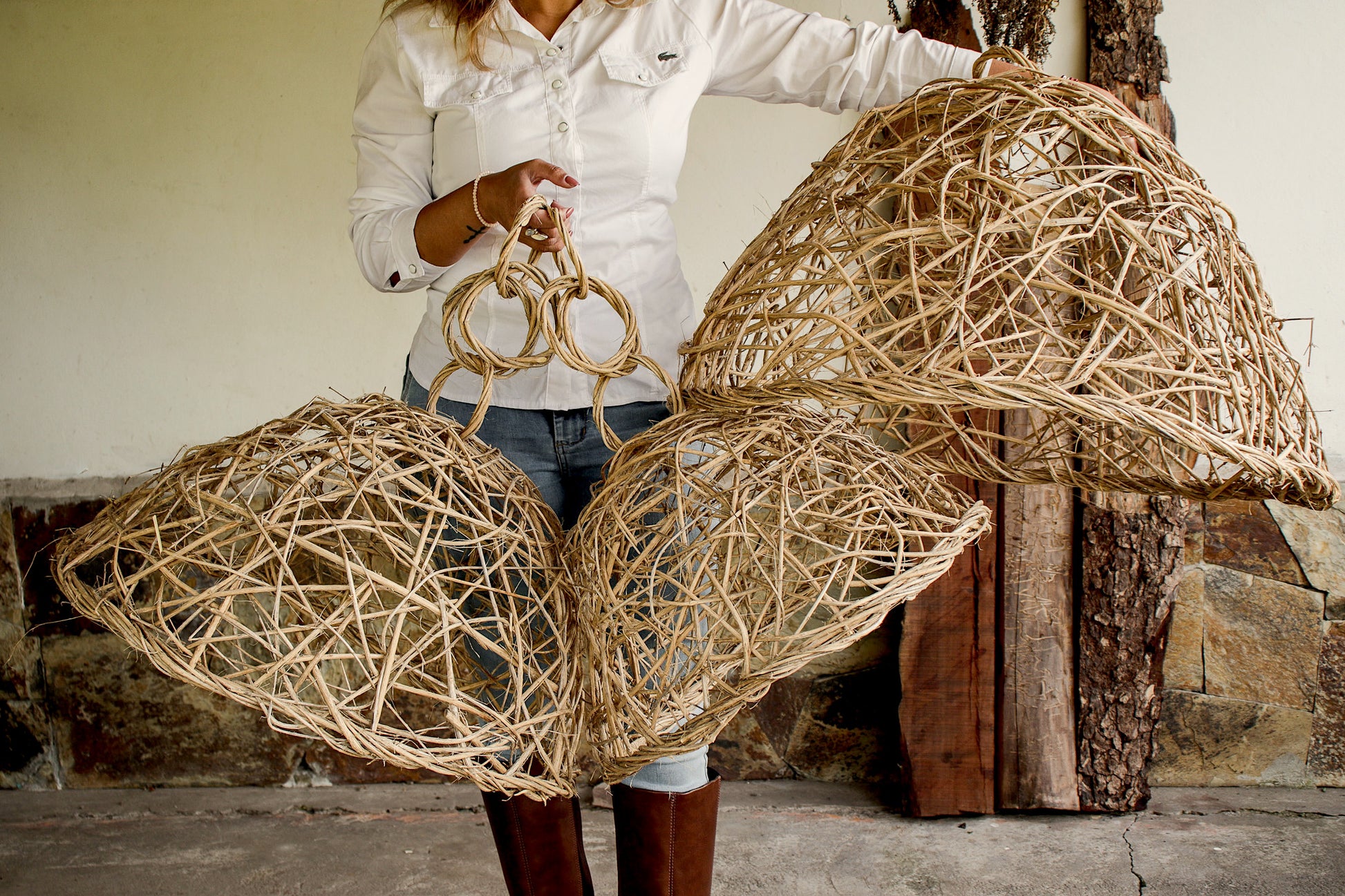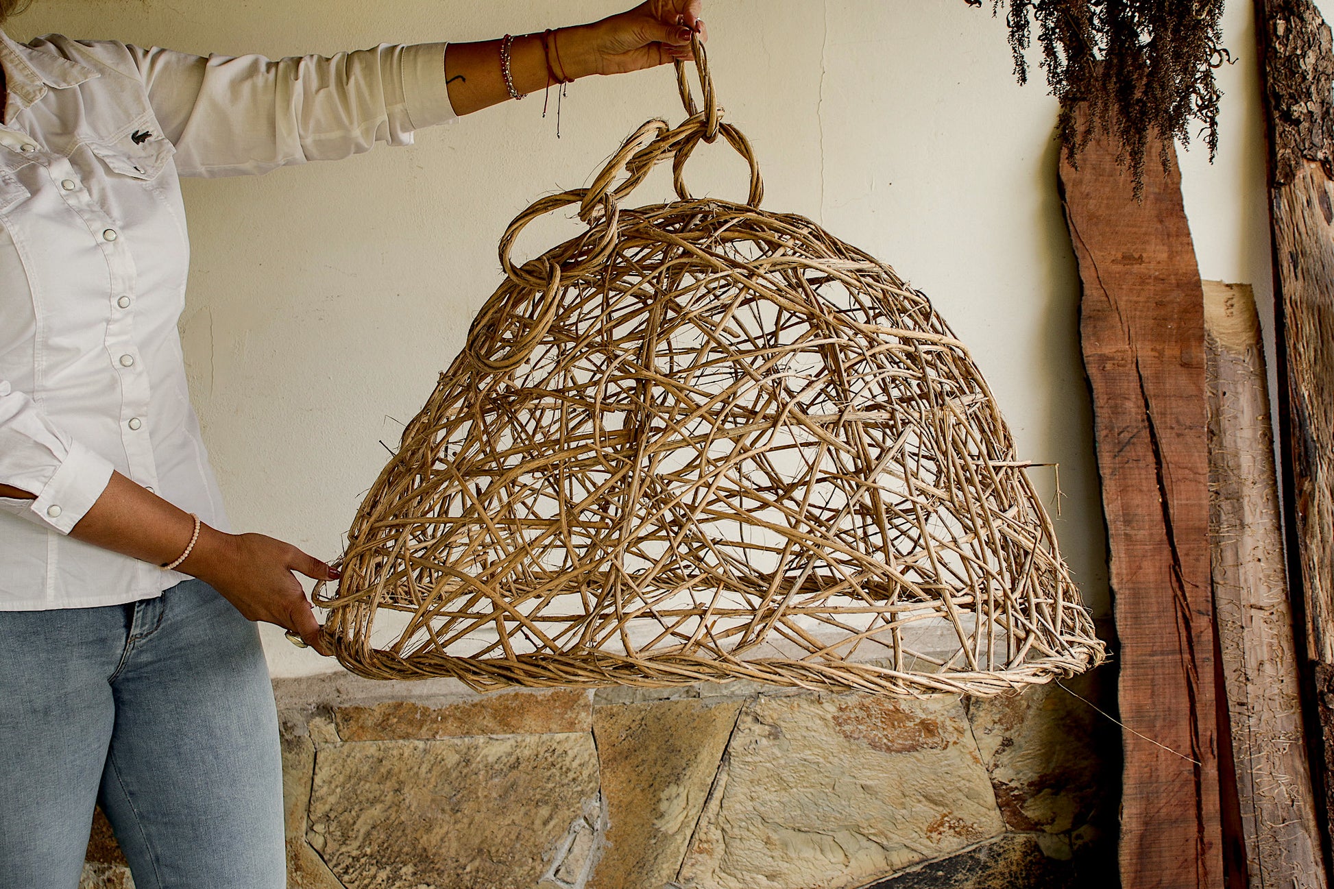 Las ramas se recolectan a mano y se limpian los gajos uno a uno con cuchillo hasta quedar la vara lisa, el trenzado y entrecruzado es artesanal, luego se deja secar entre 50 y 60 días.
