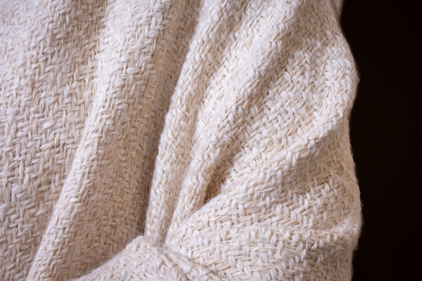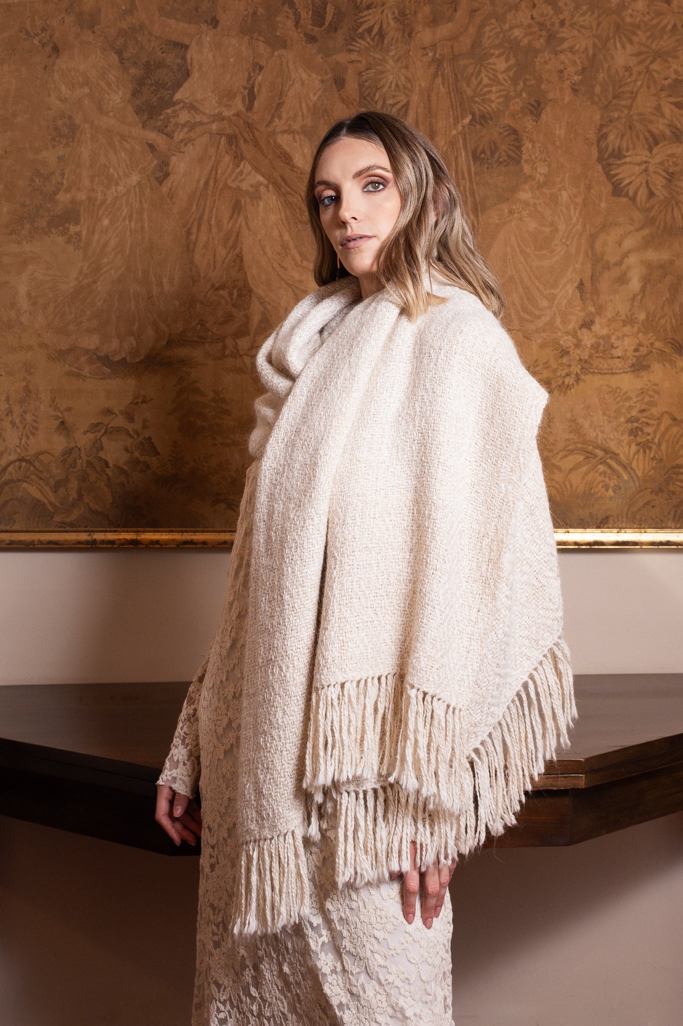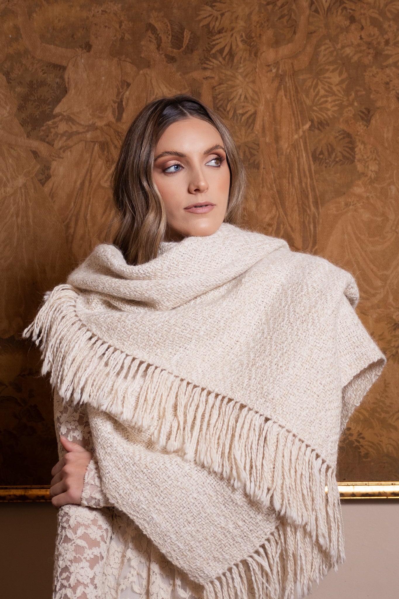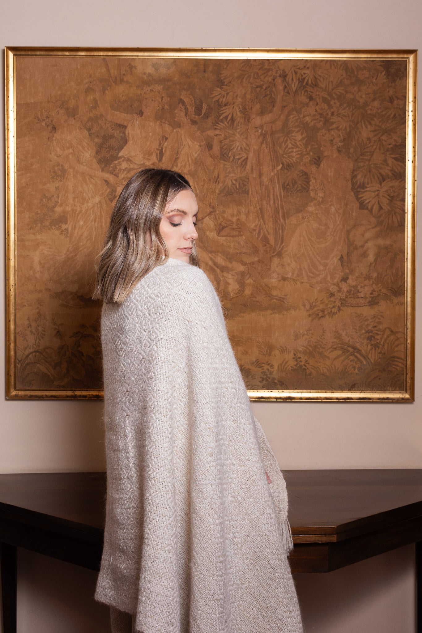 Manta CARMELA es parte de la colección "Las Marias" hilada de fibra de llama baby y hecha en telar con técnica Ojo de Perdiz.
