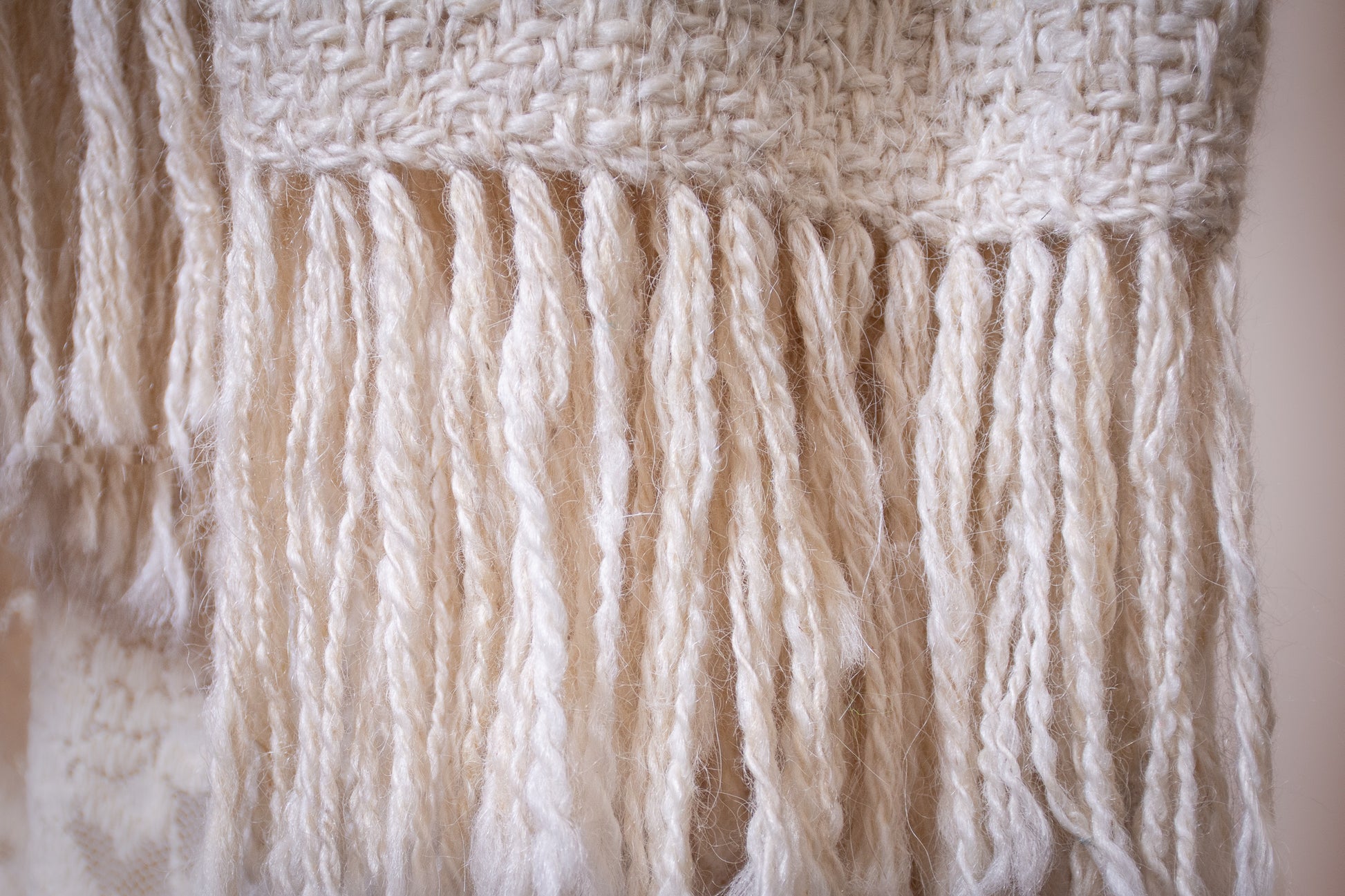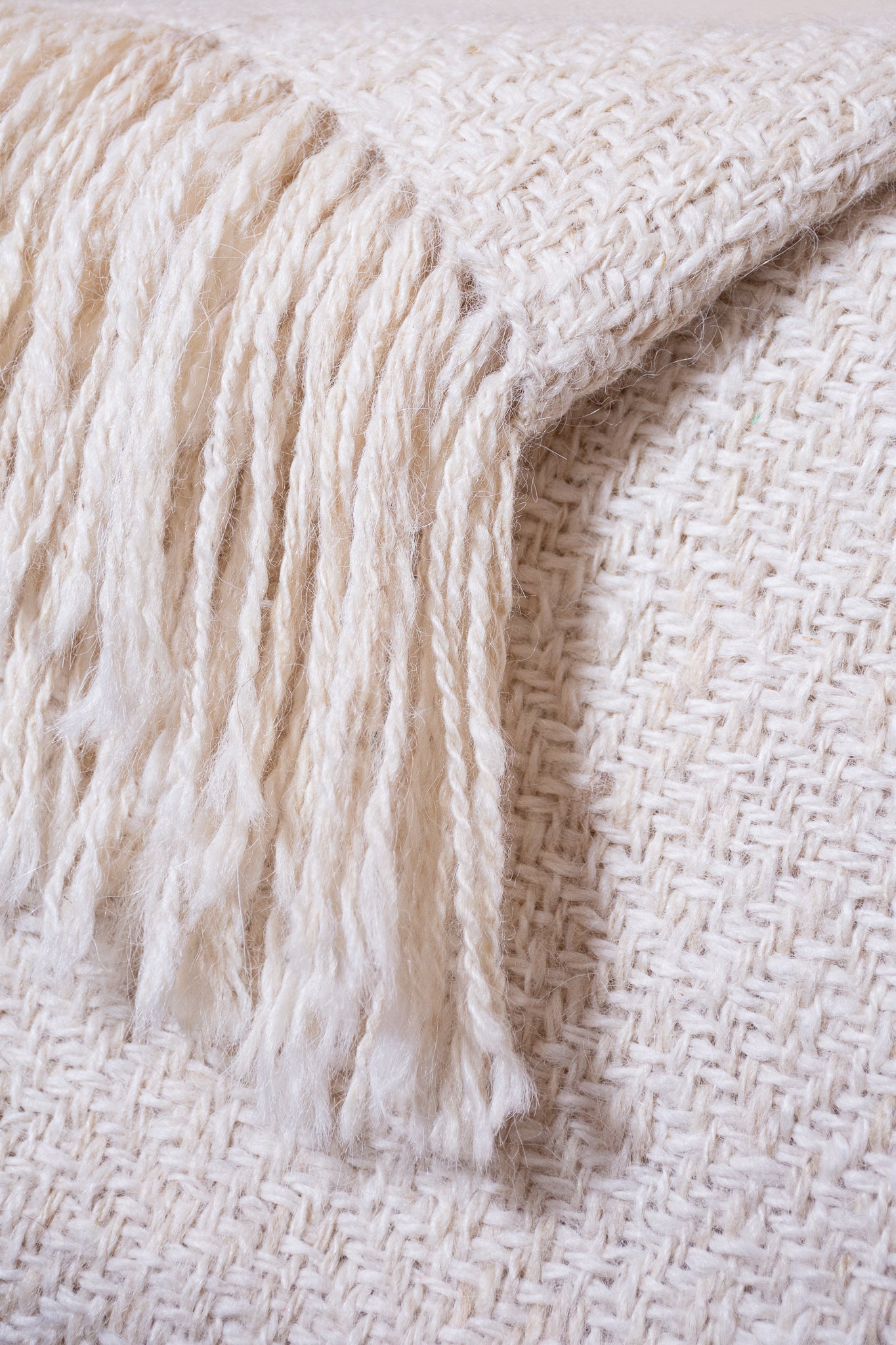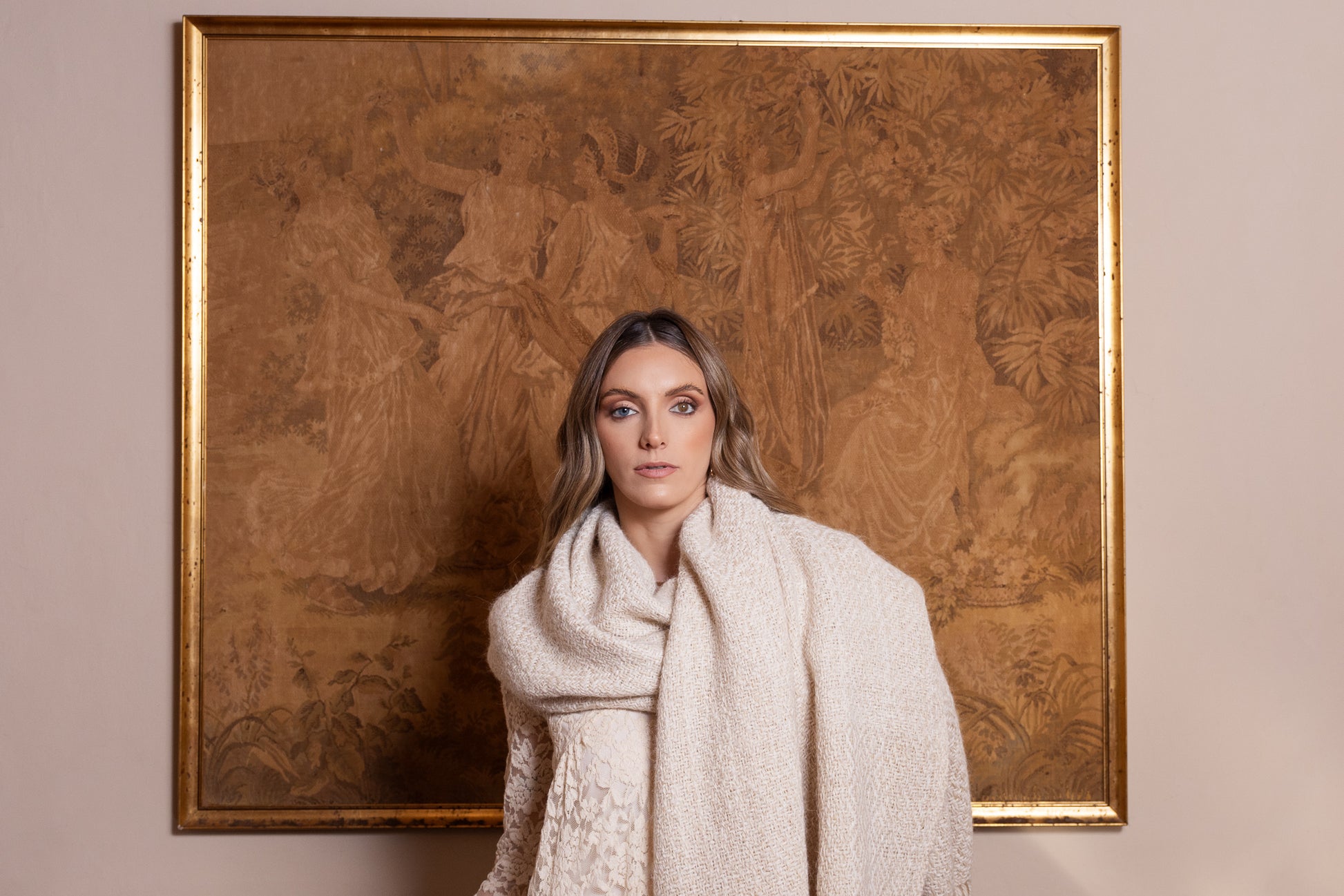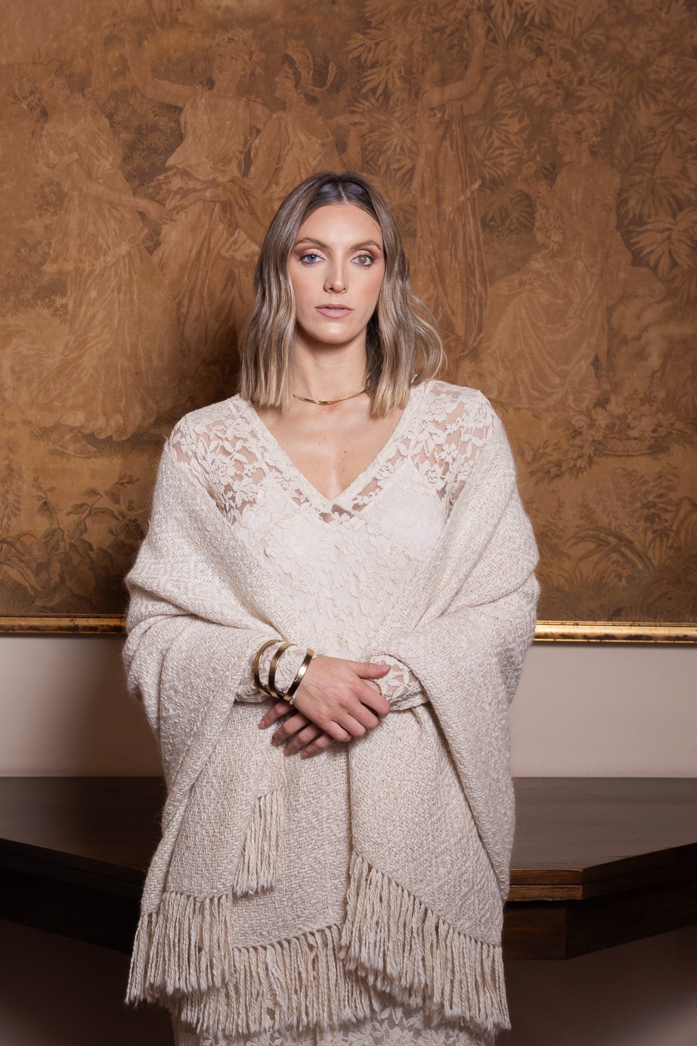 Manta CARMELA es parte de la colección "Las Marias" hilada de fibra de llama baby y hecha en telar con técnica Ojo de Perdiz.