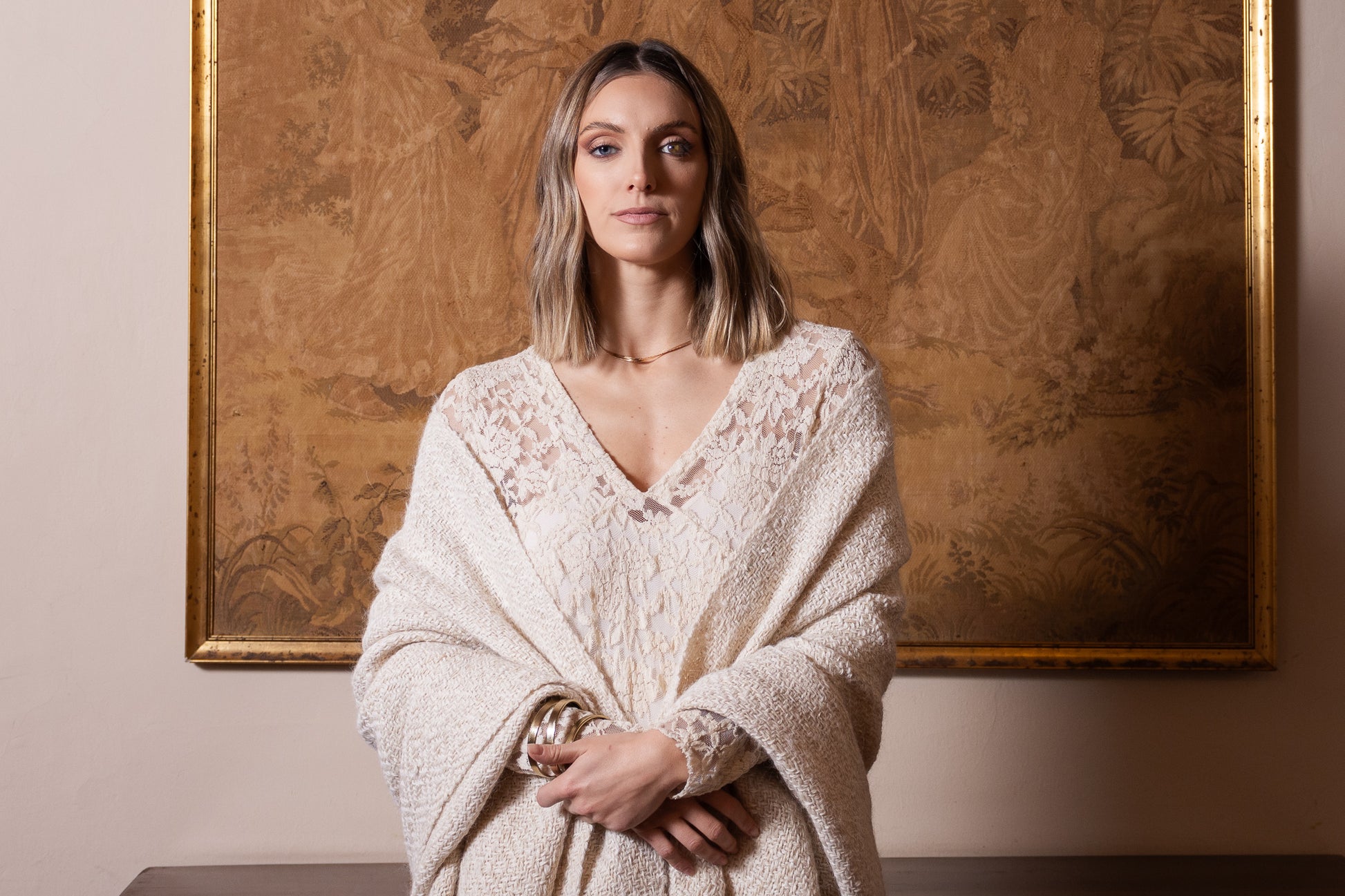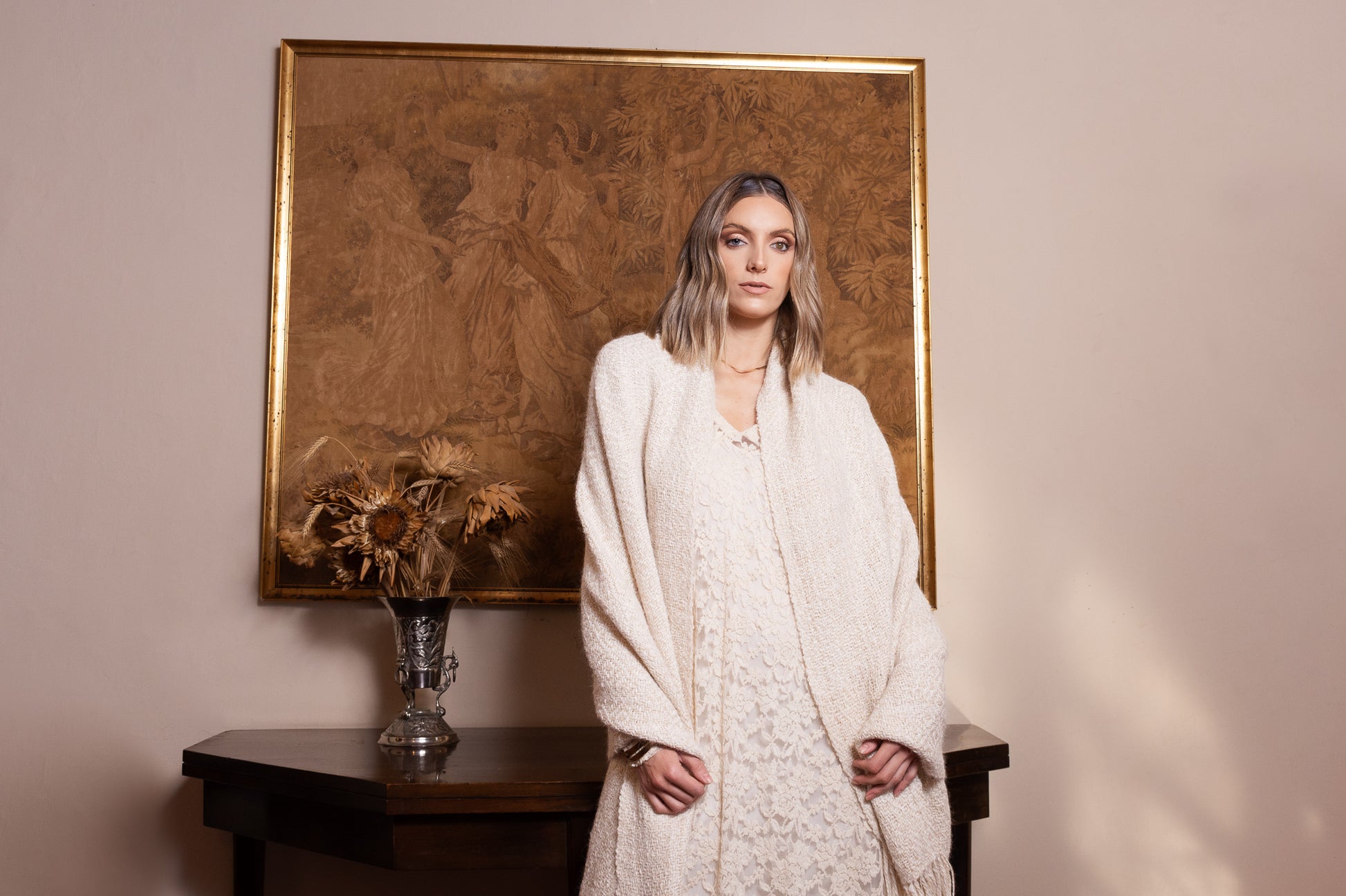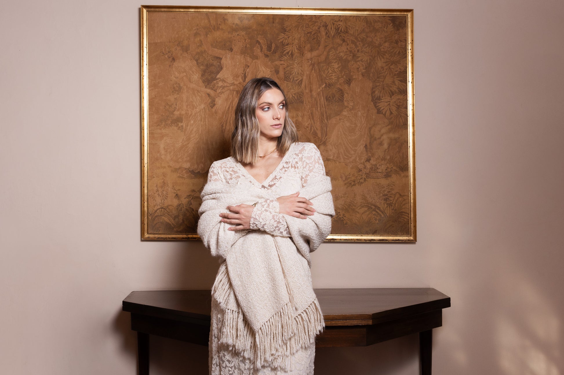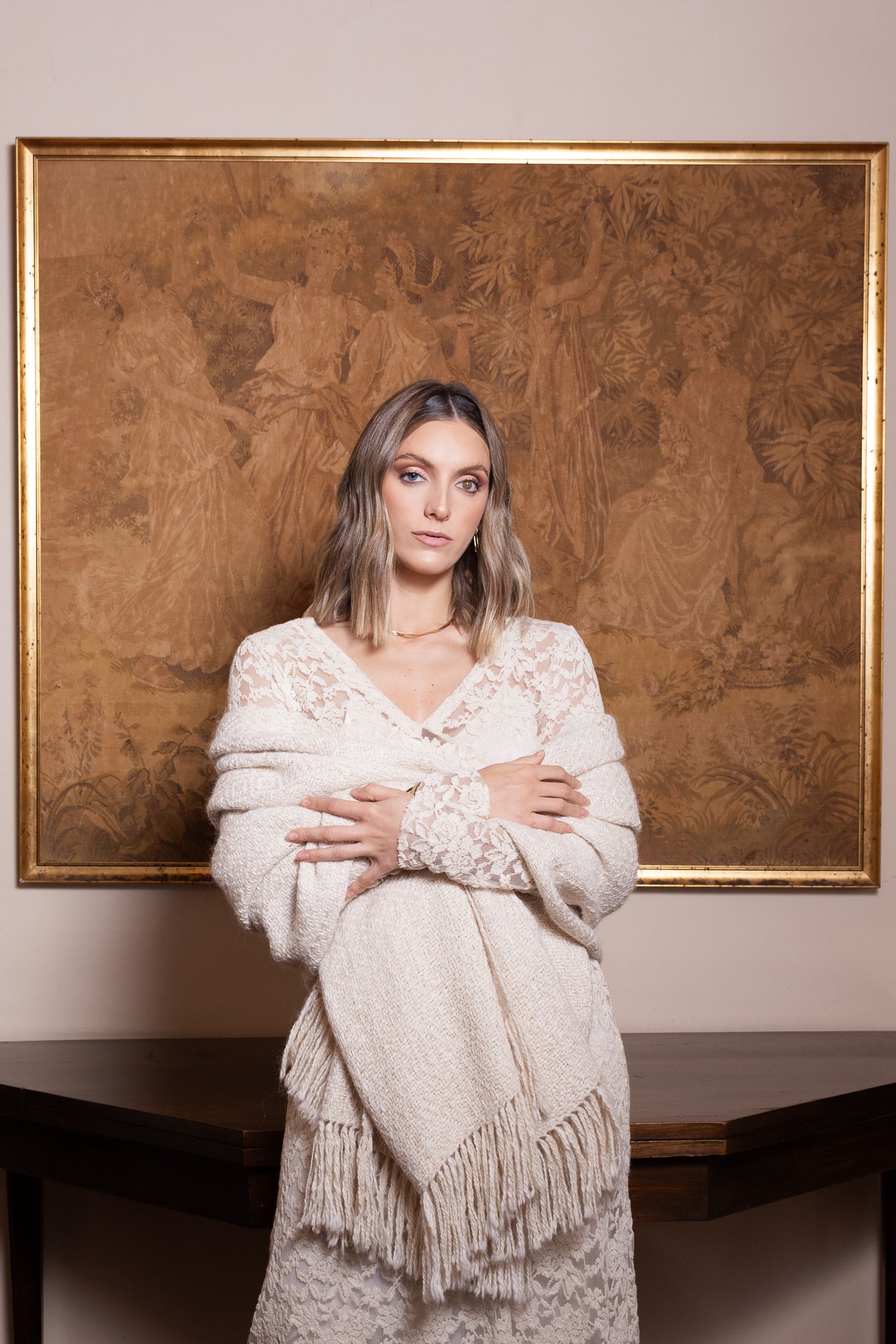 Manta CARMELA es parte de la colección "Las Marias" hilada de fibra de llama baby y hecha en telar con técnica Ojo de Perdiz.