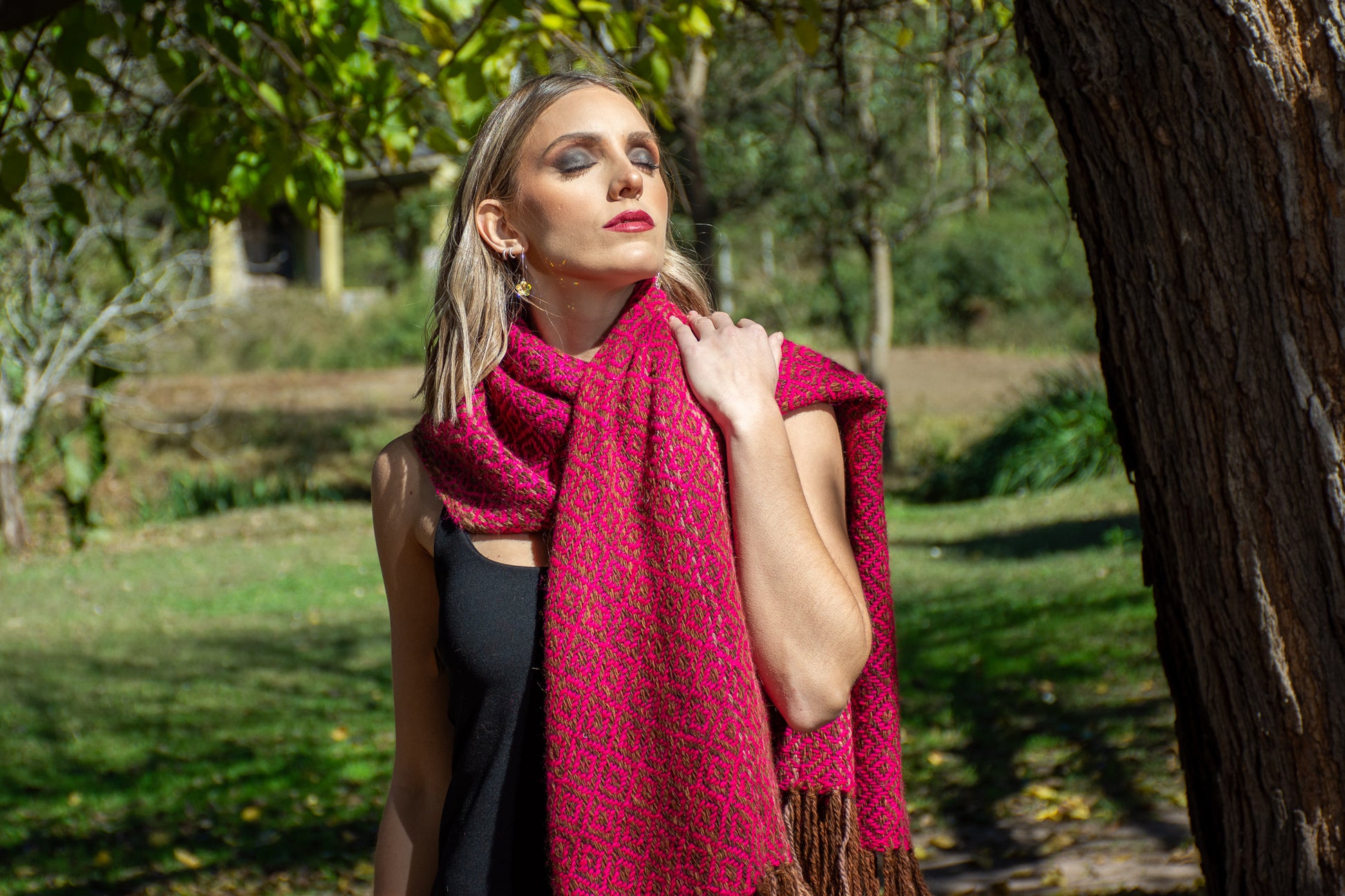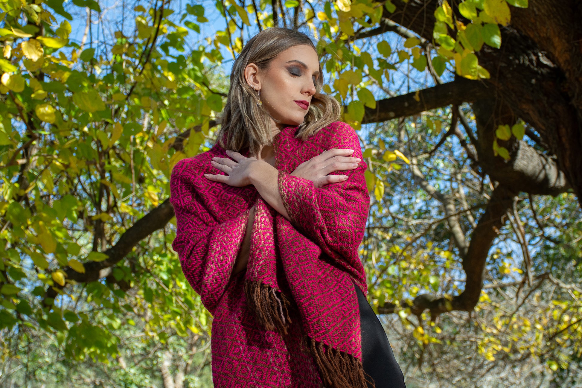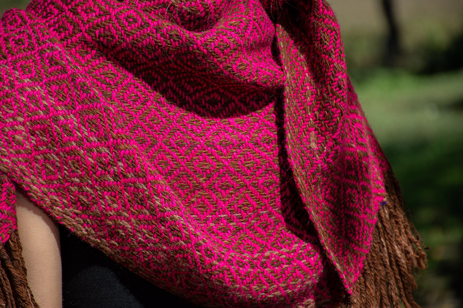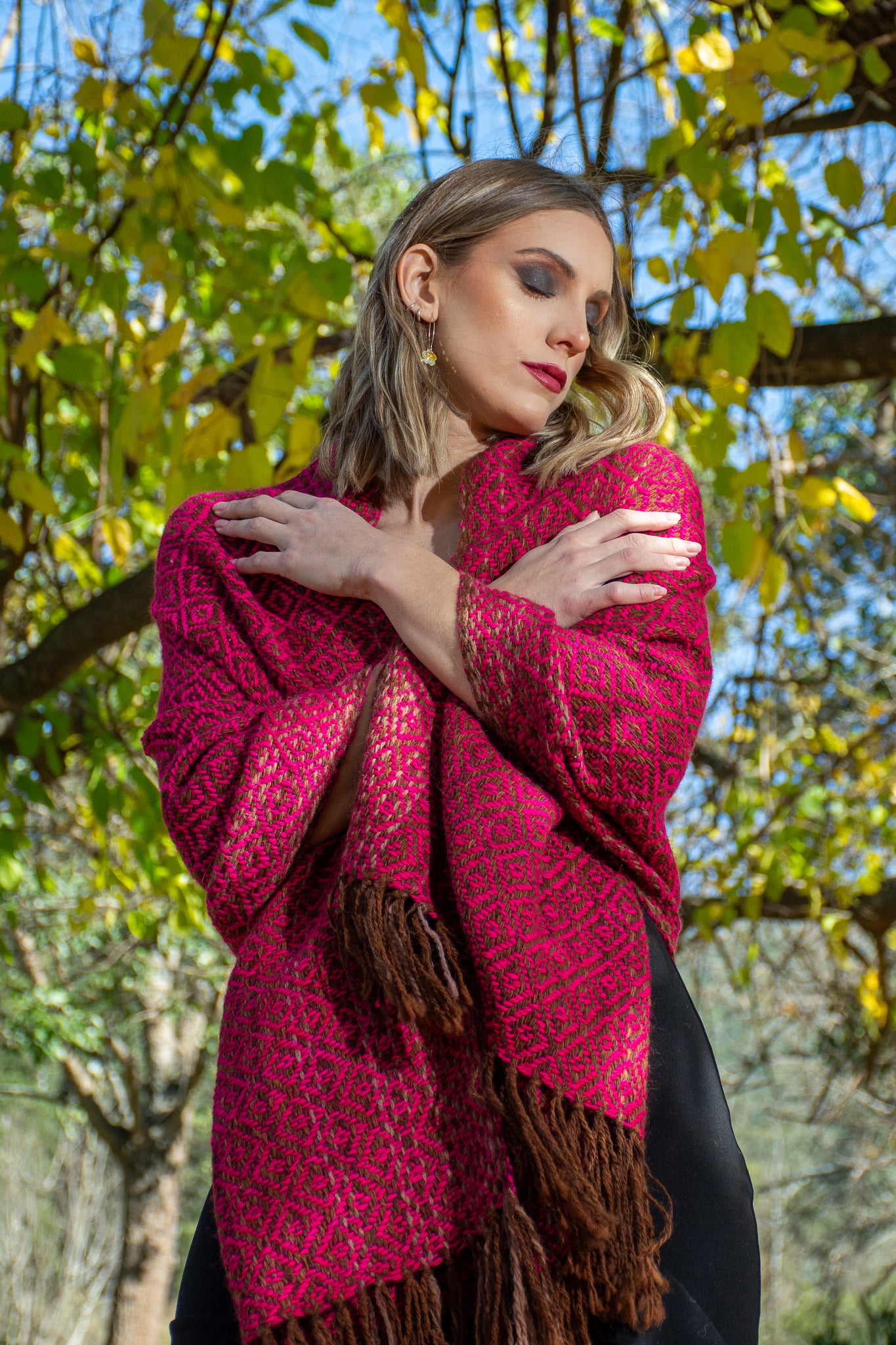 Manta IZHABELA es parte de la colección "Las Marias" hilada de fibra de llama baby y hecha en telar con técnica Ojo de Perdiz.