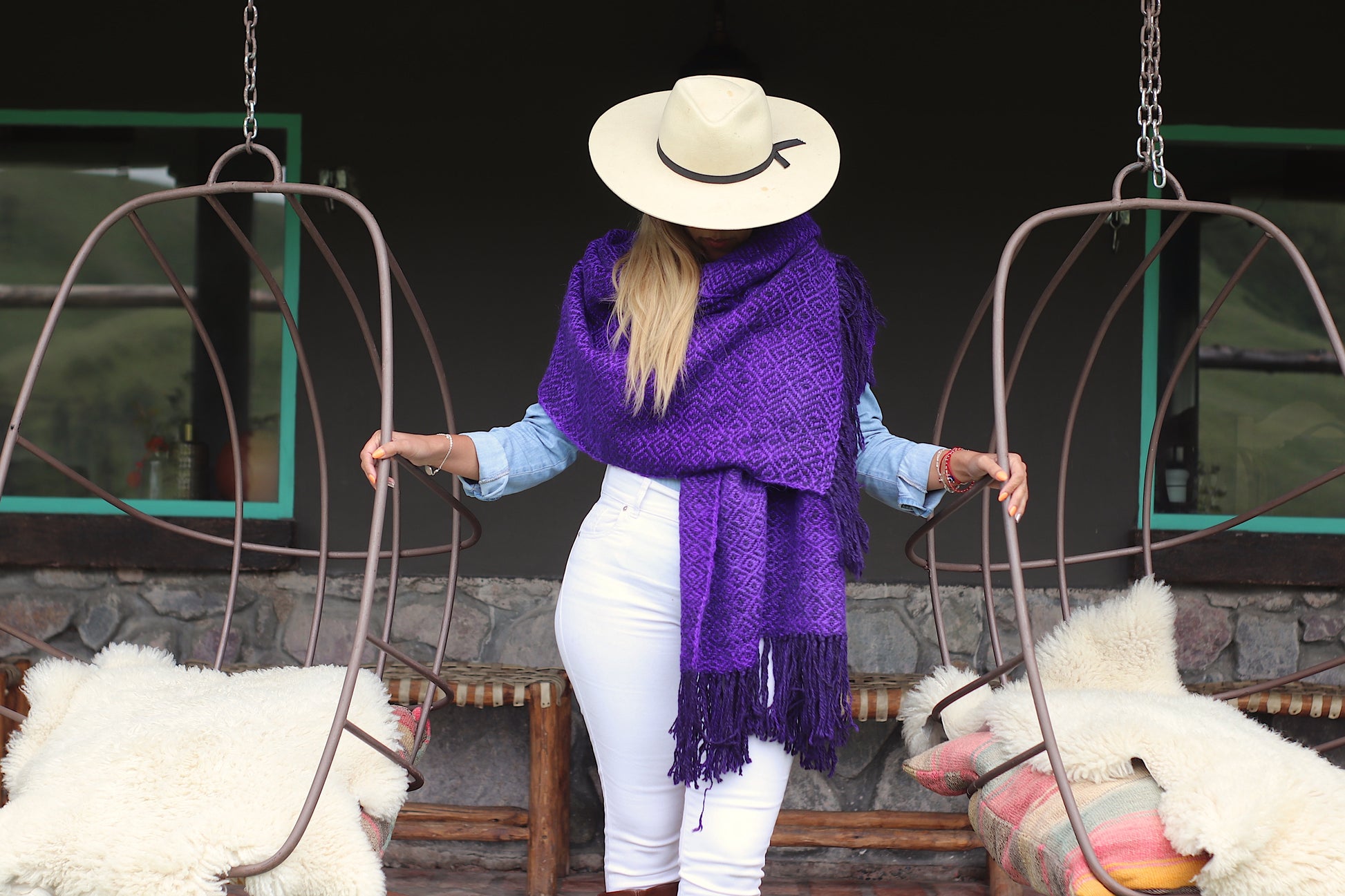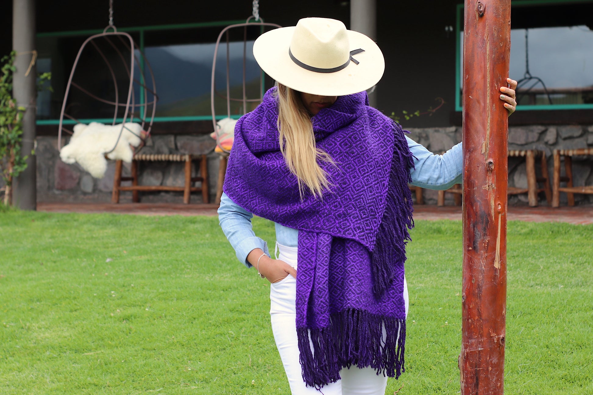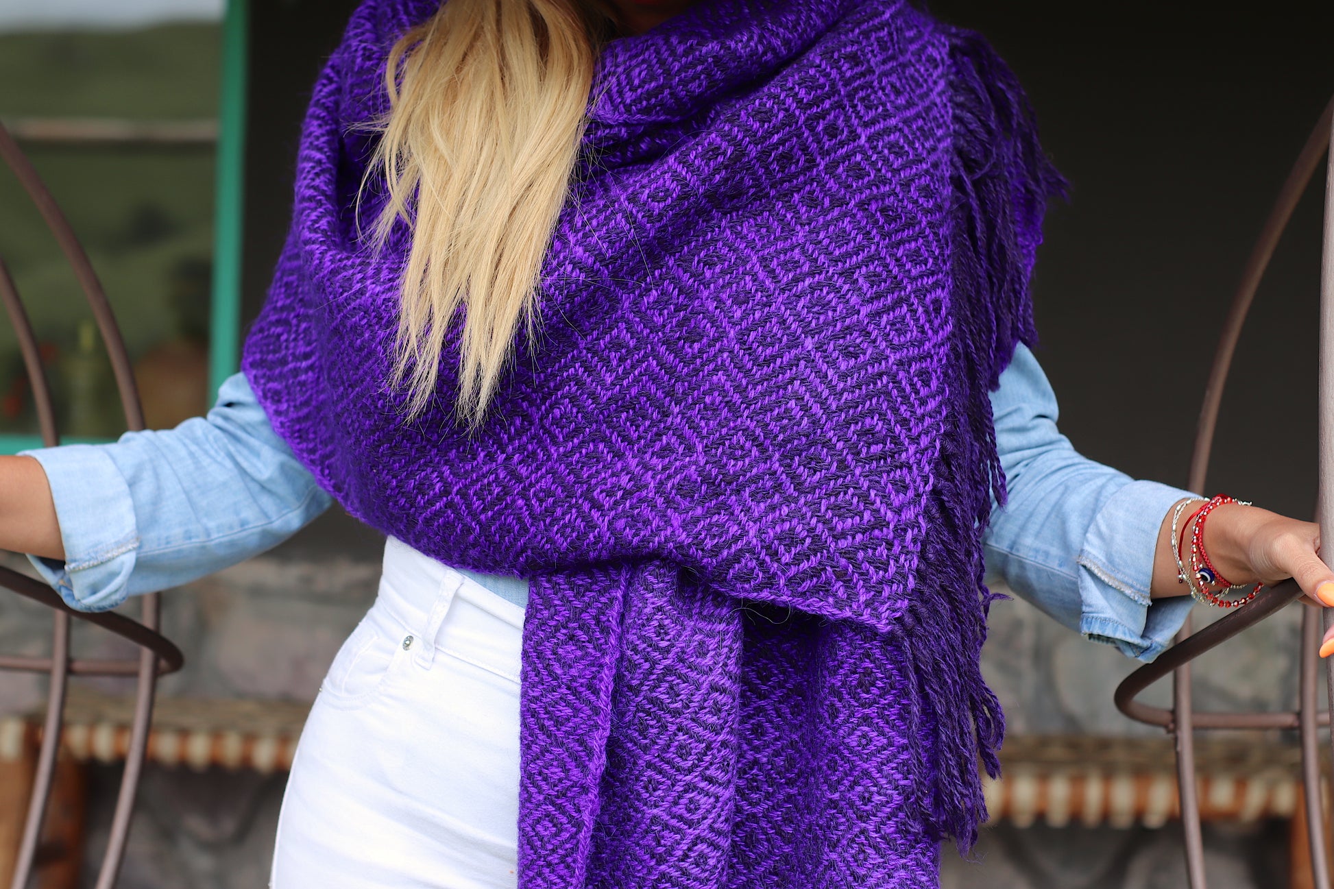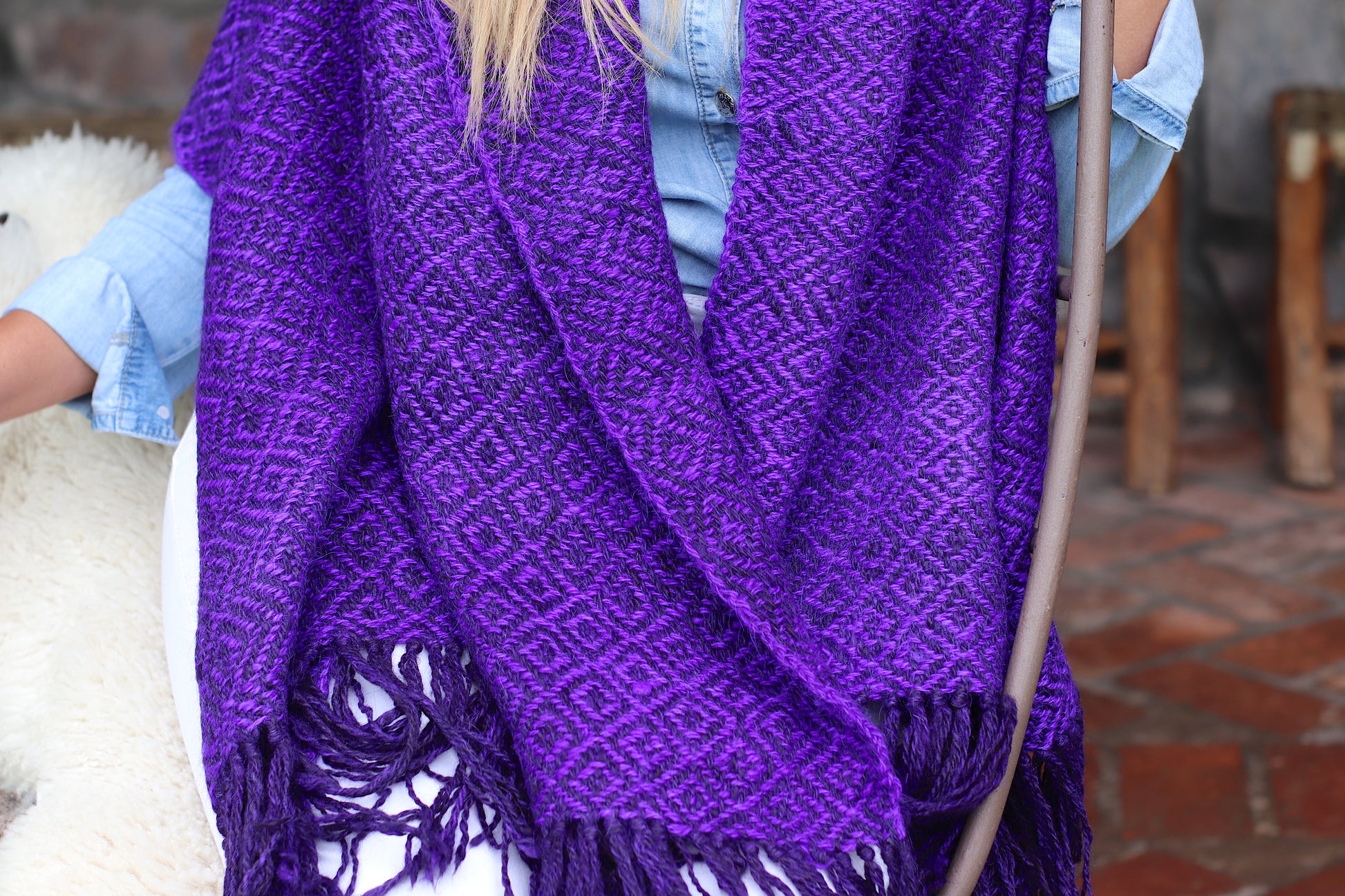 Manta MORA es parte de la colección "Las Vicuñas" hilada de fibra de llama baby y hecha en telar con técnica Ojo de Perdiz.