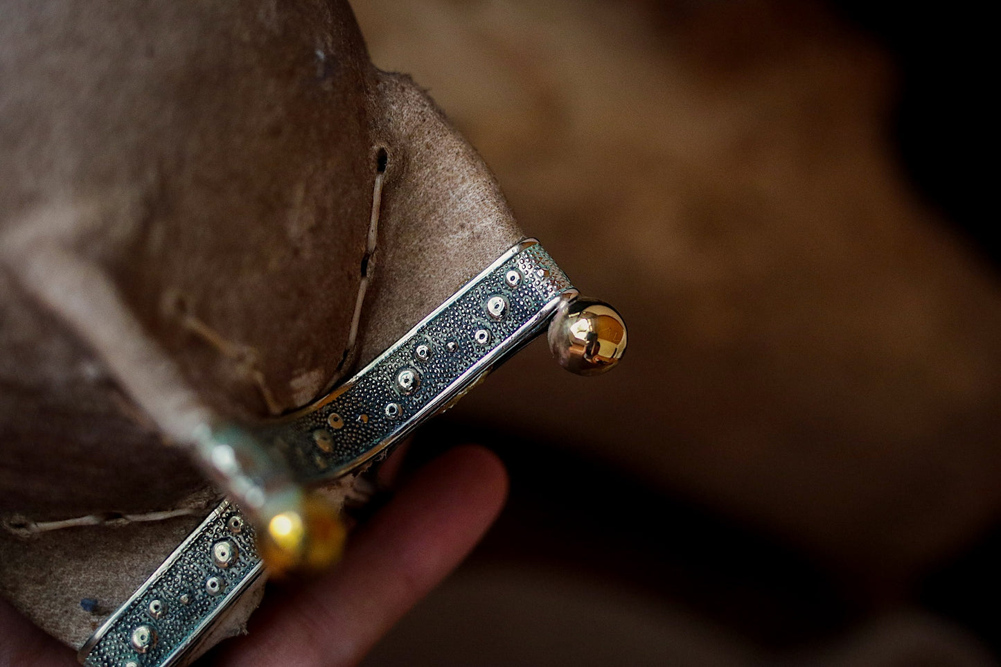 El cincelado de alpaca en virola y base es hecho a mano. Las esferas de apoyo son de bronce.
