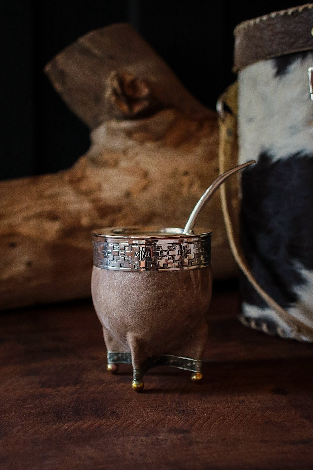 Mate de porongo forrado artesanalmente en cuero crudo natural.