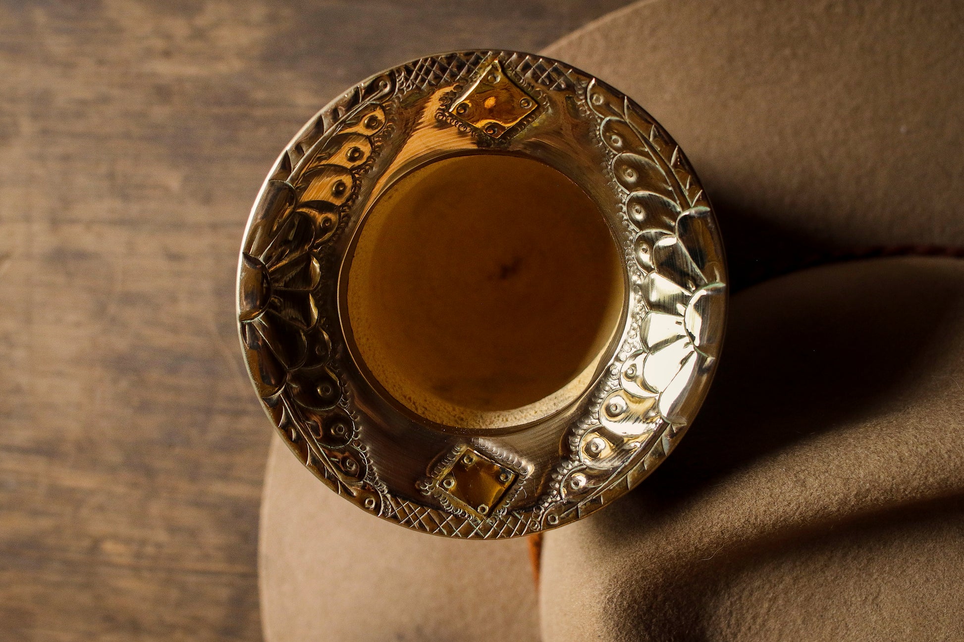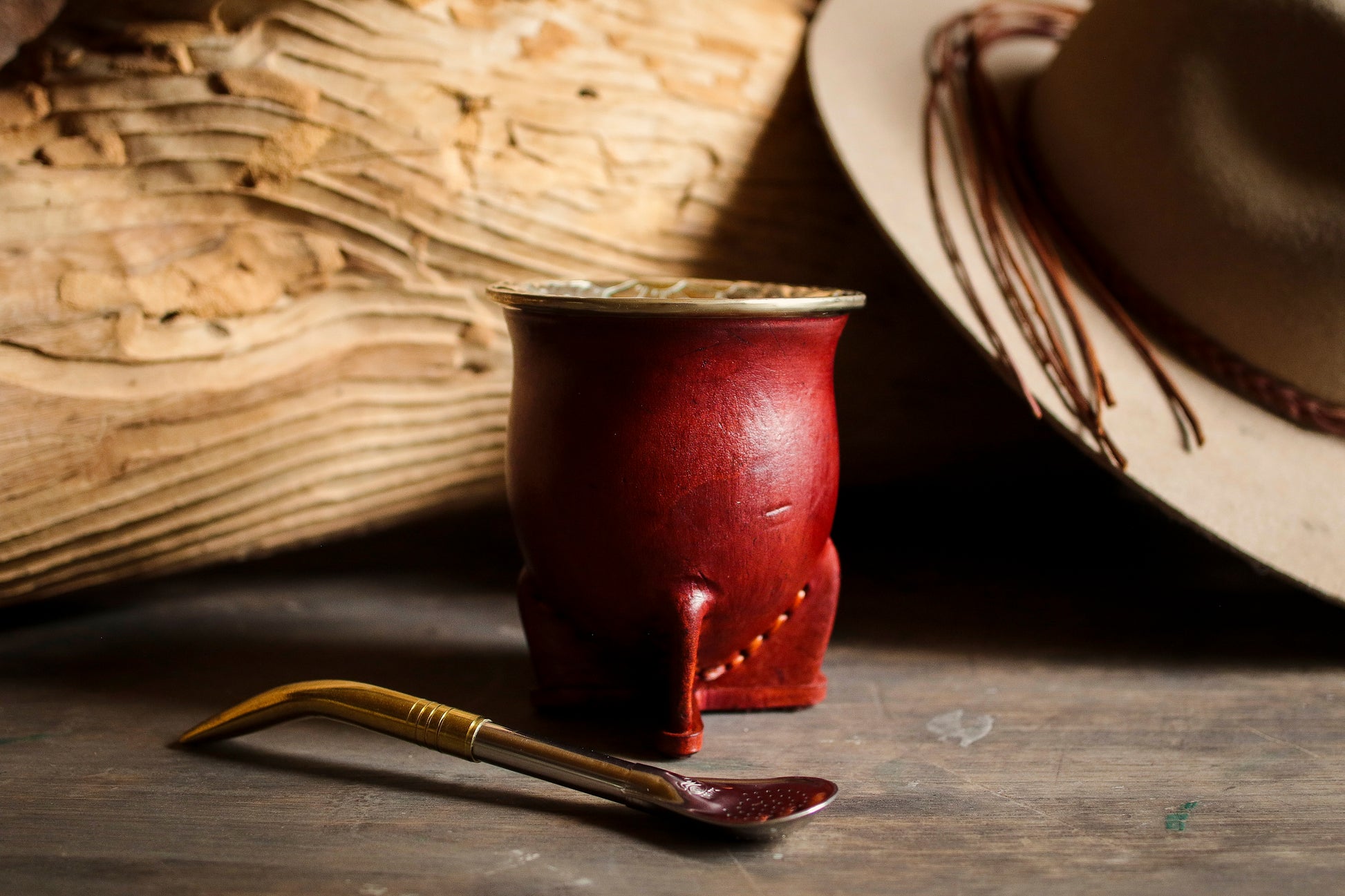 Mate de calabaza forrado artesanalmente en cuero natural.